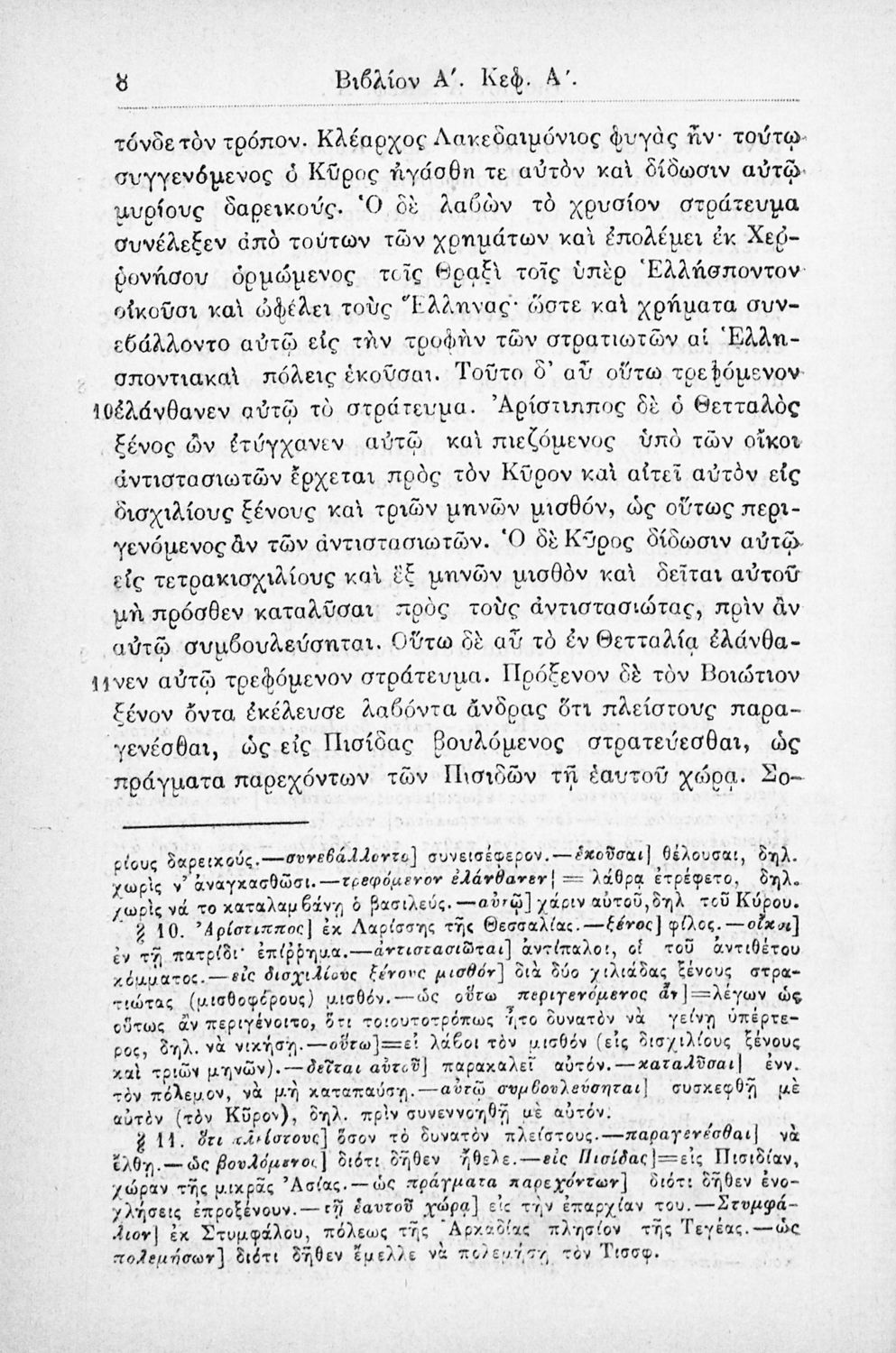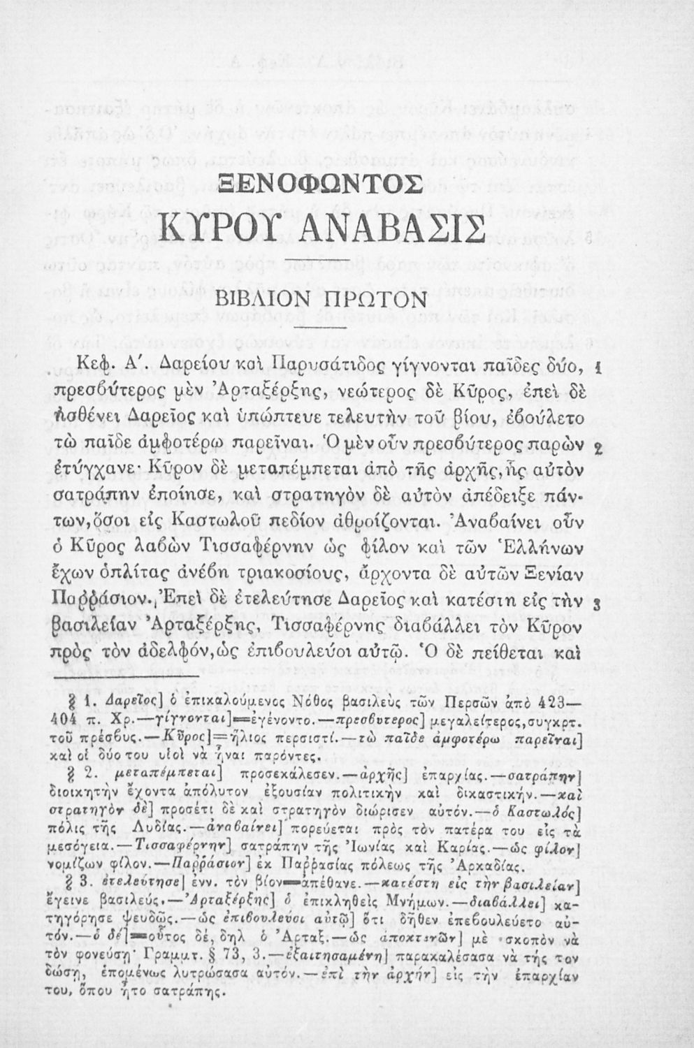 Σχολικό εγχειρίδιο Αρχαίων Ελληνικών για τα Ελληνικά Σχολεία και Παρθεναγωγεία που περιλαμβάνει αποσπάσματα από το έργο του Ξενοφώντα Κύρου Ανάβασις, εισαγωγικά σχόλια για τη ζωή και το έργο του, ερμηνευτικές ...