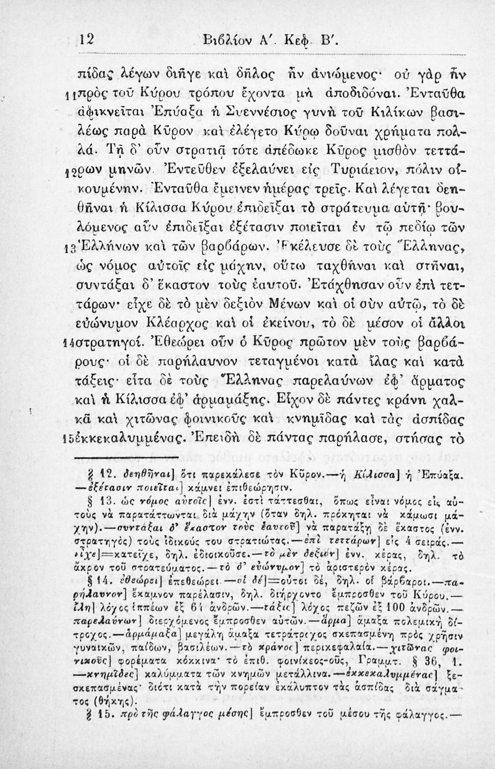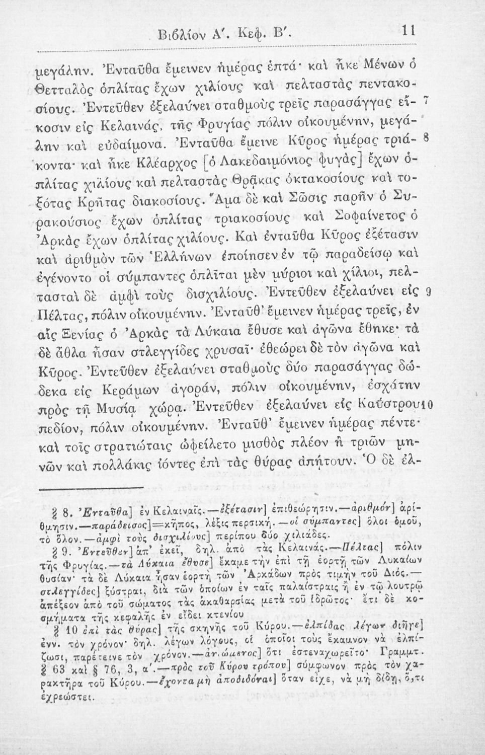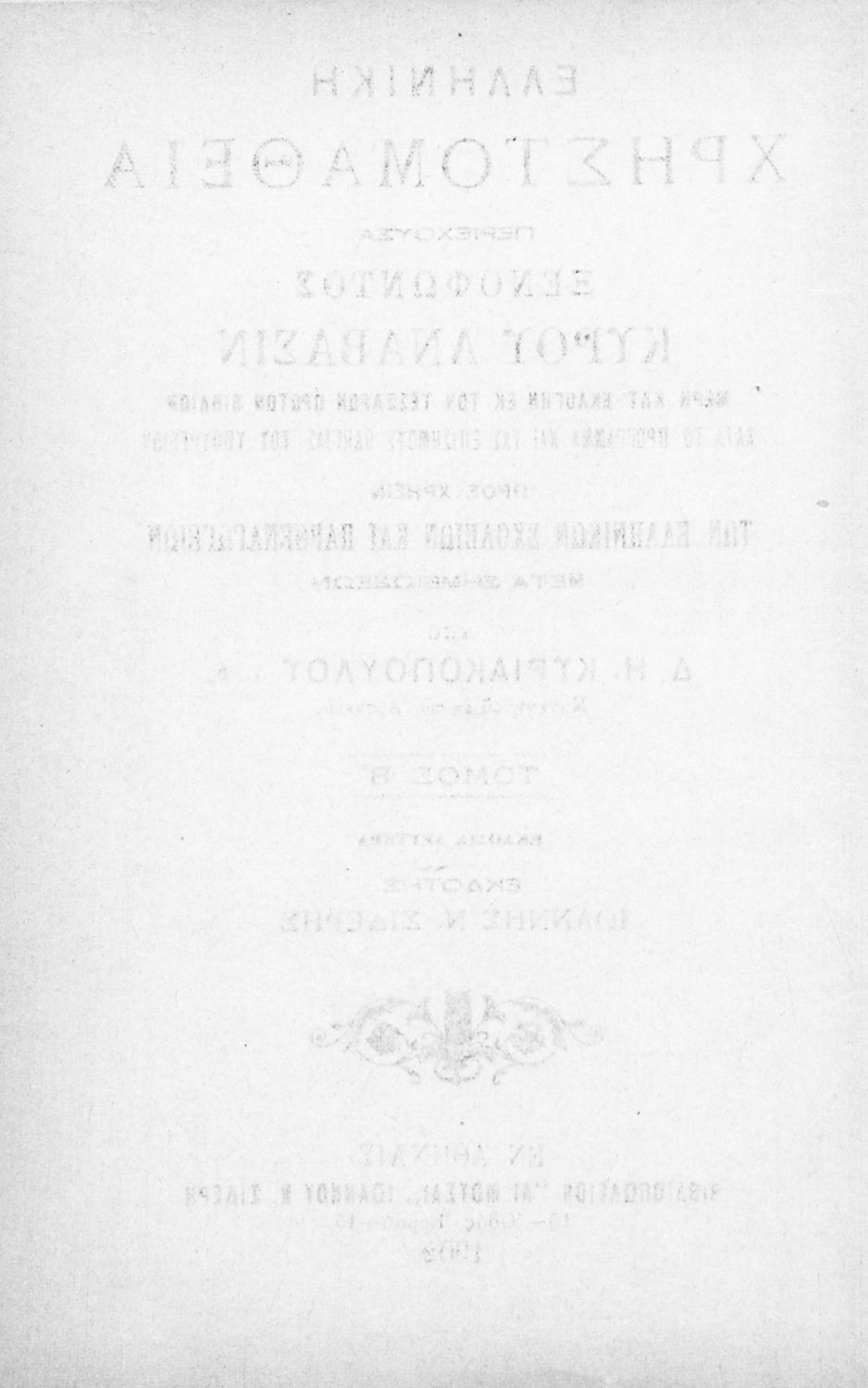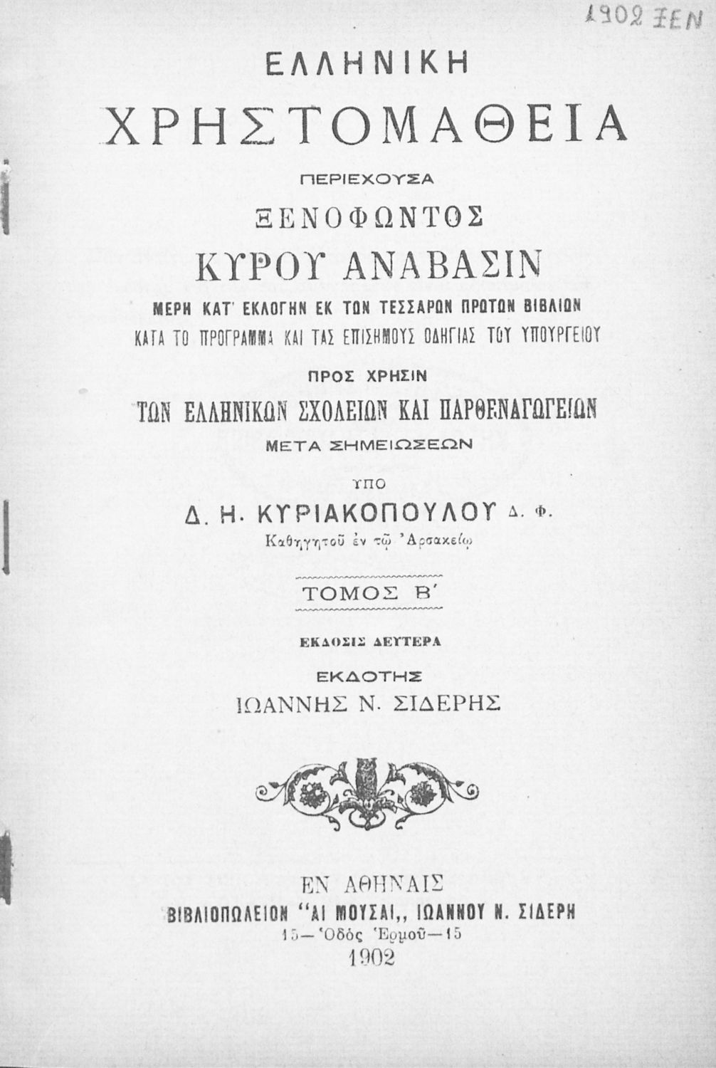 Ελληνική χρηστομάθεια περιέχουσα Ξενοφώντος Κύρου Ανάβασιν μέρη κατ΄ εκλογήν εκ των τεσσάρων πρώτων βιβλίων κατά το πρόγραμμα και τας επισήμους οδηγίας του Υπουργείου προς χρήσιν των Ελληνικών Σχολείων και Παρθεναγωγείων τόμος Β΄