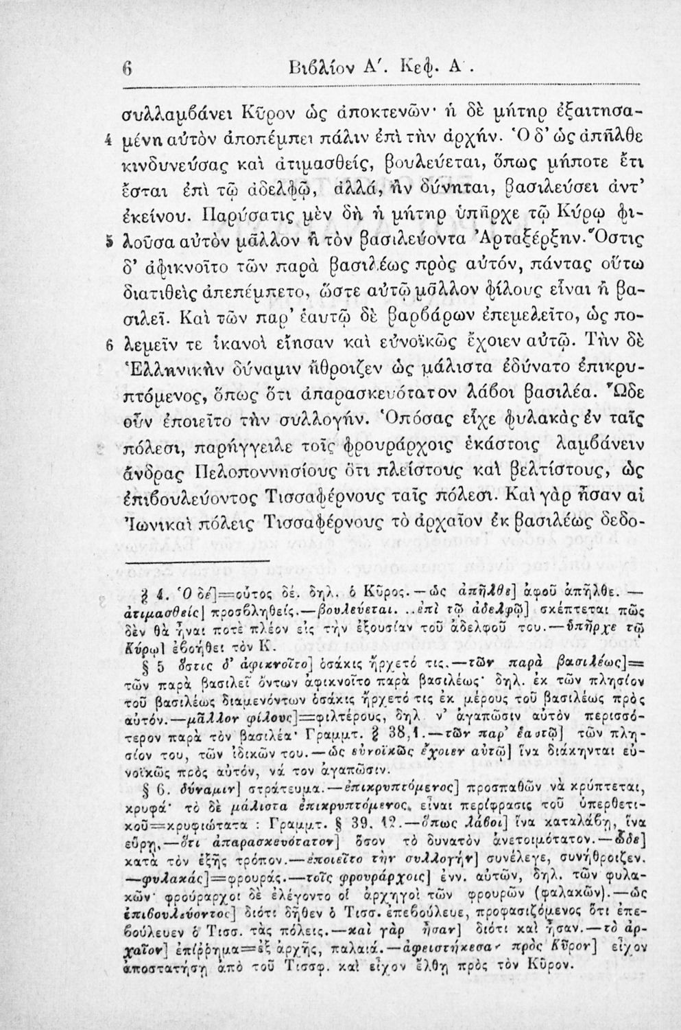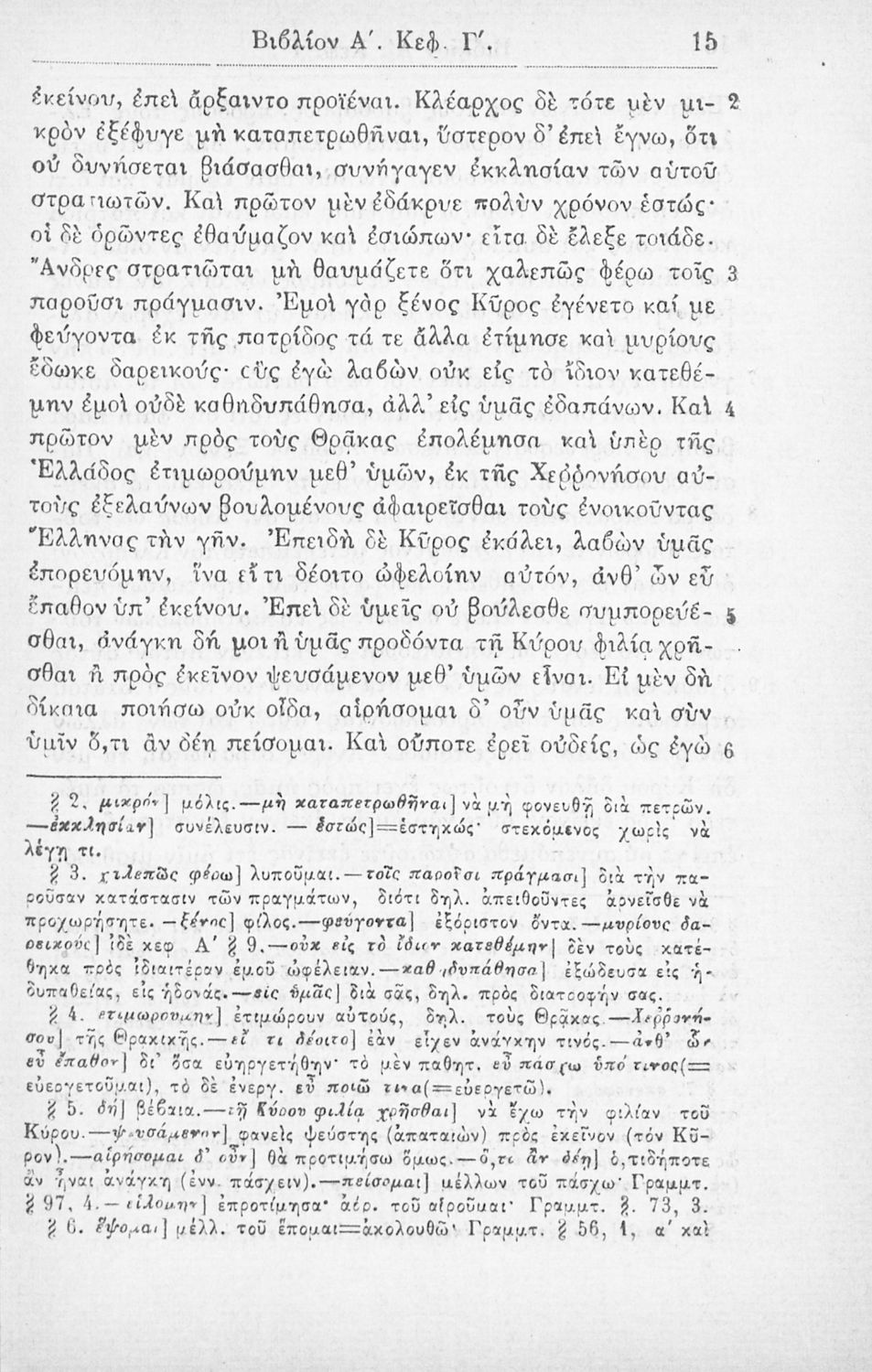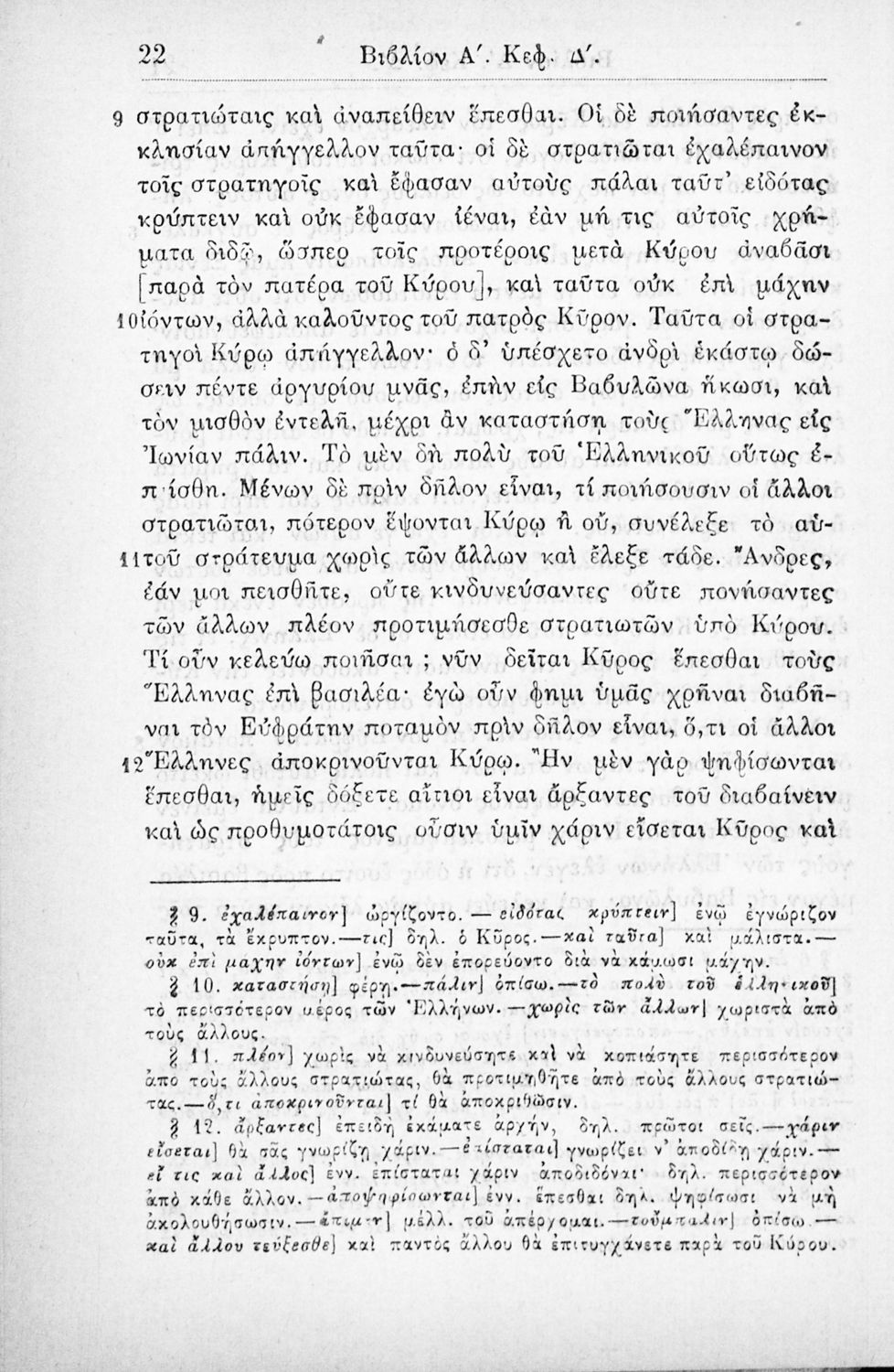 Σχολικό εγχειρίδιο Αρχαίων Ελληνικών για τα Ελληνικά Σχολεία και Παρθεναγωγεία που περιλαμβάνει αποσπάσματα από το έργο του Ξενοφώντα Κύρου Ανάβασις, και λεξικογραφικές παρατηρήσεις.