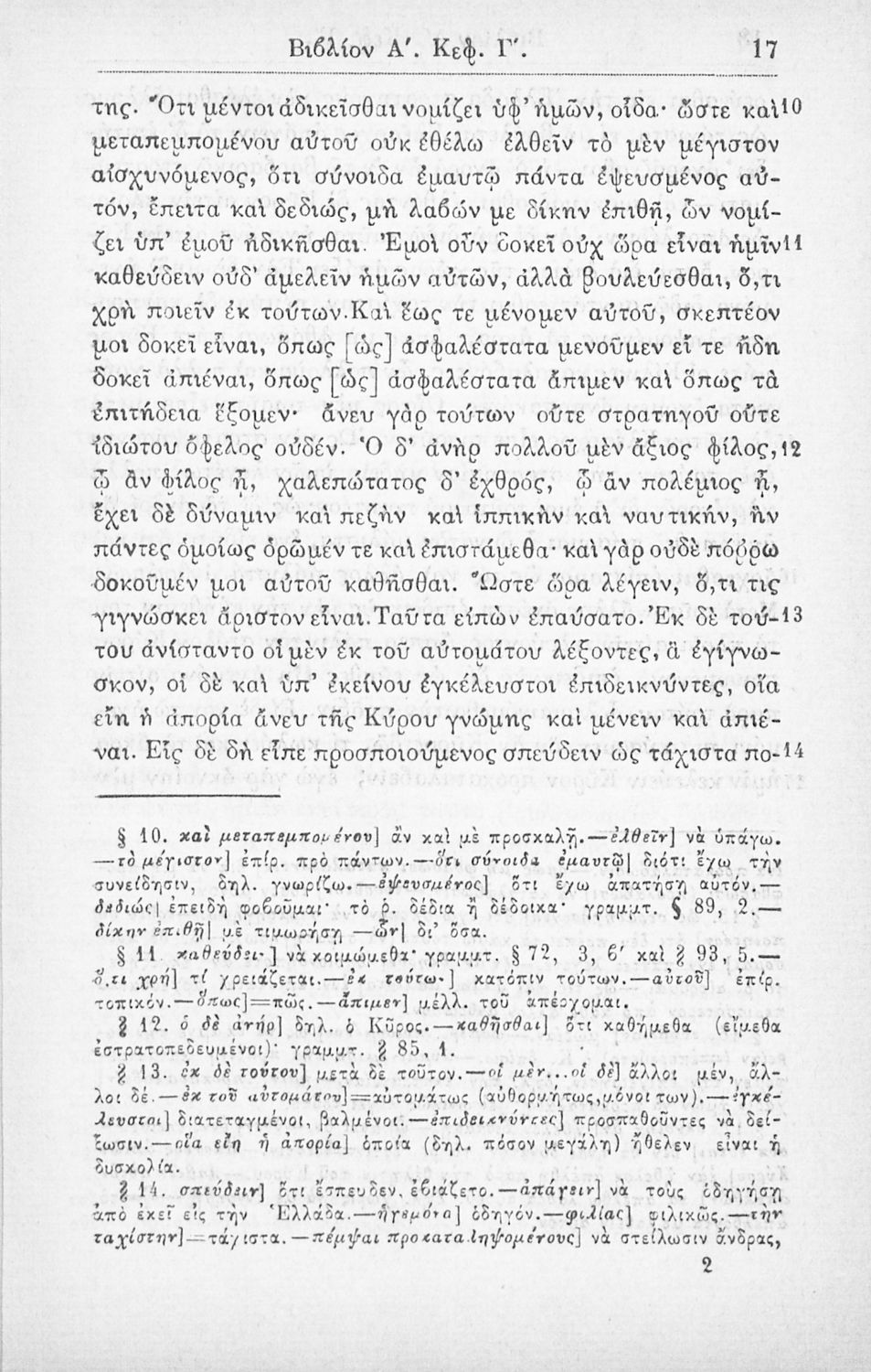 Σχολικό εγχειρίδιο Αρχαίων Ελληνικών Β' Ελληνικού Σχολείου που περιλαμβάνει αποσπάσματα από το έργο του Ξενοφώντα Κύρου Ανάβασις, ερμηνευτικές, γλωσσικές, γραμματικές και συντακτικές παρατηρήσεις, και ασκήσεις