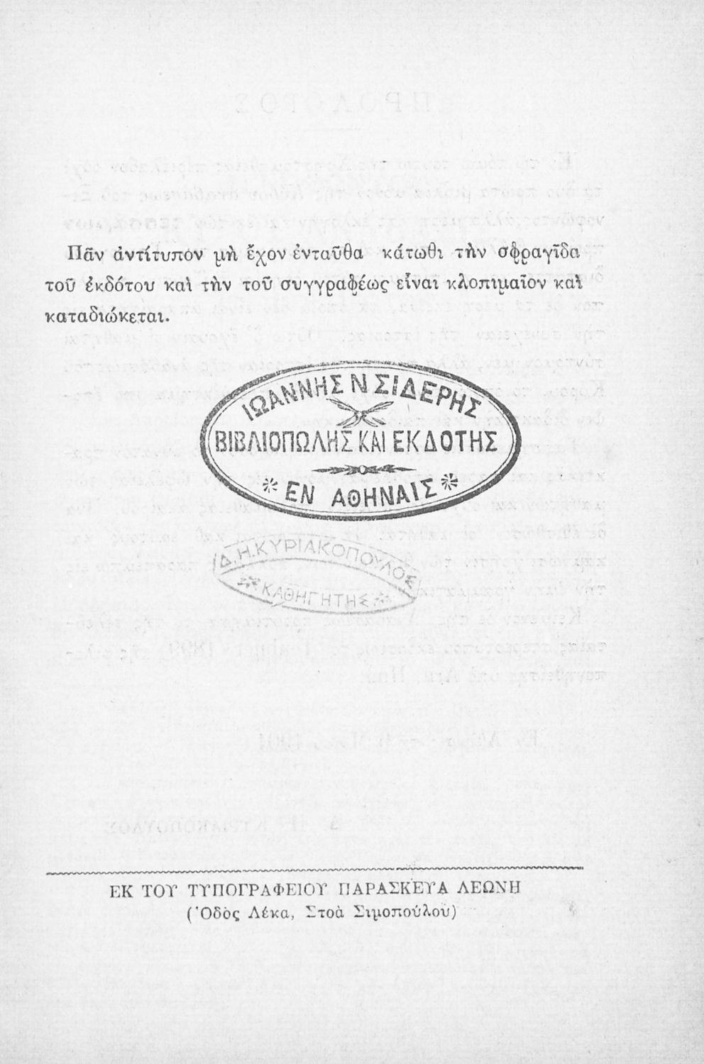 Εκδότης: Βιβλιοπωλείο ΑΙ "Μούσαι" Ιωάννη Ν.Σιδέρη