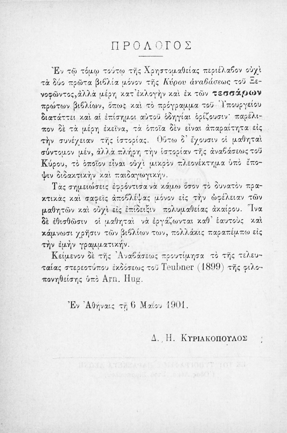 Σχολικό εγχειρίδιο Αρχαίων Ελληνικών για τα Ιερατικά Σχολεία. Ο τόμος περιέχει «..τεμάχια κατ’ εκλογήν εκ της Ξενοφώντος Κύρου Ανάβασεως και εκ των Γεωγραφικών και Εθνογραφικών Στράβωνος, Διοδώρου και άλλων, ...