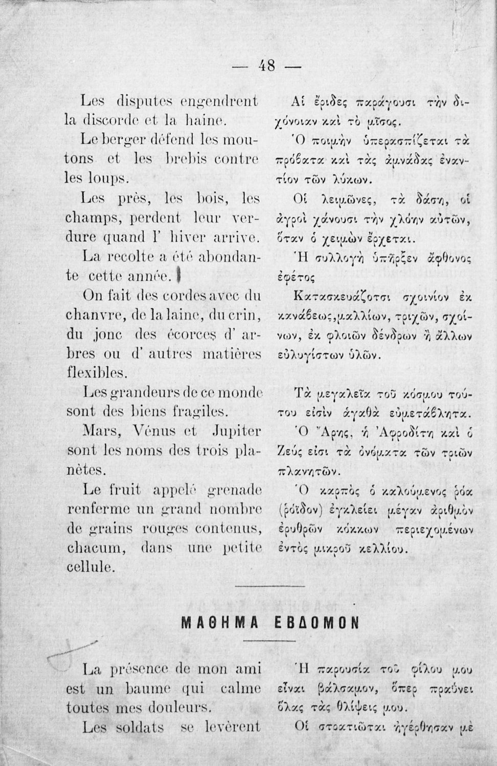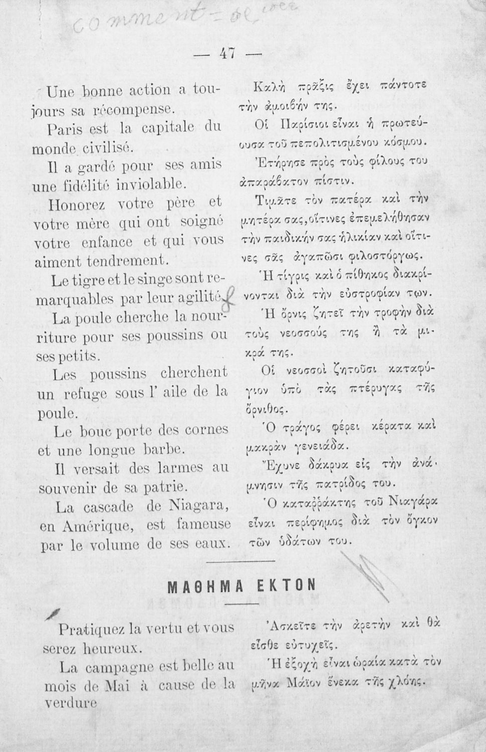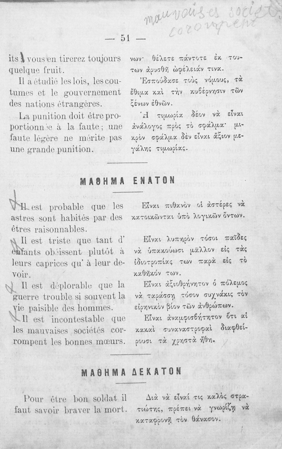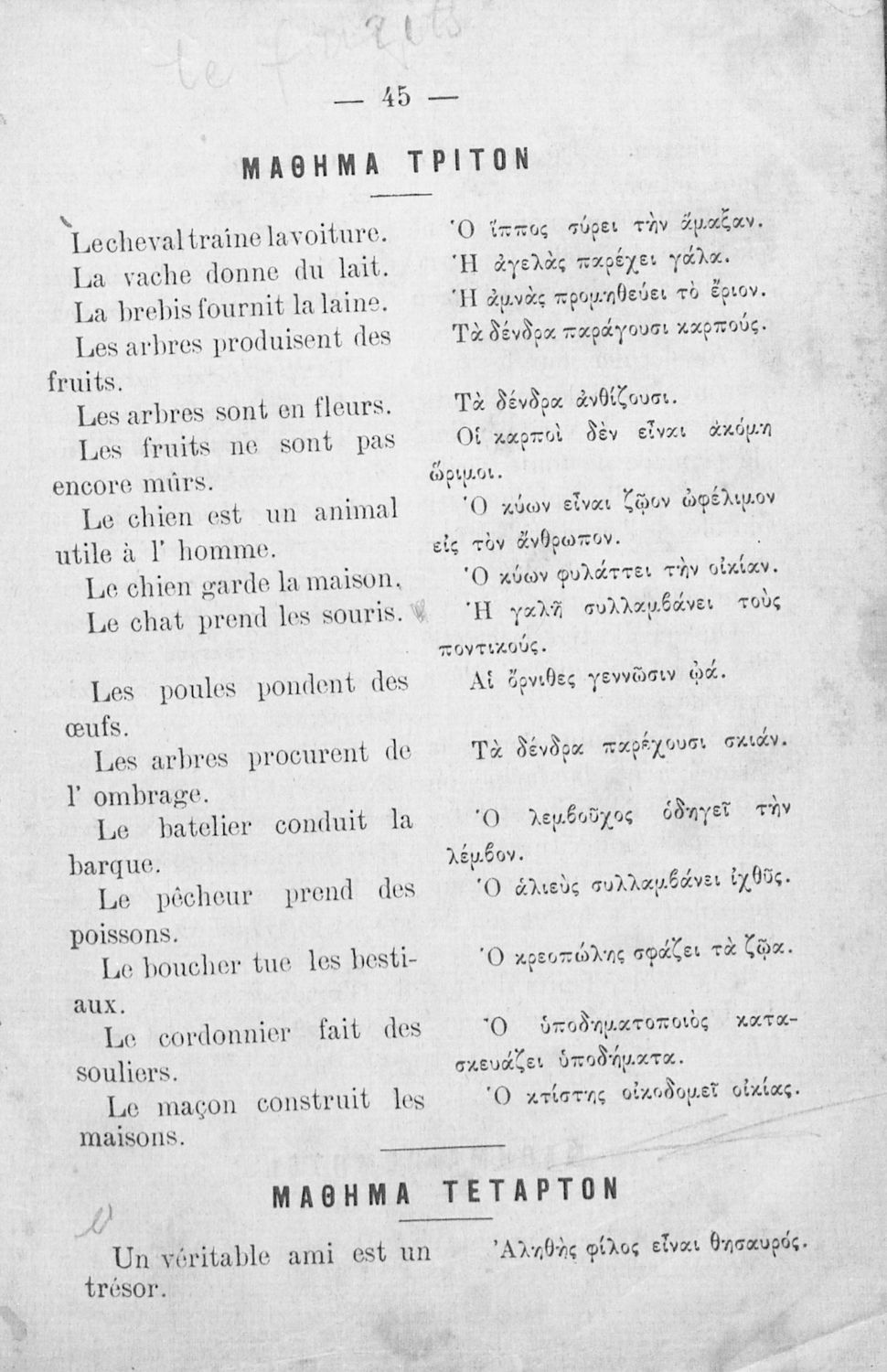 Αναγνωστικό Γαλλικών που περιλαμβάνει κείμενα στα γαλλικά και ελληνικά, θεωρία και λεξιλόγιο.