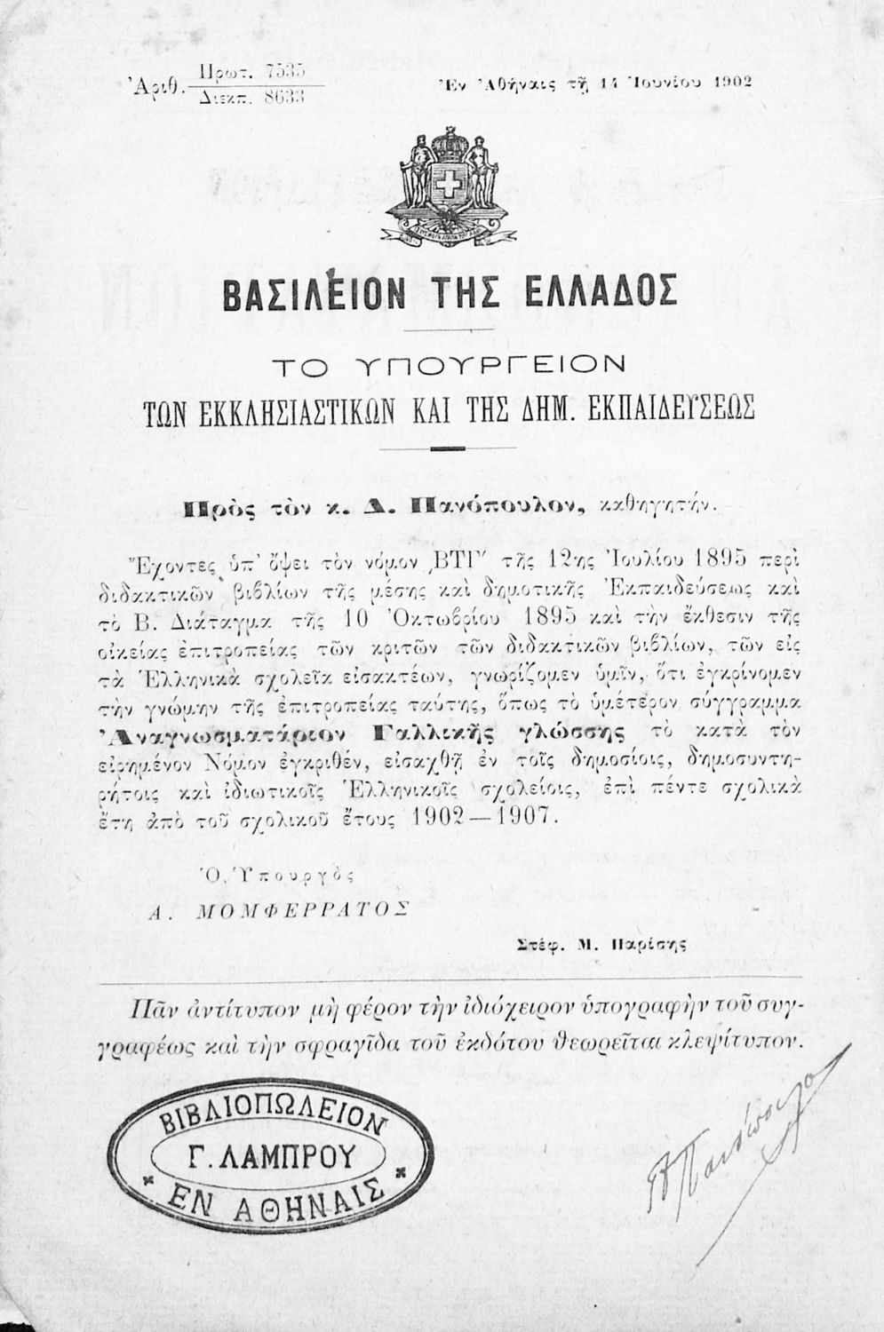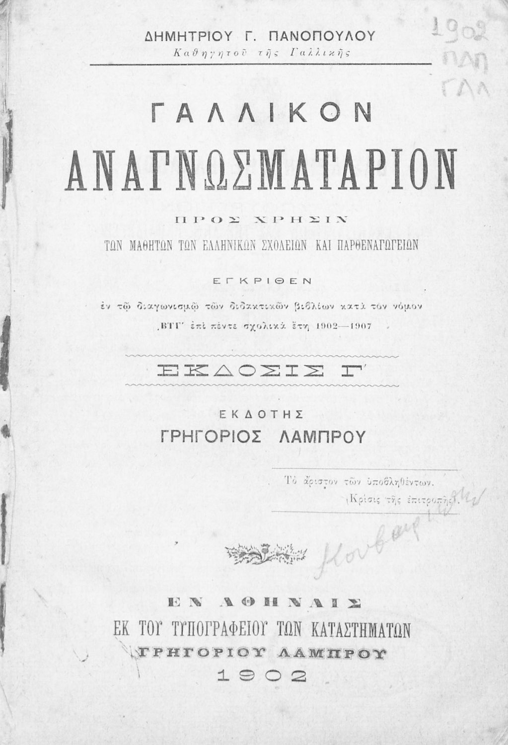 Εκδότης: Γρηγόριος Λάμπρου Έτος έκδοσης: 1902 Τόπος έκδοσης: Αθήνα Έκδοση: 3η Υπουργική απόφαση / Σύμβαση: 7535/14-6-1902 |