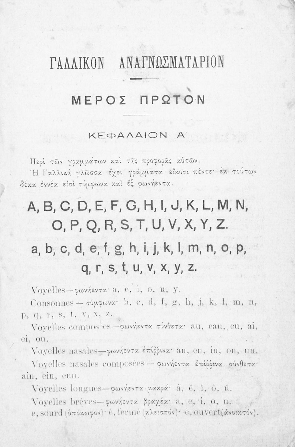 Αναγνωστικό Γαλλικών που περιλαμβάνει κείμενα στα γαλλικά και ελληνικά, θεωρία και λεξιλόγιο.