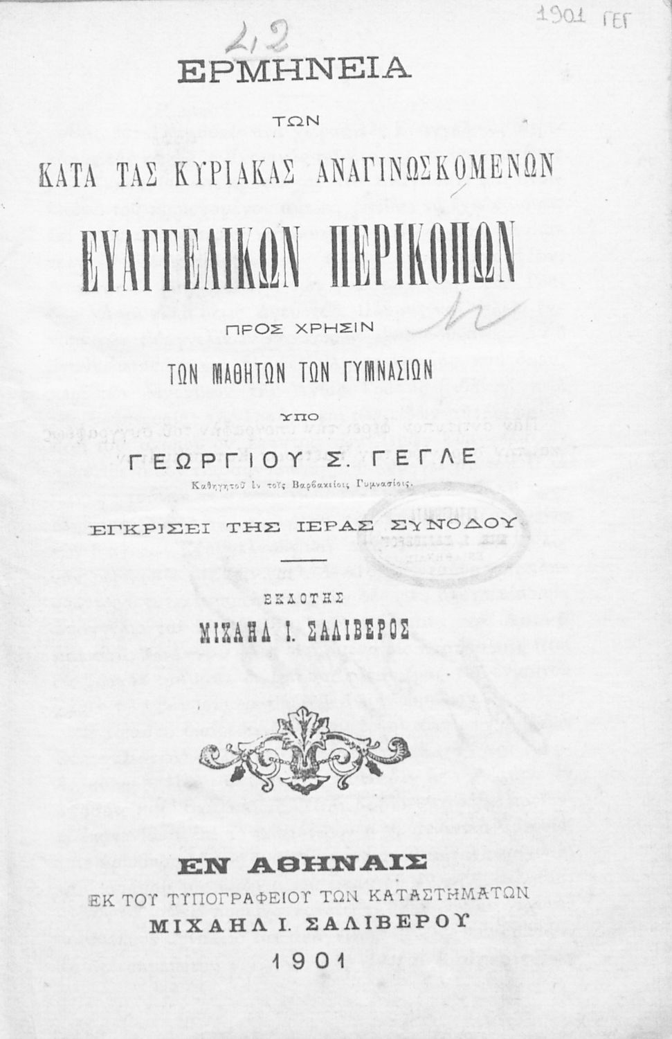 Εκδότης: Μιχαήλ Ι. Σαλίβερος Έτος έκδοσης: 1901 Τόπος έκδοσης: Αθήνα |