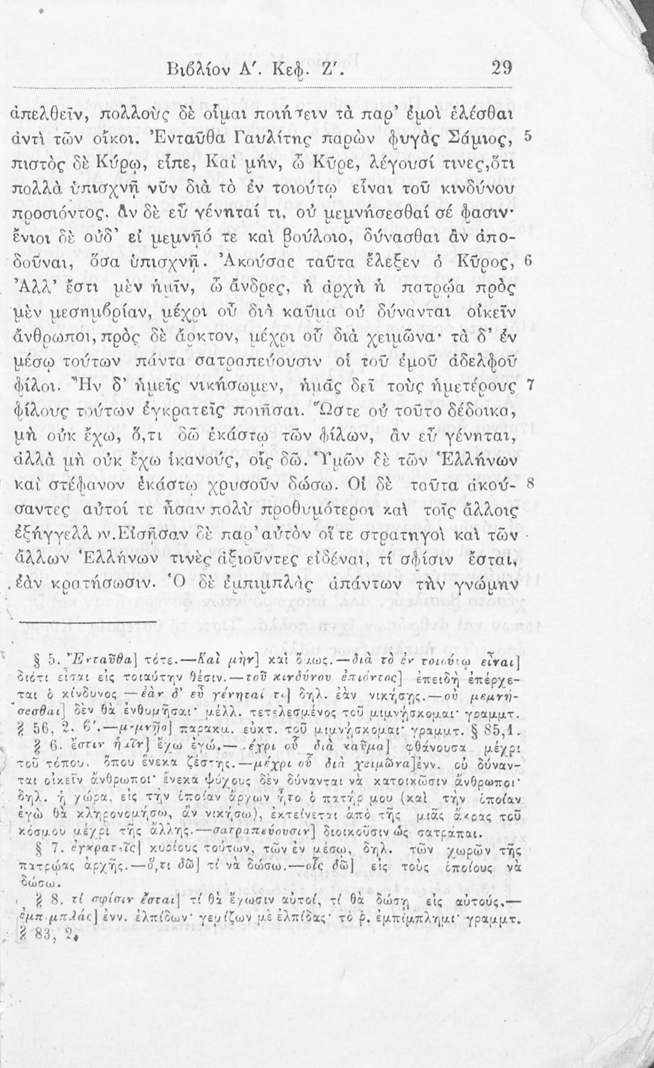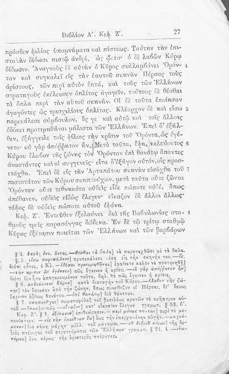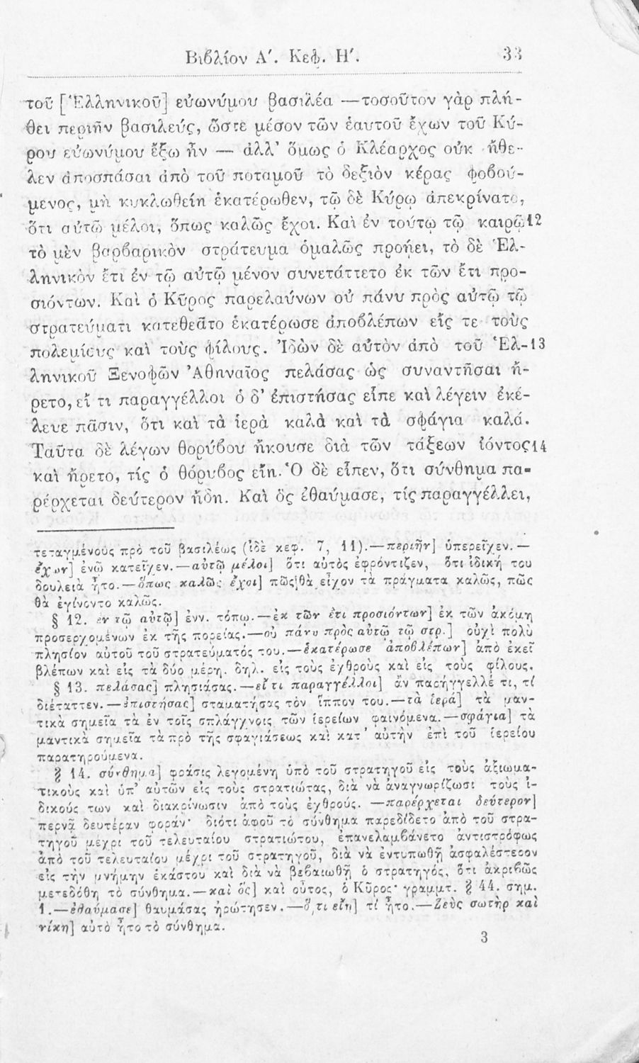 Σχολικό εγχειρίδιο Αρχαίων Ελληνικών για τα Ελληνικά Σχολεία και Παρθεναγωγεία που περιλαμβάνει αποσπάσματα από τα έργα του Ξενοφώντα Ελληνικά και Κύρου Παιδεία και λεξικολογικές παρατηρήσεις.