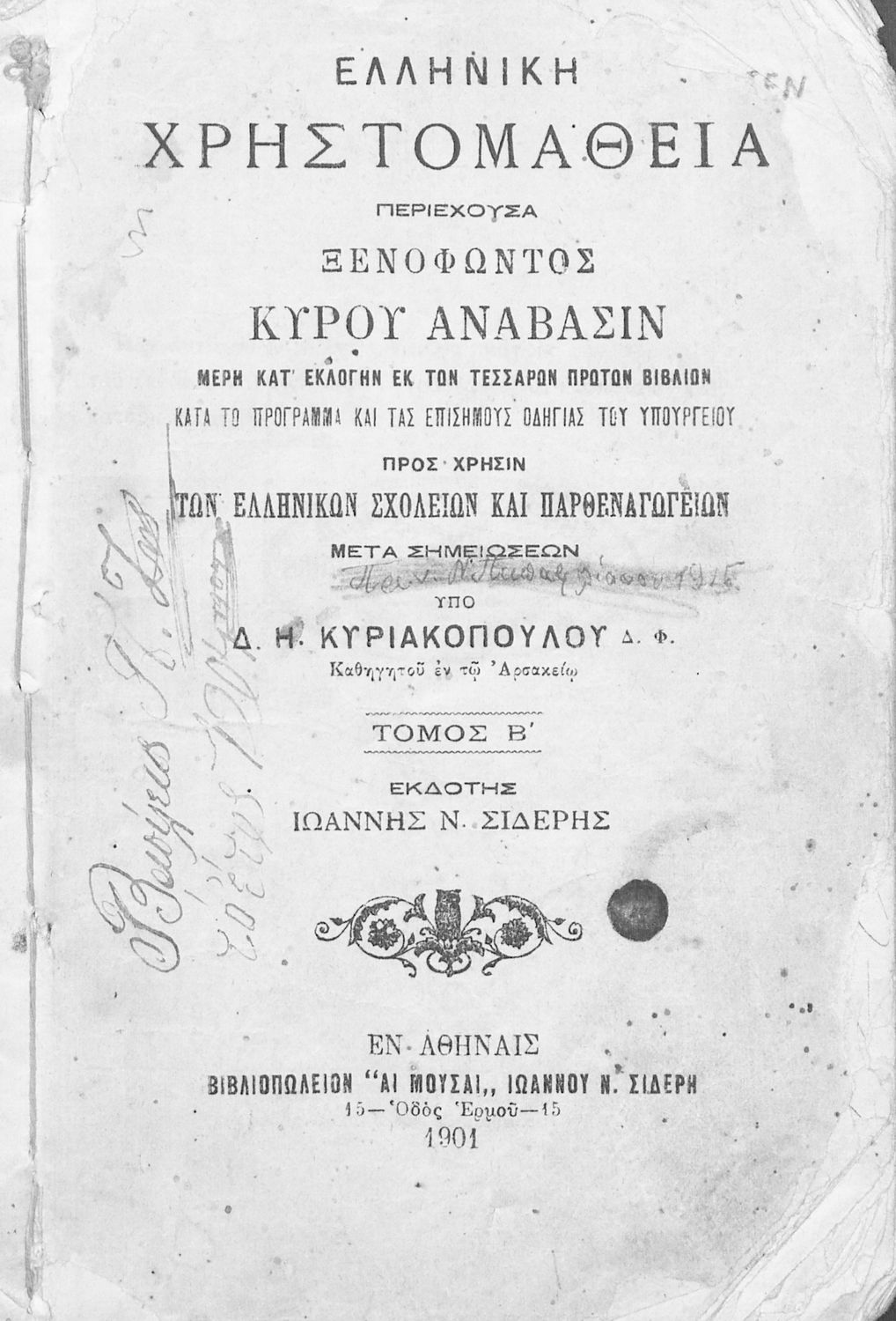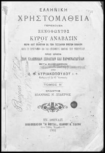 Ελληνική χρηστομάθεια τόμος Β΄ -τεύχος Β΄ περιέχουσα Ξενοφώντος Κύρου Ανάβασιν βιβλίον Γ΄ και Δ΄ προς χρήσιν των Ελληνικών Σχολείων και των Παρθεναγωγείων μετά σημειώσεων ερμηνευτικών, ιστορικών και παιδαγωγικών