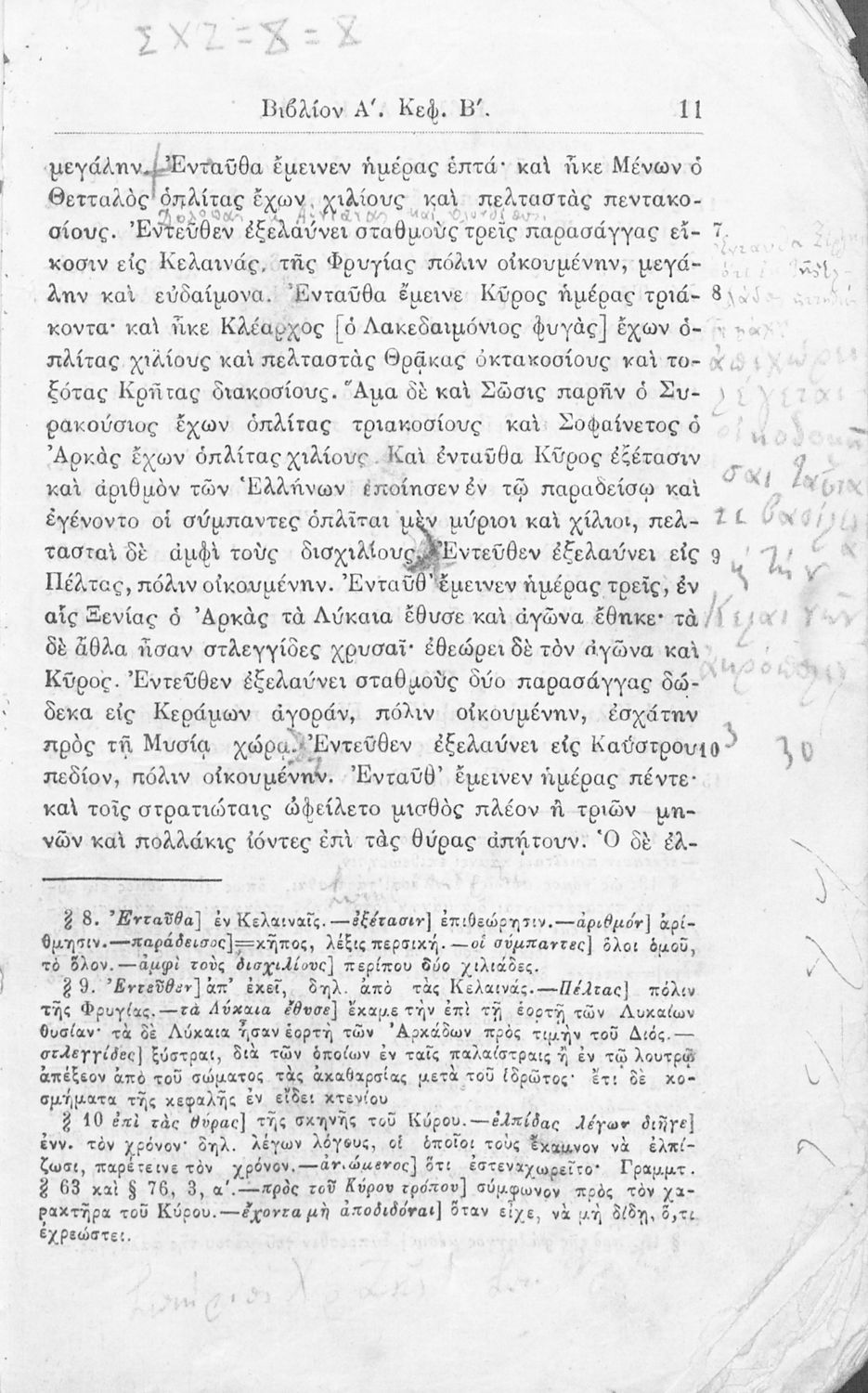 Σχολικό εγχειρίδιο Αρχαίων Ελληνικών για τα Ελληνικά Σχολεία και Παρθεναγωγεία που περιλαμβάνει αποσπάσματα από τα έργα του Ξενοφώντα Ελληνικά και Κύρου Παιδεία και λεξικολογικές παρατηρήσεις.