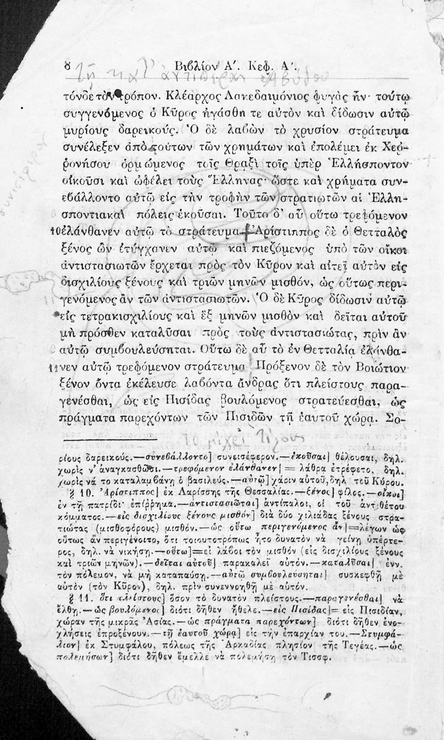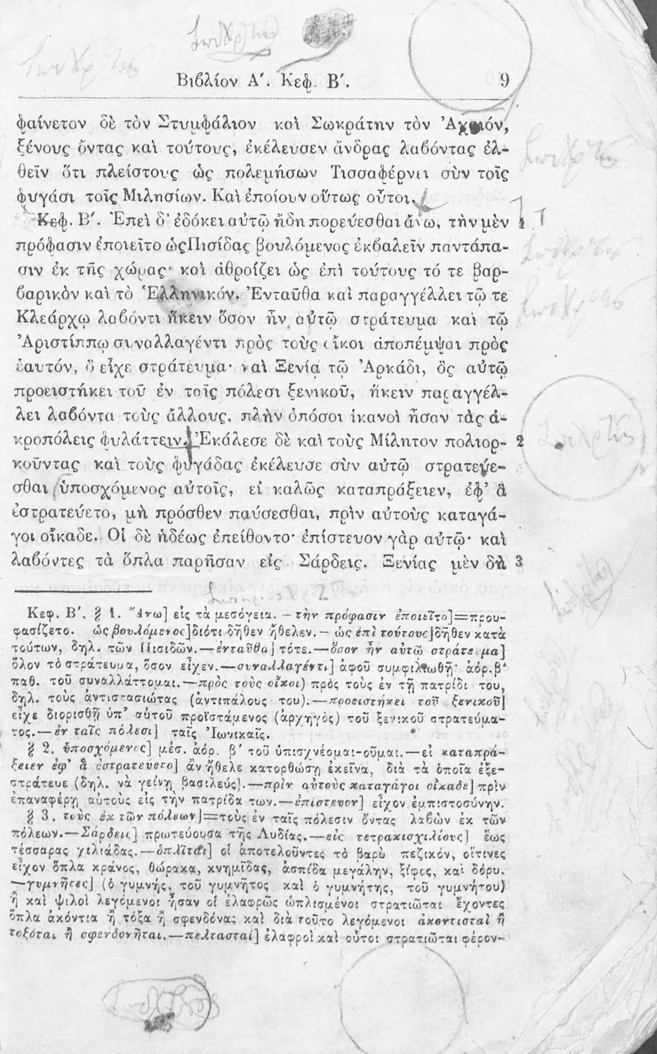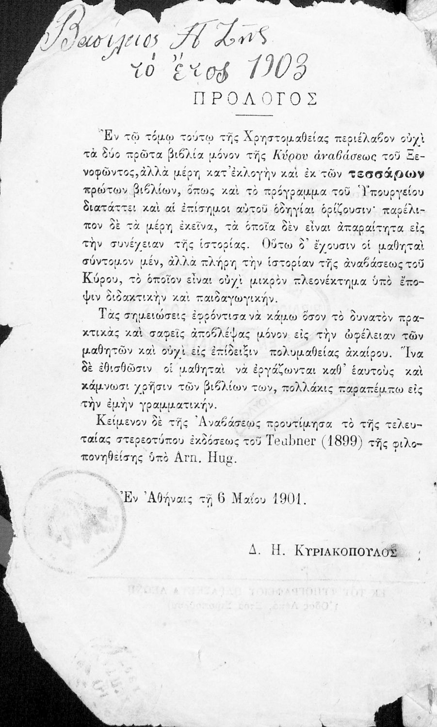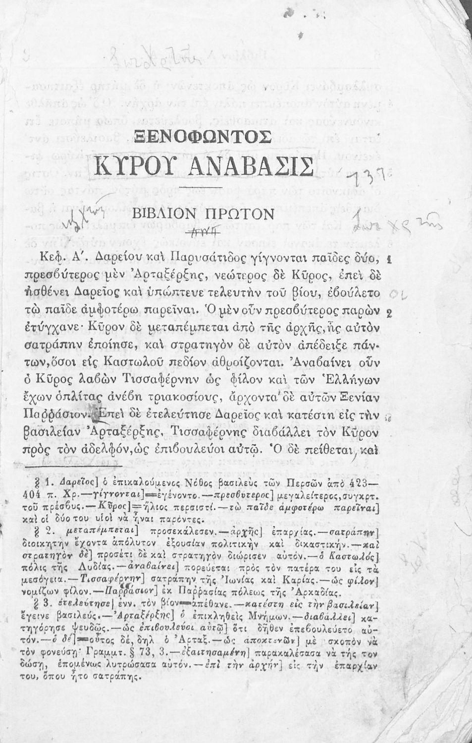 Σχολικό εγχειρίδιο Αρχαίων Ελληνικών για τα Ελληνικά Σχολεία και Παρθεναγωγεία που περιέχει αποσπάσματα από τα έργα του Ξενοφώντα Ελληνικά (βιβλία Α΄ και Β΄ ) και Κύρου Παιδεία, σημειώσεις και ερμηνευτικά ...