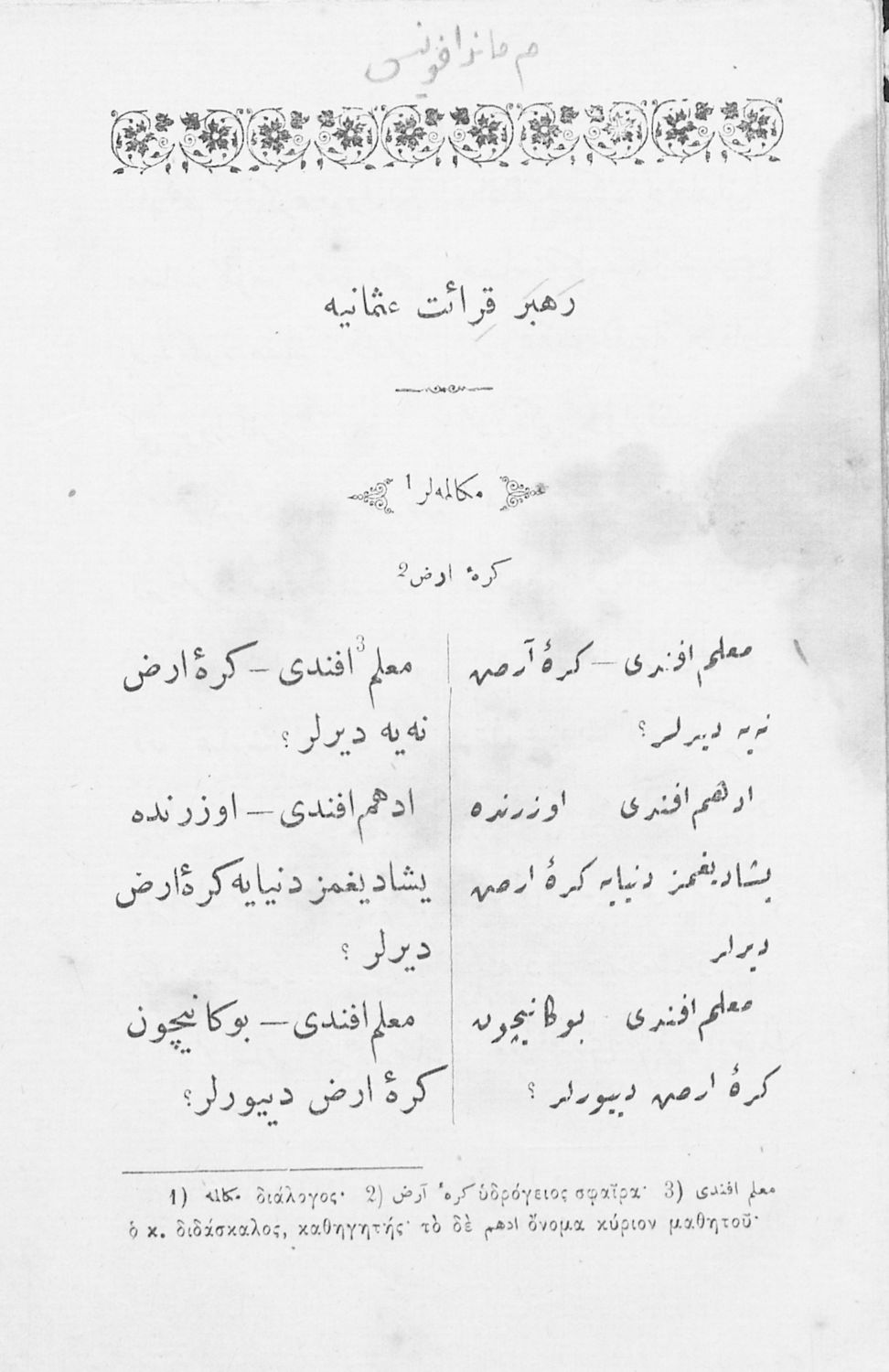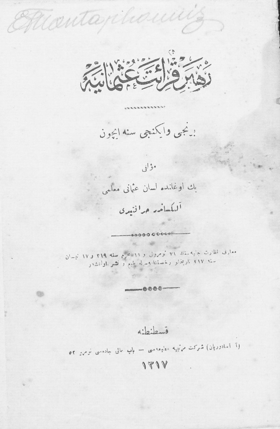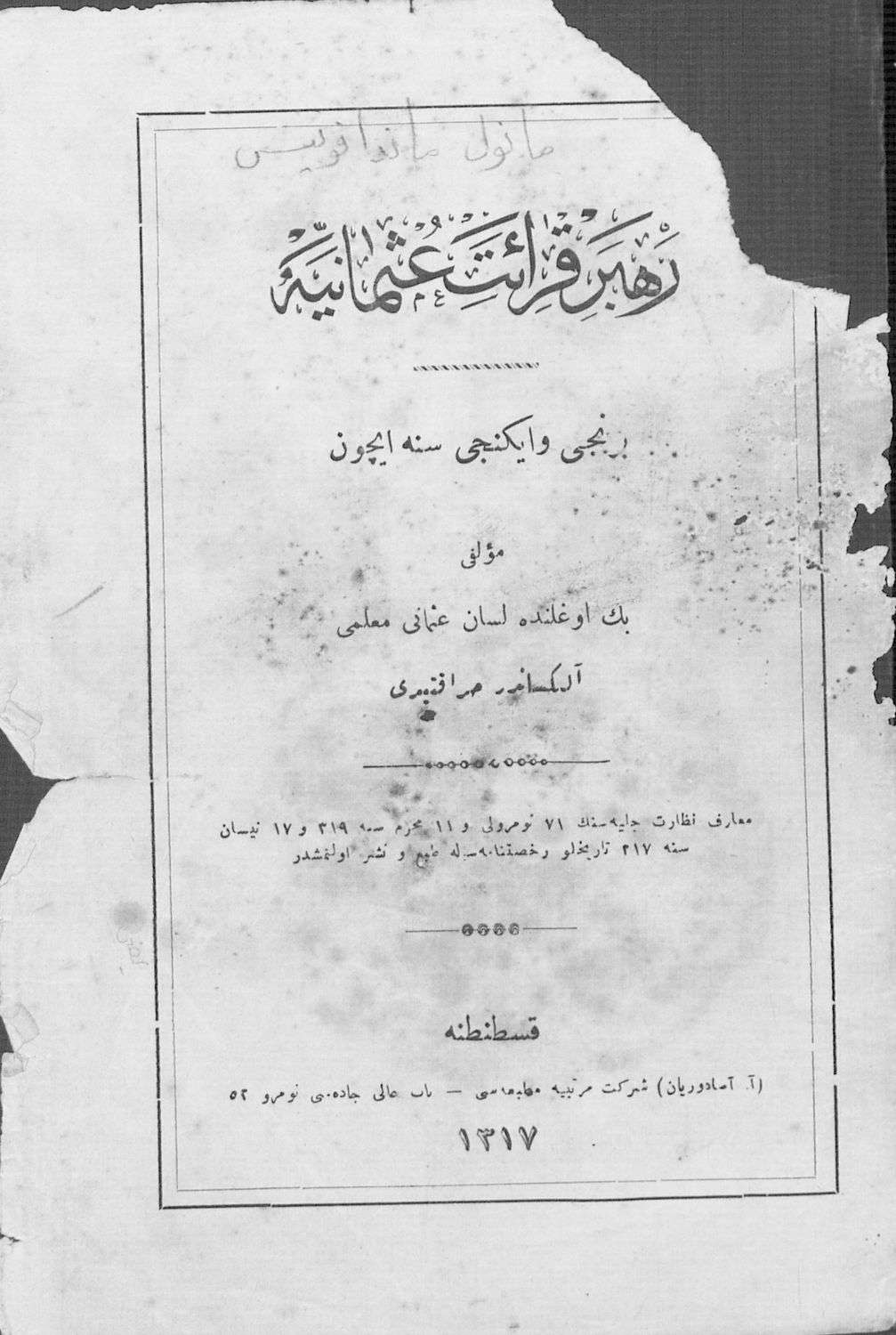 Οδηγός της οθωμανικής αναγνώσεως, δια το πρώτον και δεύτερον έτος, προς χρήσιν της ομογενούς νεολαίας, αδεία του Υπουργείου της Δημοσίας Εκπαιδεύσεως