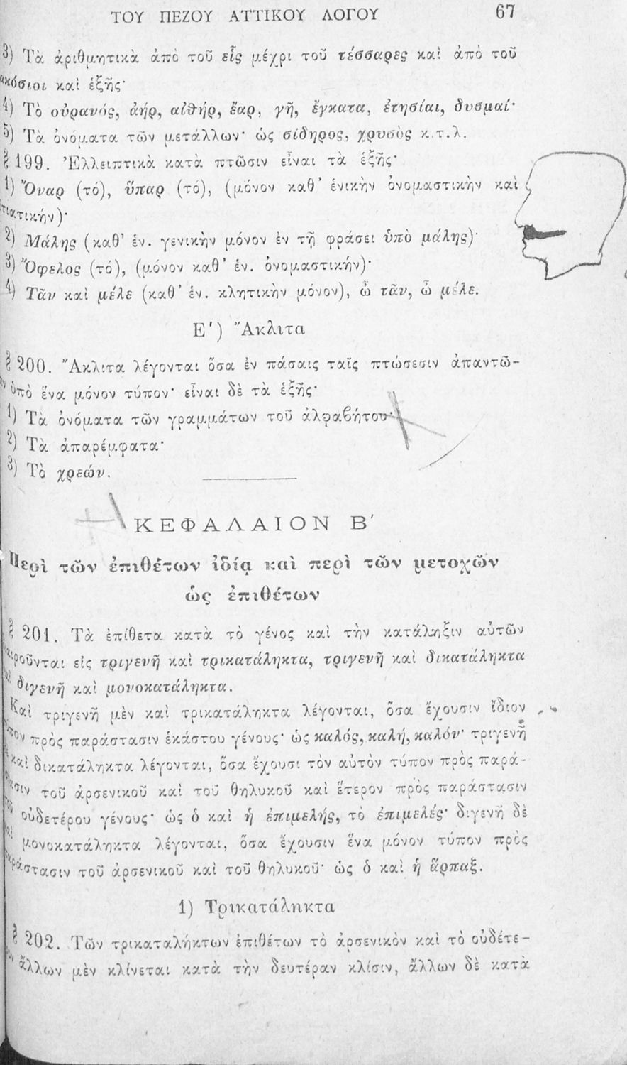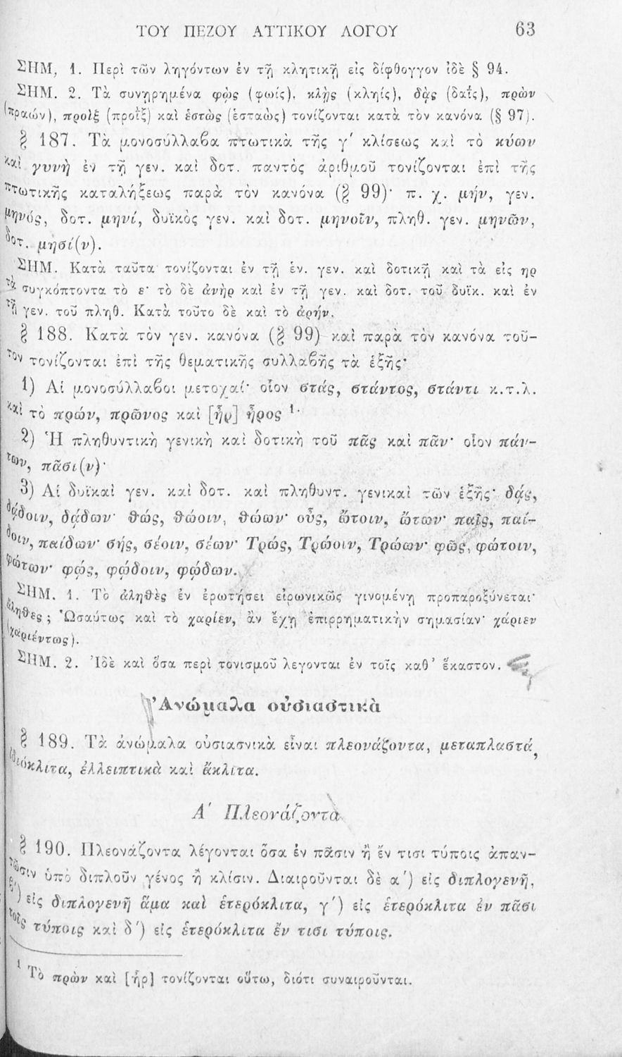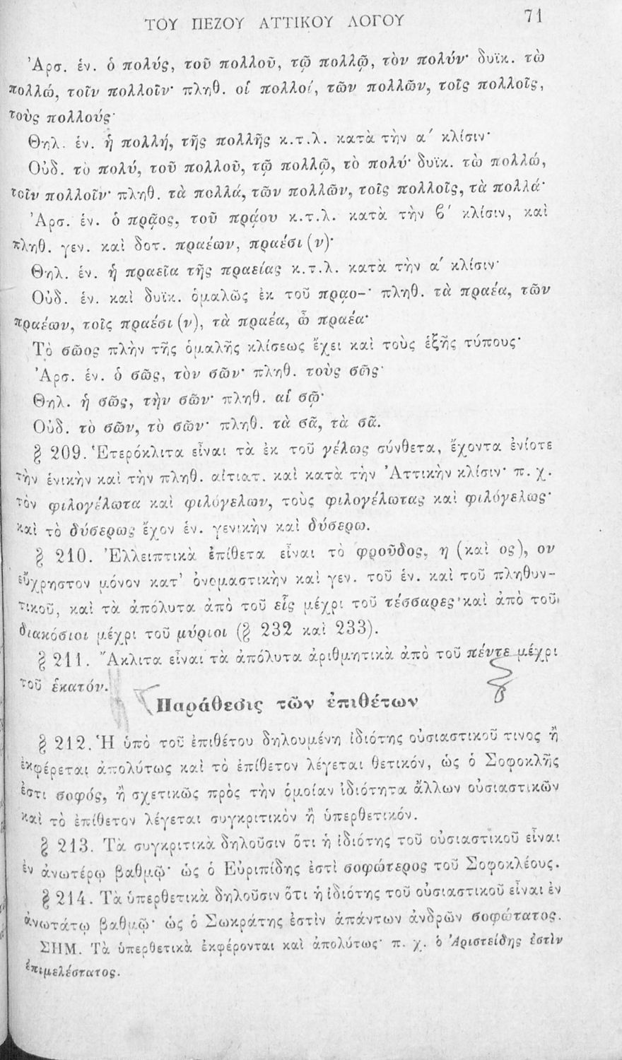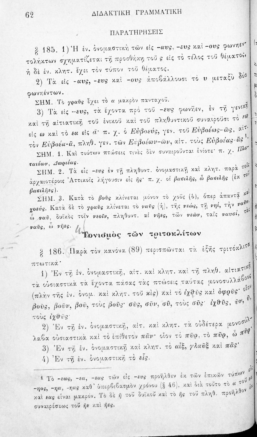 Σχολικό εγχειρίδιο Αρχαίων Ελληνικών για τα Ελληνικά Σχολεία, Παρθεναγωγεία και Γυμνάσια που περιέχει τους κανόνες γραμματικής και είναι χωρισμένο σε φθογγολογικό, τυπολογικό και ετυμολογικό μέρος.