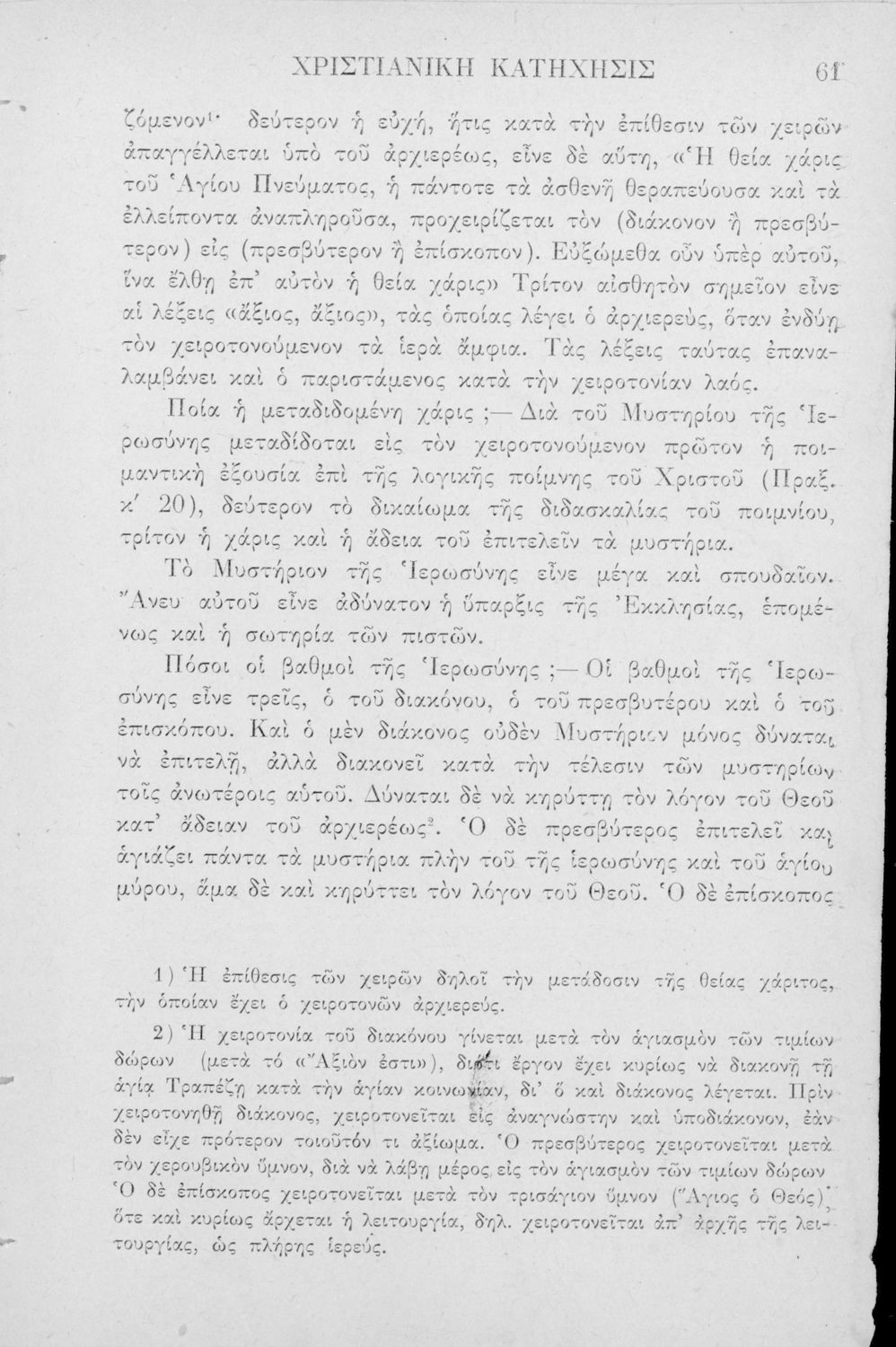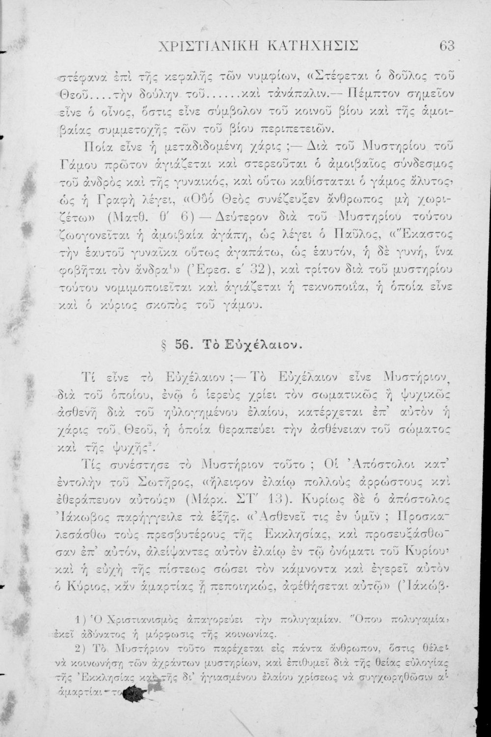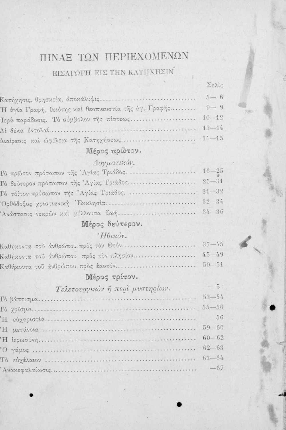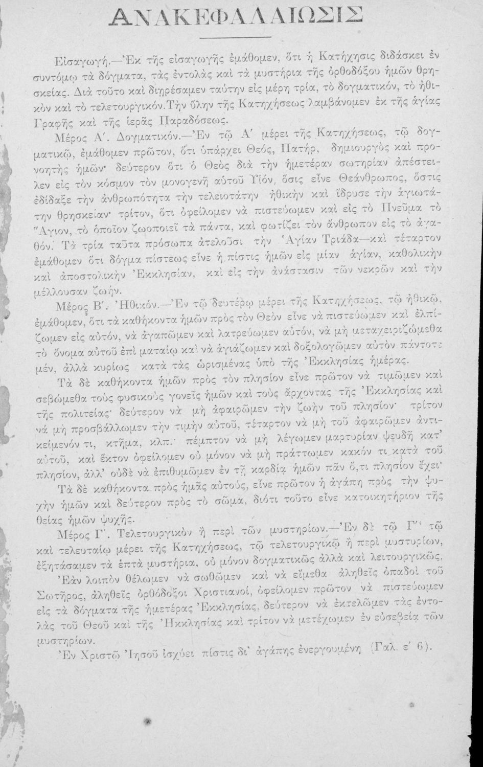Σχολικό εγχειρίδιο για τις τάξεις του Ελληνικού για το μάθημα των Θρησκευτικών. Το εγχειρίδιο περιλαμβάνει εισαγωγικά τους ορισμούς της κατήχησης, τα ιερά βιβλία της χριστιανικής εκκλησίας, τις δέκα εντολές. Ο κύριος κορμός του βιβλίου αποτελείται από το δογματικό, δηλαδή τα πρόσωπα της Αγίας Γραφής, το ηθικό μέρος, δηλαδή τα καθήκοντα του πιστού χριστιανού και το τελετουργικό μέρος της κατήχησης, το οποίο απαρτίζεται από τα 7 θεία μυστήρια.