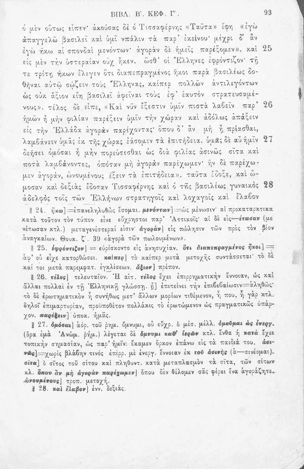 Σχολικό εγχειρίδιο Αρχαίων Ελληνικών Γ' Ελληνικού Σχολείου που περιλαμβάνει γραμματική της αρχαίας ελληνικής, αποσπάσματα από το έργο του Ξενοφώντα Ελληνικά και τα έργα του Λουκιανού Ενύπνιον και Ανάχαρσις, ...