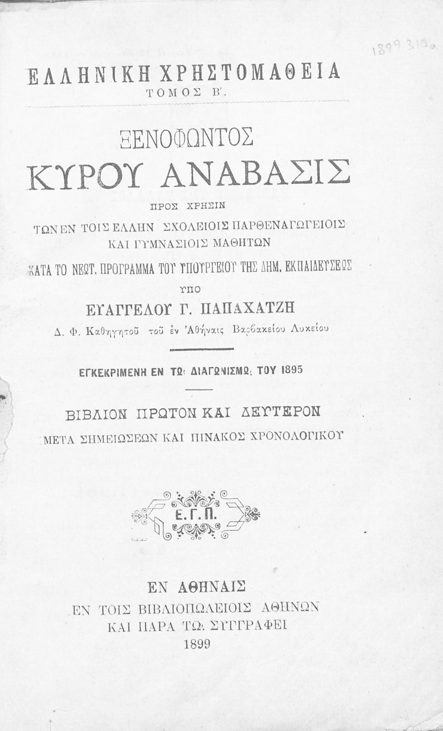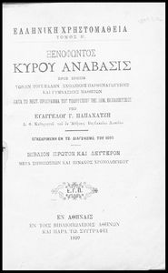 Σχολικό εγχειρίδιο Αρχαίων Ελληνικών για τα Ελληνικά Σχολεία, Γυμνάσια και Παρθεναγωγεία που περιλαμβάνει αποσπάσματα από το έργο του Ξενοφώντα Κύρου Ανάβασις, και λεξικογραφικές παρατηρήσεις.