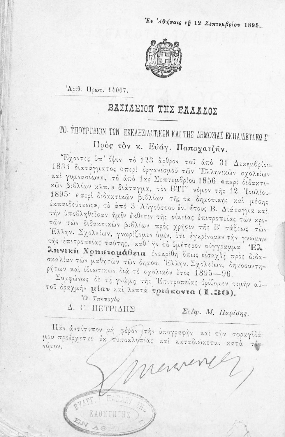 Εκδότης: Ε.Γ.Π. Έτος έκδοσης: 1899 Τόπος έκδοσης: Αθήνα Υπουργική απόφαση / Σύμβαση: 14007/12-9-1895 |