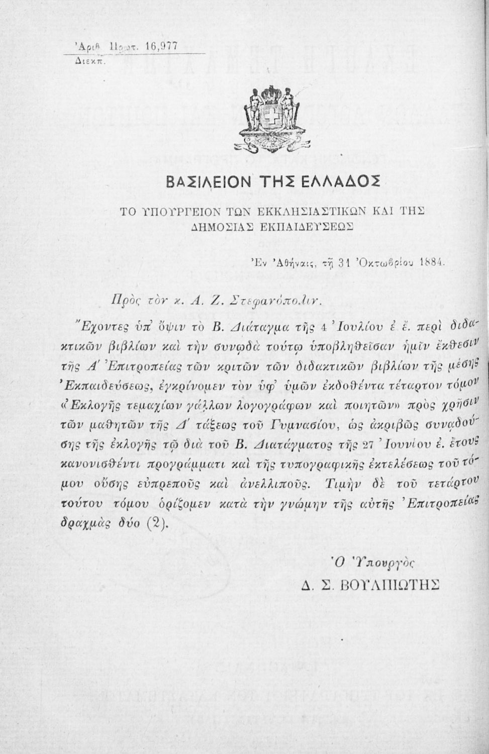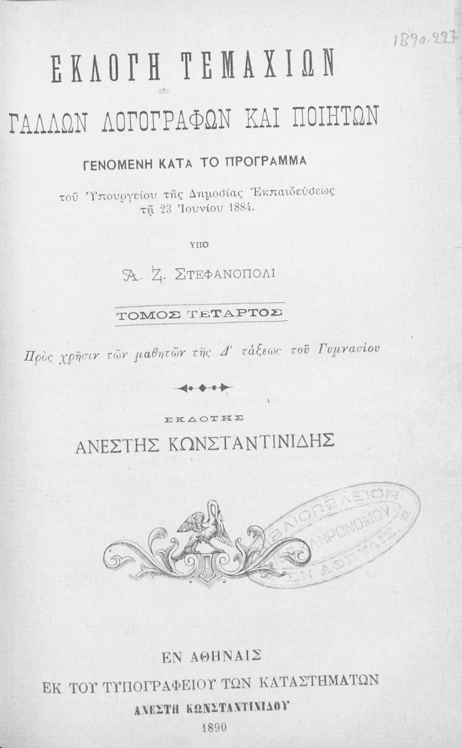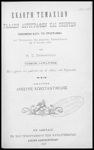 Εκδότης: Ανέστης Κωνσταντινίδης Έτος έκδοσης: 1890 Τόπος έκδοσης: Αθήνα Υπουργική απόφαση / Σύμβαση: 16977/31-10-1884 |