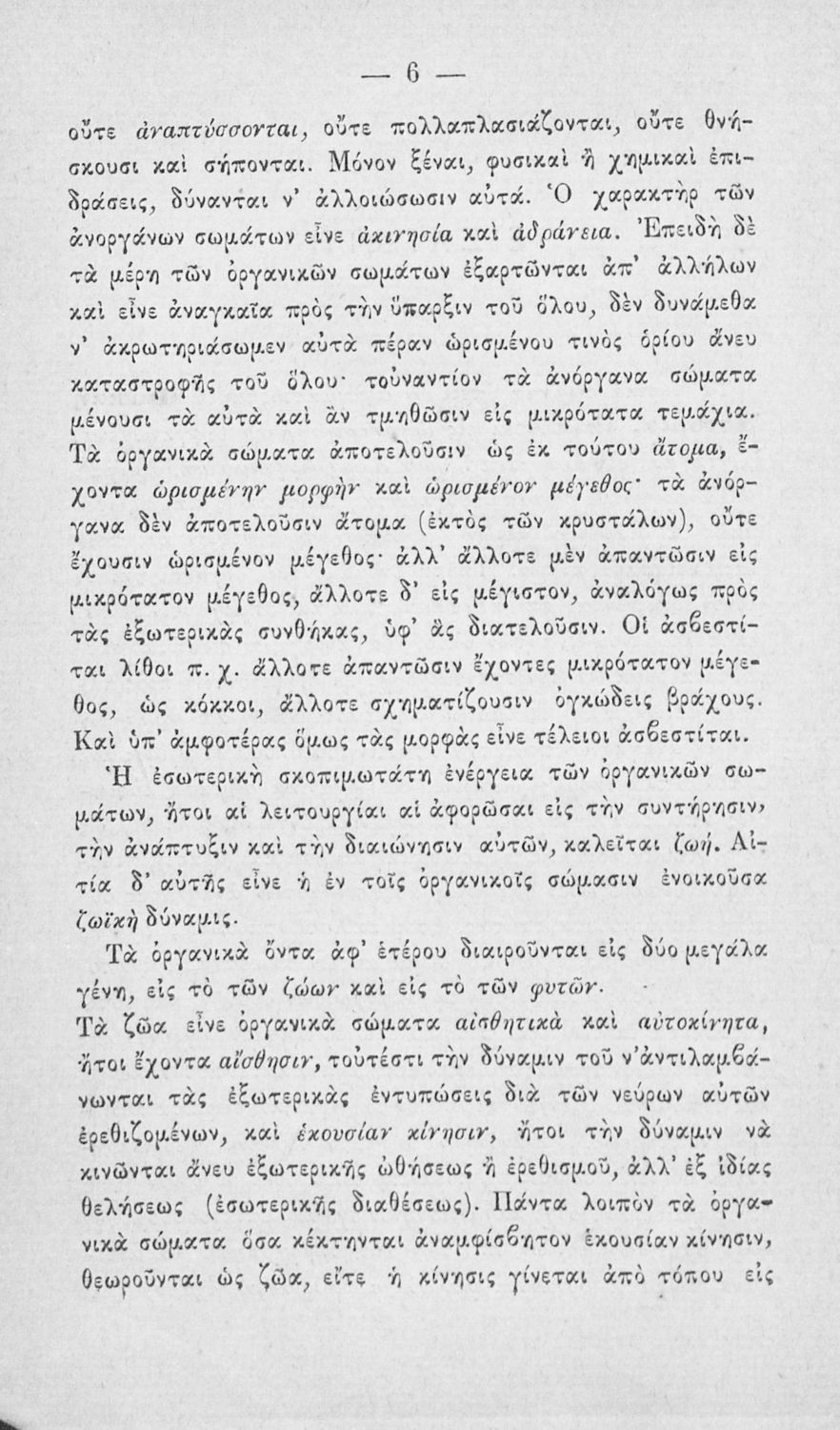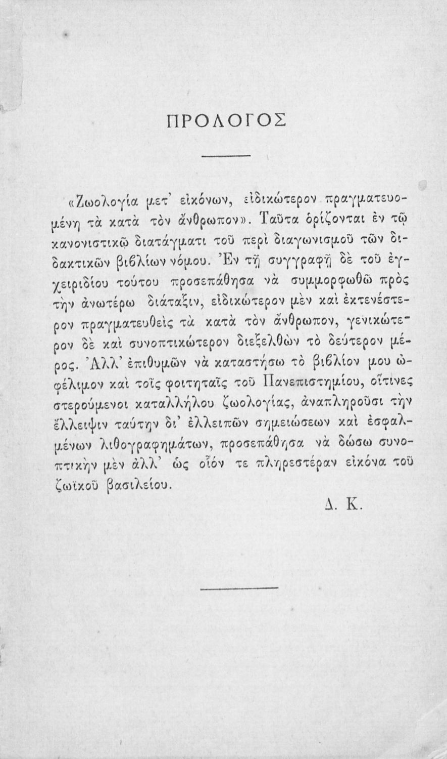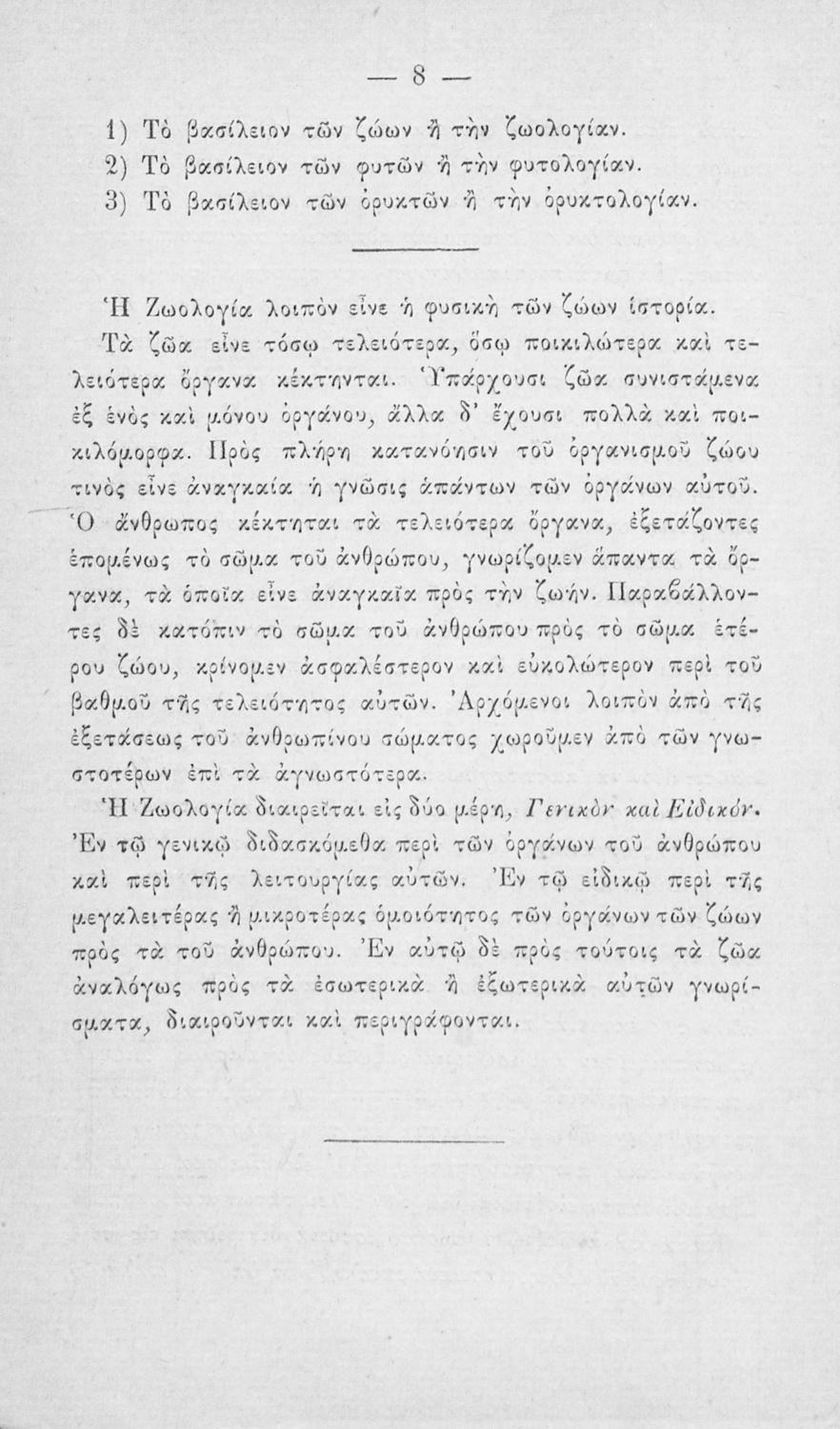 Σχολικό εγχειρίδιο Ζωολογίας για τα Γυμνάσια και τα Διδασκαλεία χωρισμένο σε δυο ενότητες: την ανατομία και φυσιολογία του ανθρώπου και την ιστορία των ζώων. Ο συγγραφέας ήταν καθηγητής ζωολογίας στο Εθνικό ...