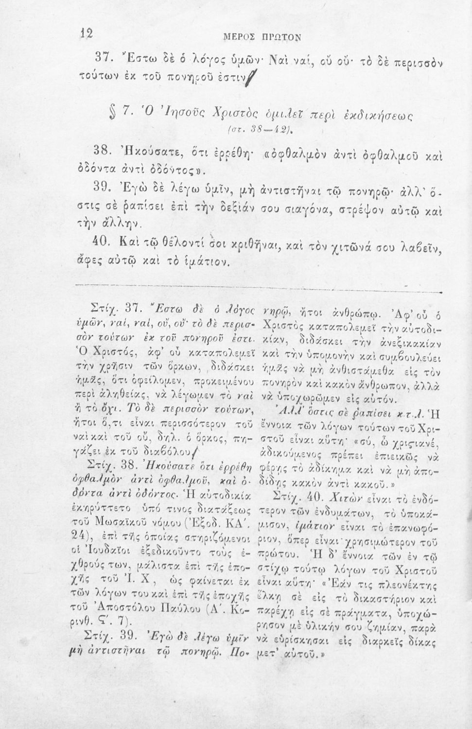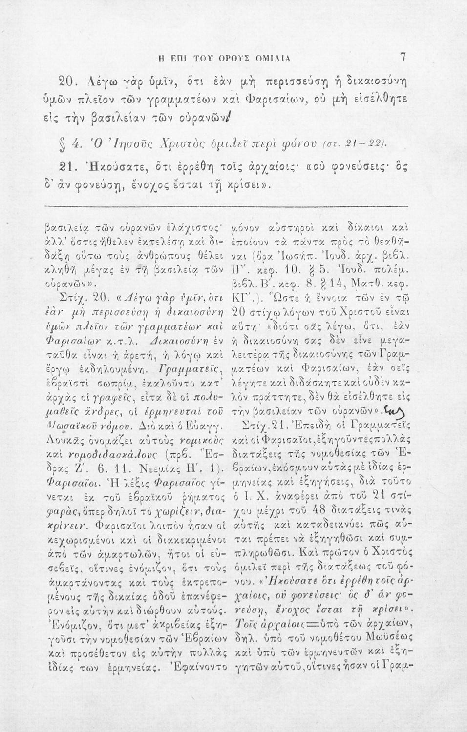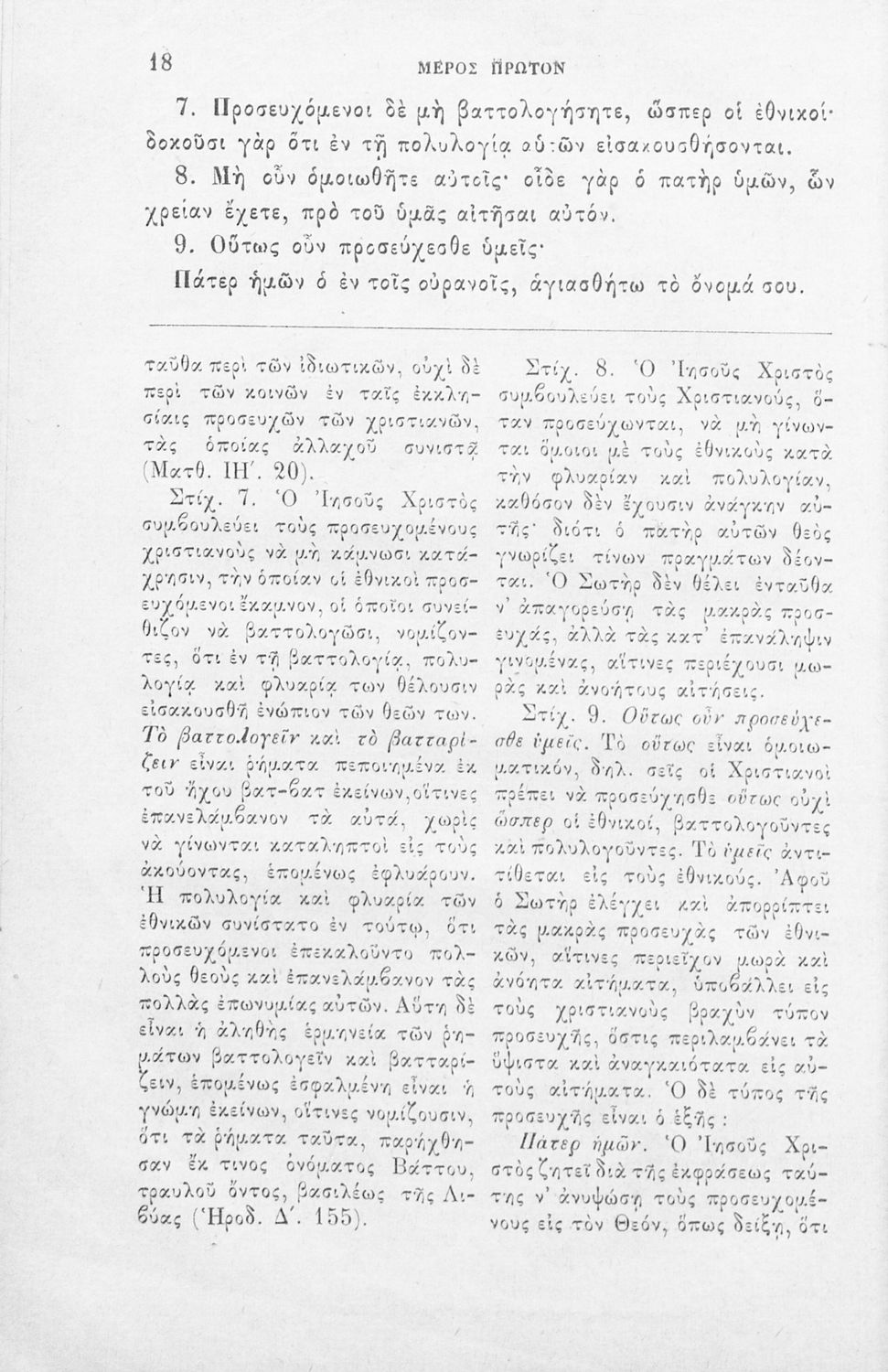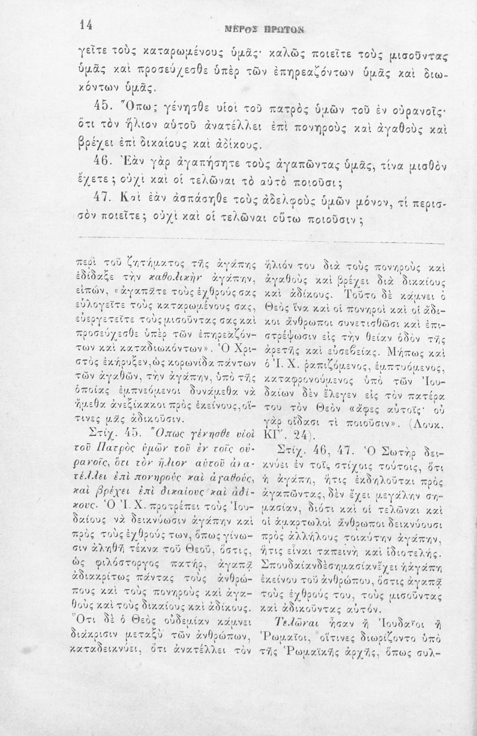 Βαθμίδα εκπαίδευσης: Δευτεροβάθμια Τάξη: Γυμνάσιο Μάθημα: Θρησκευτικά Γλώσσα: Καθαρεύουσα Παρουσίαση περιεχομένου: Σχολικό εγχειρίδιο Θρησκευτικών Γυμνασίου που εστιάζει στα κεφάλαια Ε΄, ΣΤ΄ και Ζ΄ από το Κατά Ματθαίον Ευαγγέλιο, τις παραβολές του Ιησού Χριστού και τις αποχαιρετιστήριες διδασκαλίες του ως προς τους μαθητές του. |