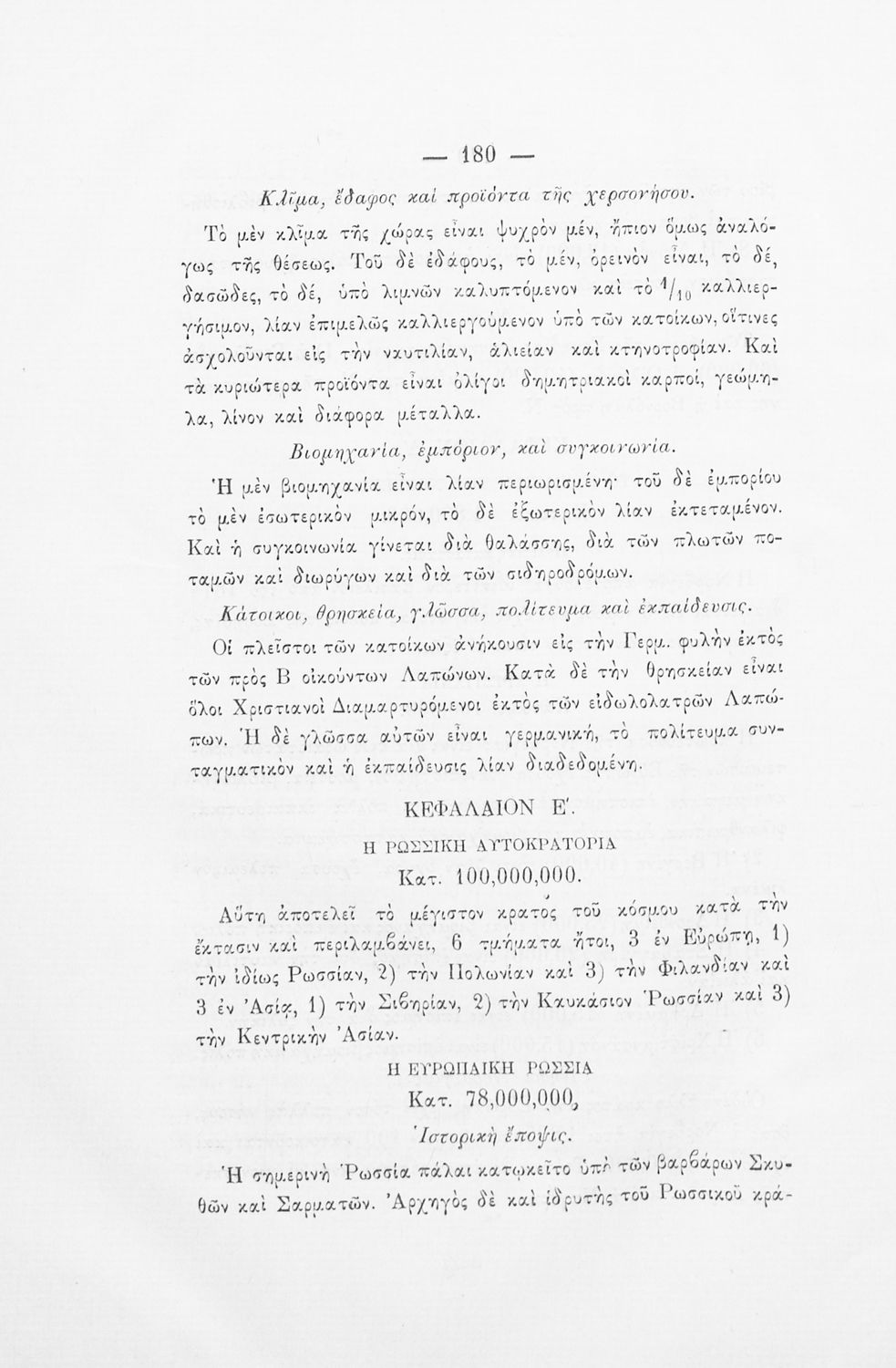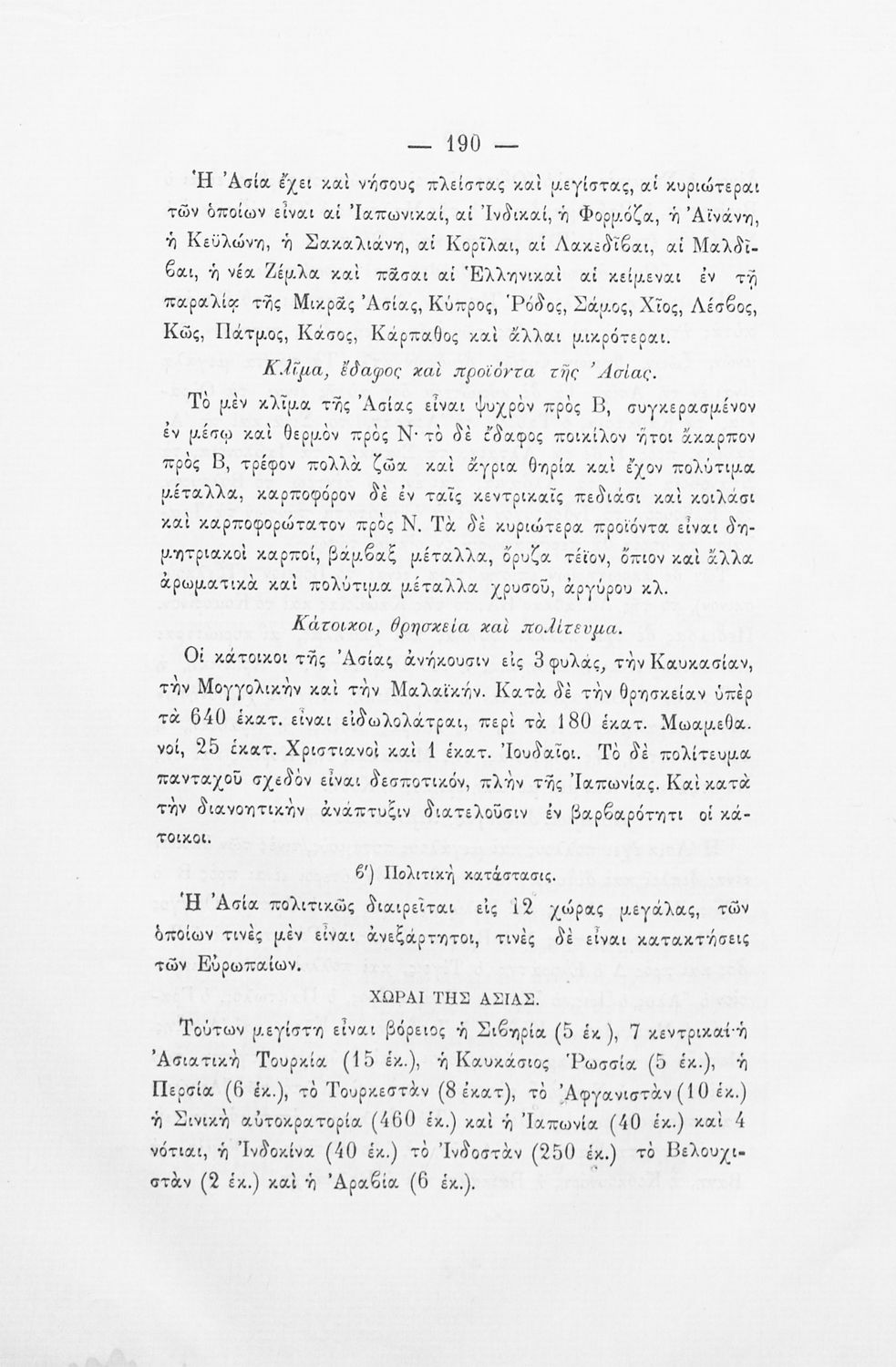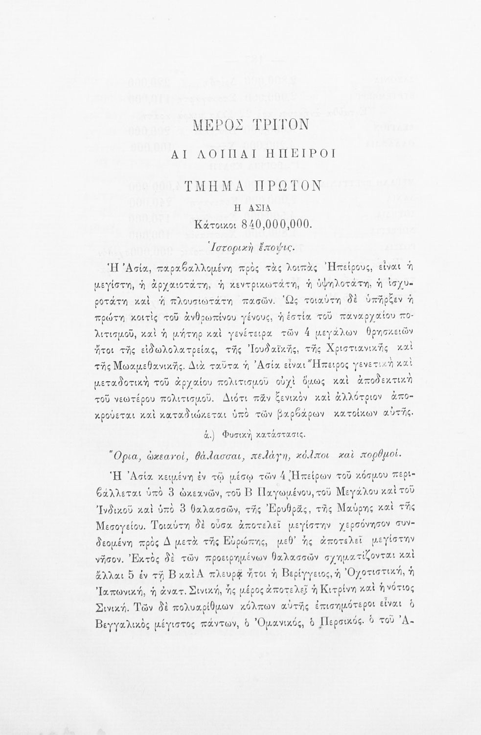 Σχολικό εγχειρίδιο Γεωγραφίας για τα Ελληνικά Σχολεία και Παρθεναγωγεία που περιλαμβάνει εισαγωγή στην φυσική γεωγραφία και γεωλογία, και μια γενική επισκόπηση της πολιτικής, οικονομικής και φυσικής γεωγραφίας
