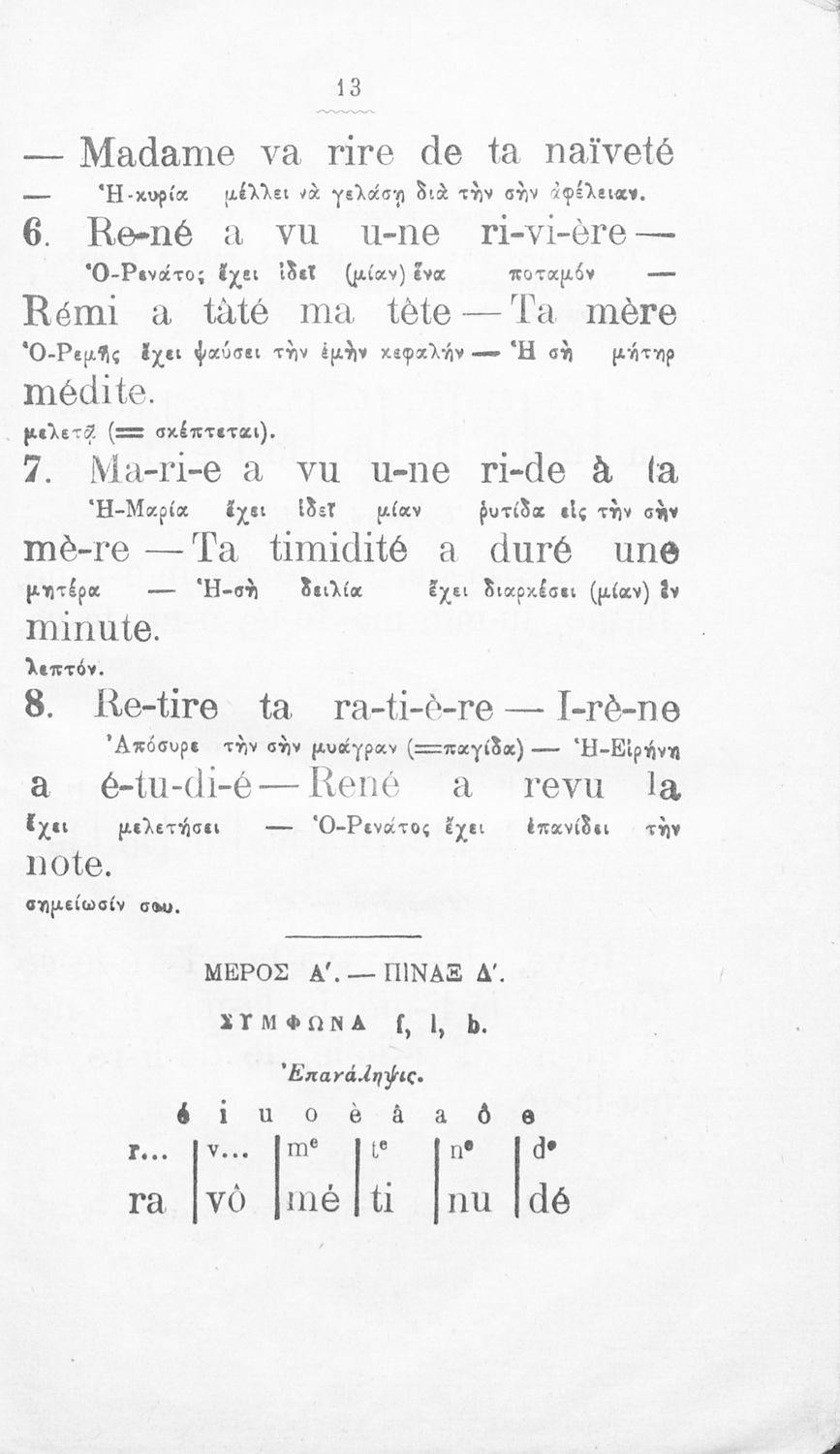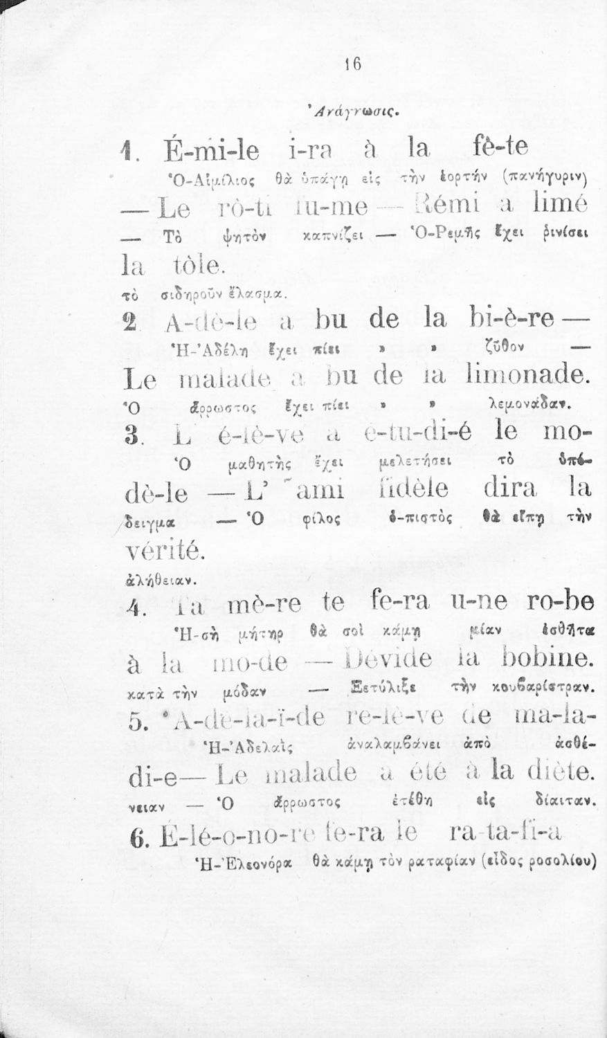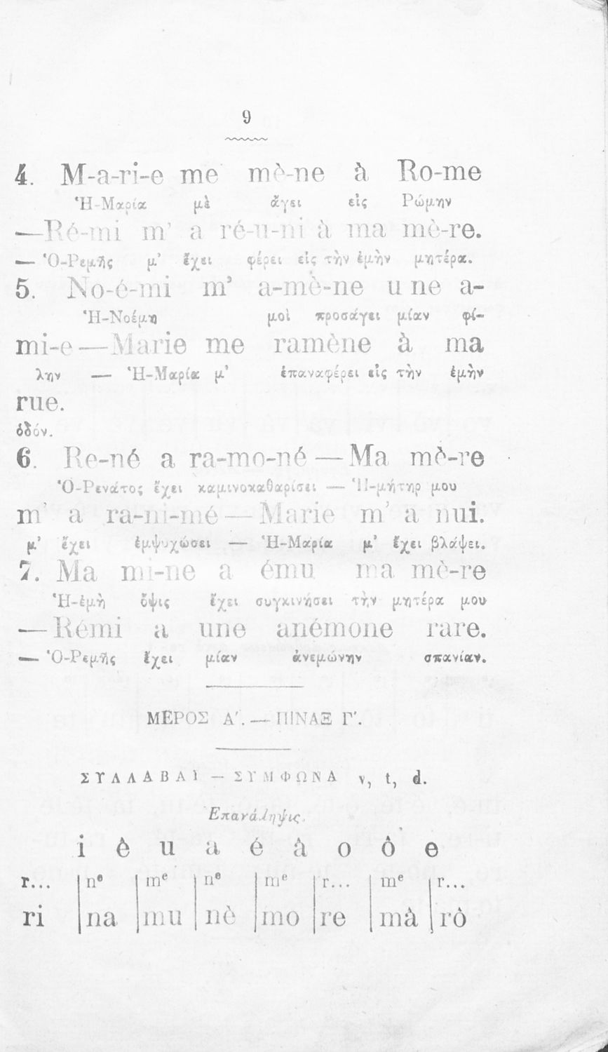 Σχολικό εγχειρίδιο Γαλλικών το οποίο εισάγει τους μαθητές στη σωστή χρήση του γαλλικού αλφάβητου και στη συνέχεια περιλαμβάνει σειρά σύντομων ιστοριών οι οποίες αντλούν τα θέματά τους από την οικογενειακή και κοινωνική ζωή.