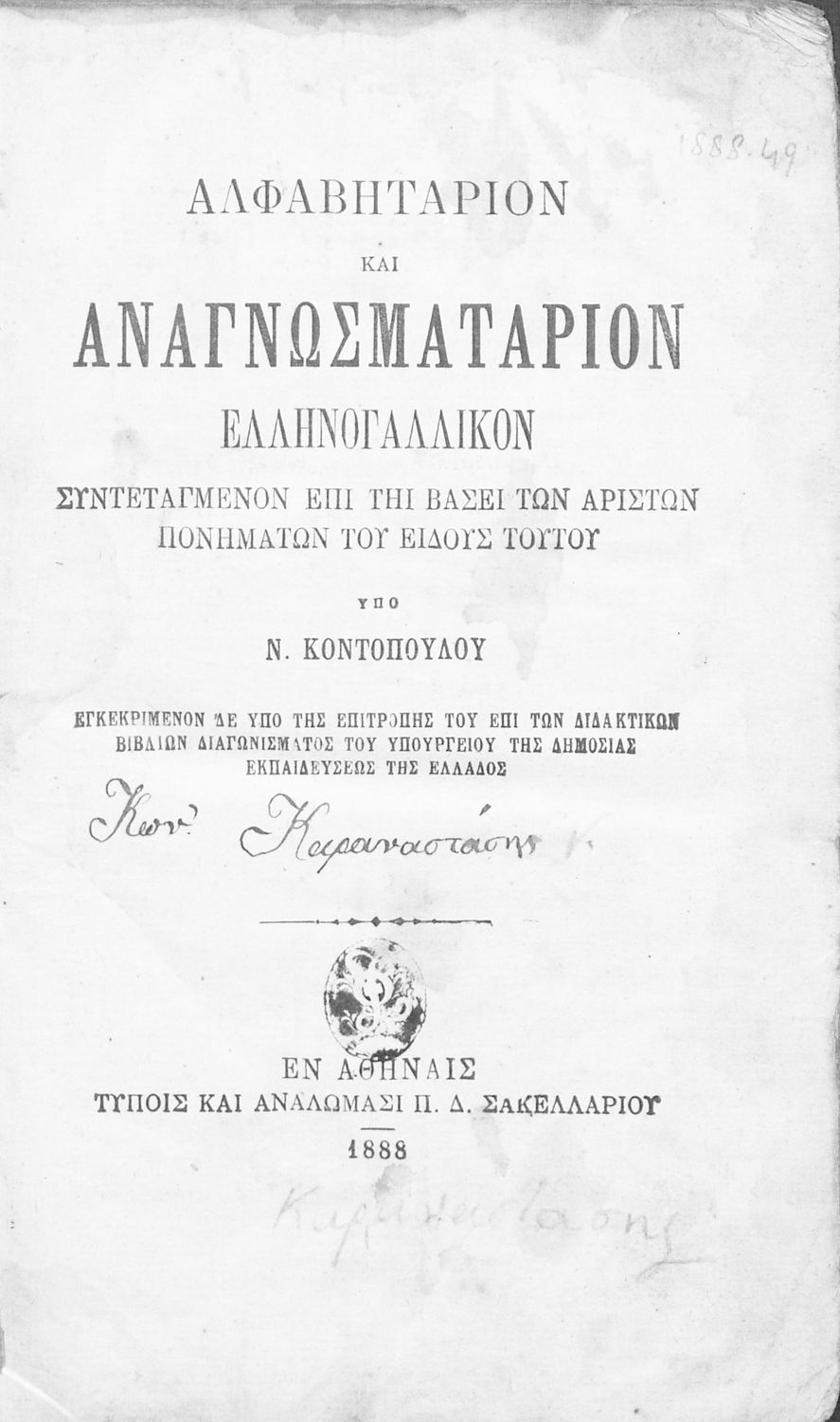 Τίτλος: Αλφαβητάριον και αναγνωσματάριον ελληνογαλλικόν, συντεταγμένον επί τη βάσει των αρίστων πονημάτων του είδους τούτου