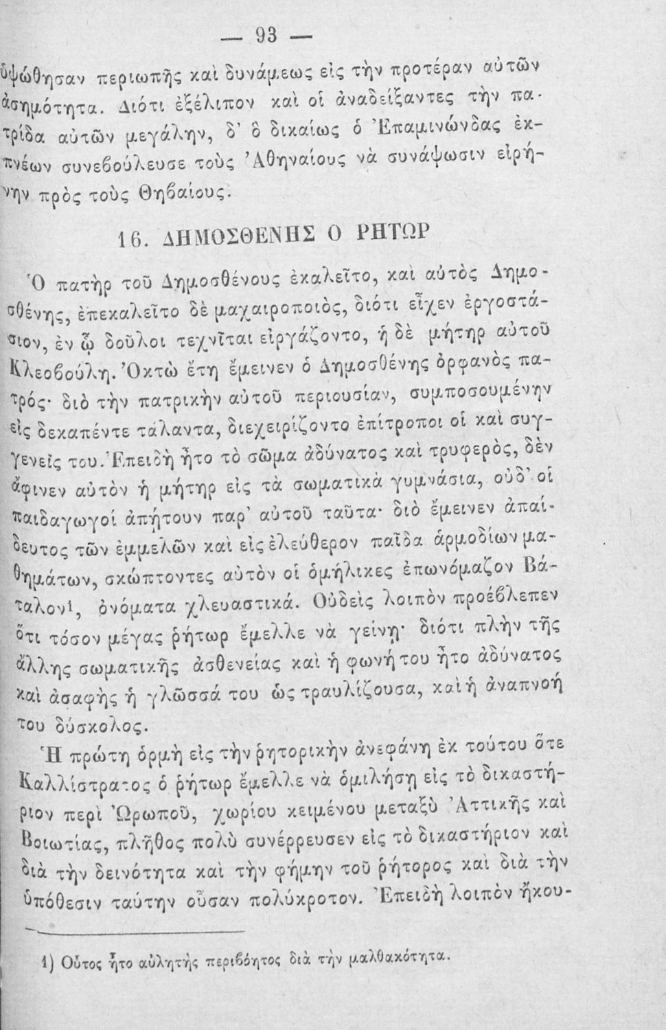 Σχολικό εγχειρίδιο για την Α' Ελληνικού Σχολείου και Παρθεναγωγείου που περιλαμβάνει βιογραφίες επιφανών ανδρών της αρχαίας και της νεώτερης Ελλάδας.