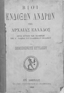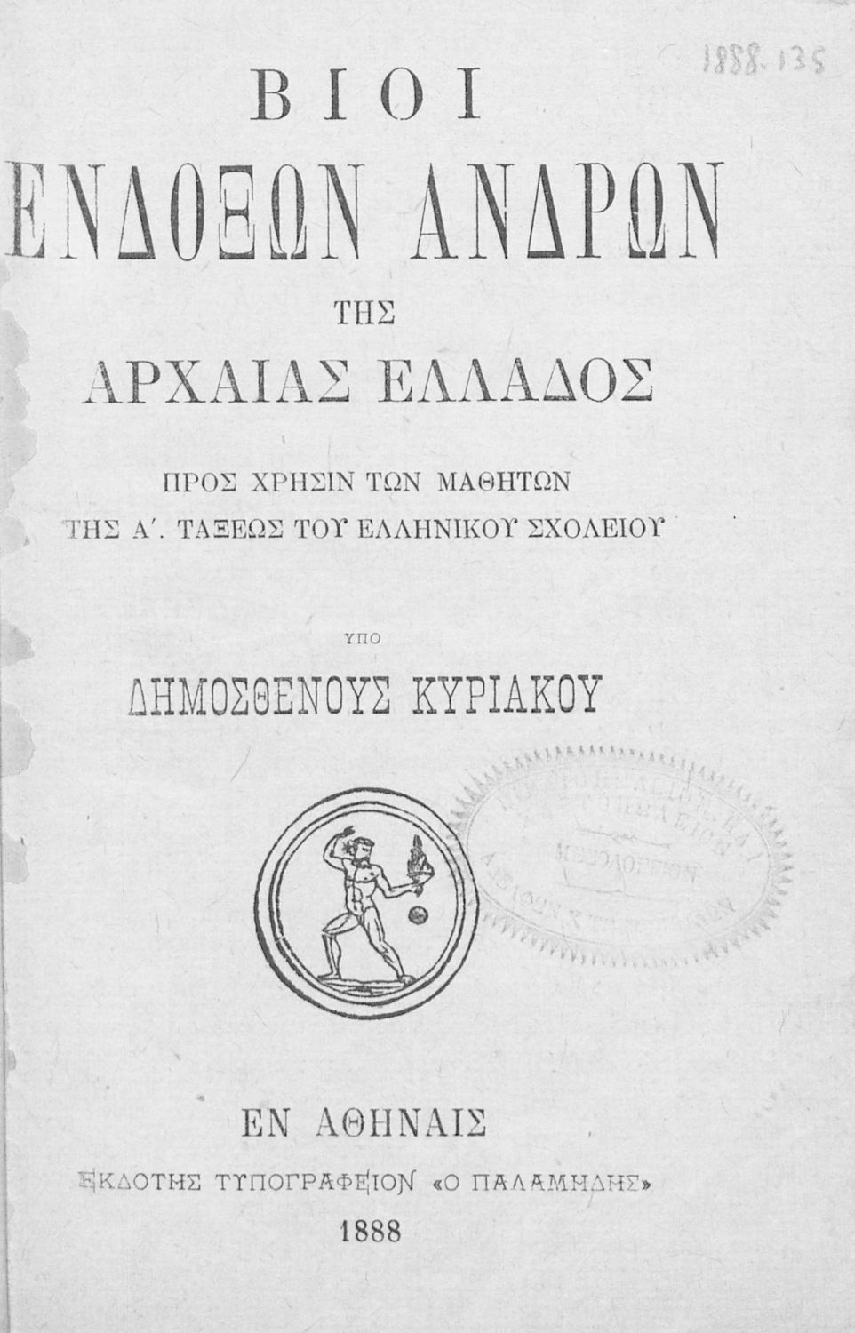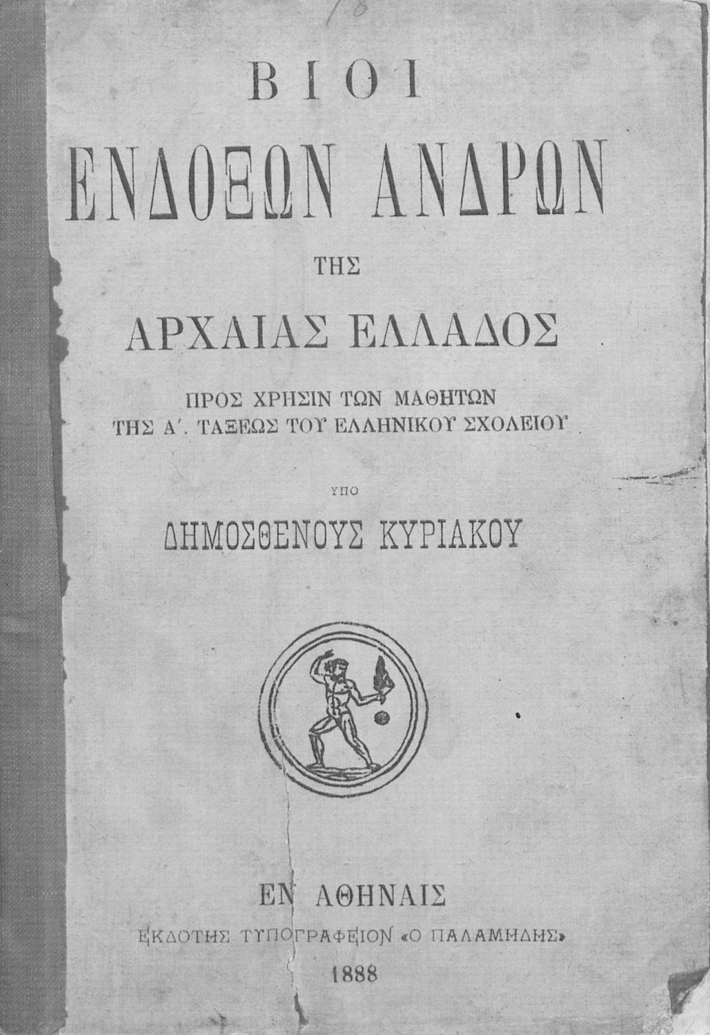 Κωδικός αναγνώρισης: 02-02386 Τίτλος: Βίοι ενδόξων ανδρών της αρχαίας Ελλάδος, προς χρήσιν των μαθητών της Α΄ τάξεως του Ελληνικού σχολείου Συγγραφέας: Δημοσθένης Κυριάκος Μέγεθος και υπόστρωμα: Σχολικό εγχειρίδιο, σκληρό εξώφυλλο, 134 σελίδες. |