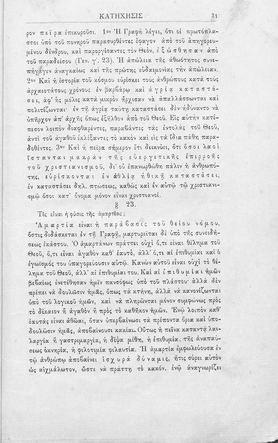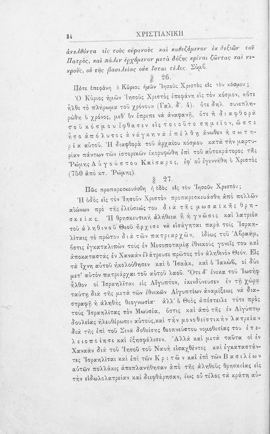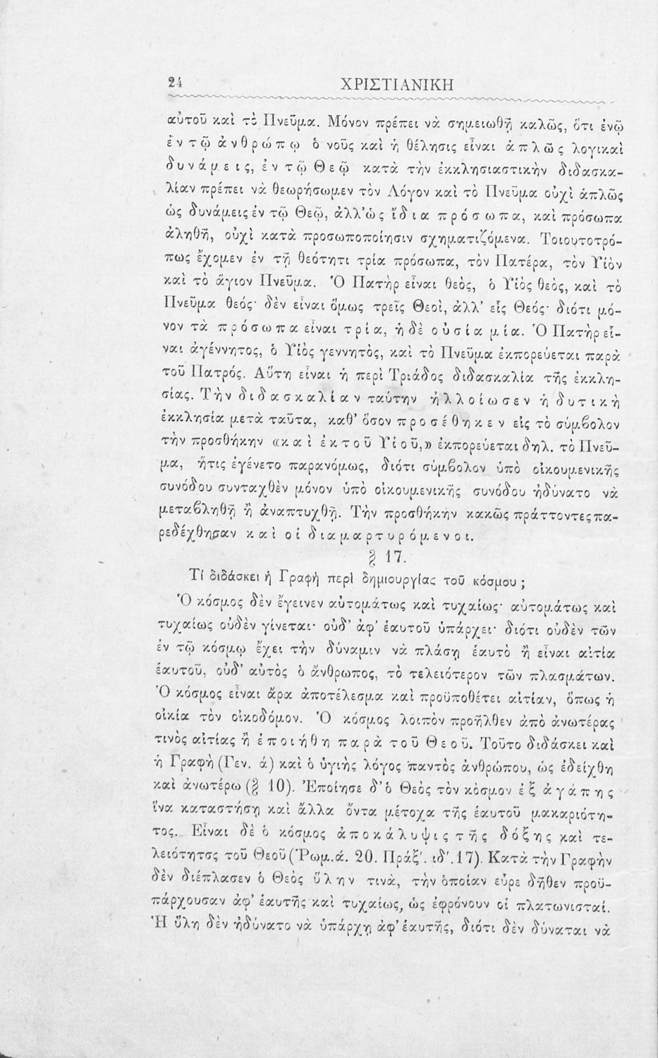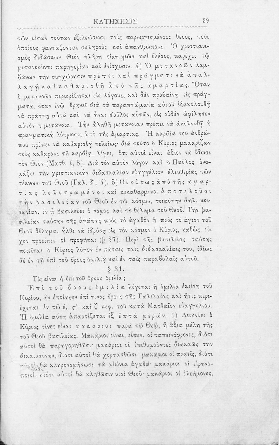 Βαθμίδα εκπαίδευσης: Δευτεροβάθμια Τάξη: Ελληνικό Σχολείο Μάθημα: Θρησκευτικά Γλώσσα: Καθαρεύουσα Παρουσίαση περιεχομένου: Σχολικό εγχειρίδιο Θρησκευτικών για τα Ελληνικά Σχολεία που περιλαμβάνει εισαγωγή στην Παλαιά και Καινή Διαθήκη και παρουσιάζει ζητήματα χριστιανικής κατήχησης και ηθικής με έμφαση στα μυστήρια και τις δέκα εντολές. |