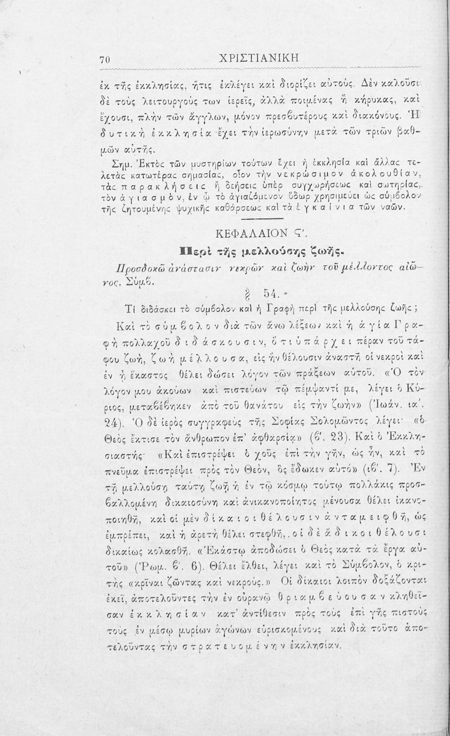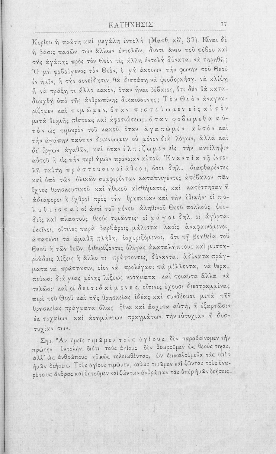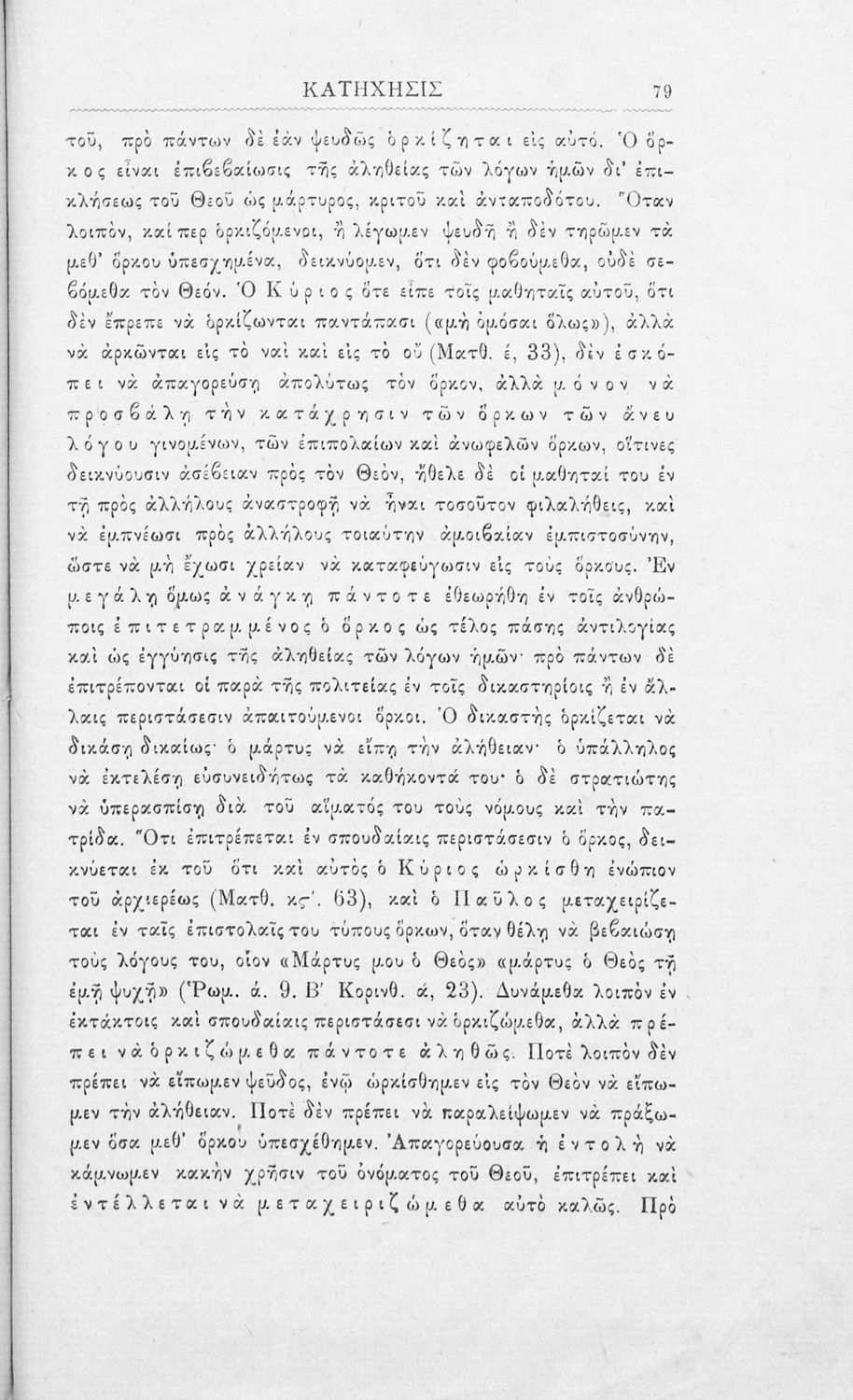 Βαθμίδα εκπαίδευσης: Δευτεροβάθμια Τάξη: Ελληνικό Σχολείο Μάθημα: Θρησκευτικά Γλώσσα: Καθαρεύουσα Παρουσίαση περιεχομένου: Σχολικό εγχειρίδιο Θρησκευτικών για τα Ελληνικά Σχολεία που περιλαμβάνει εισαγωγή στην Παλαιά και Καινή Διαθήκη και παρουσιάζει ζητήματα χριστιανικής κατήχησης και ηθικής με έμφαση στα μυστήρια και τις δέκα εντολές. |