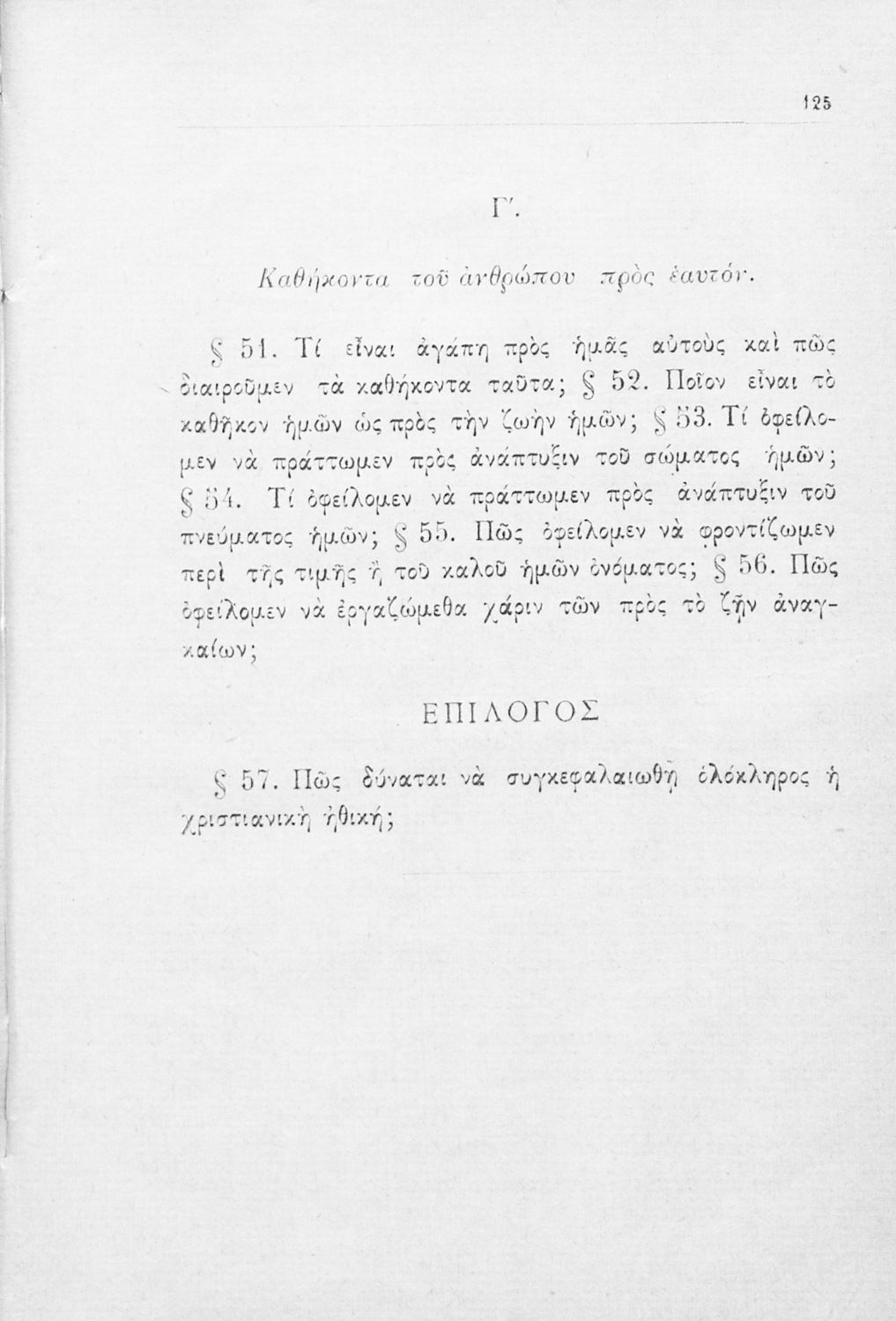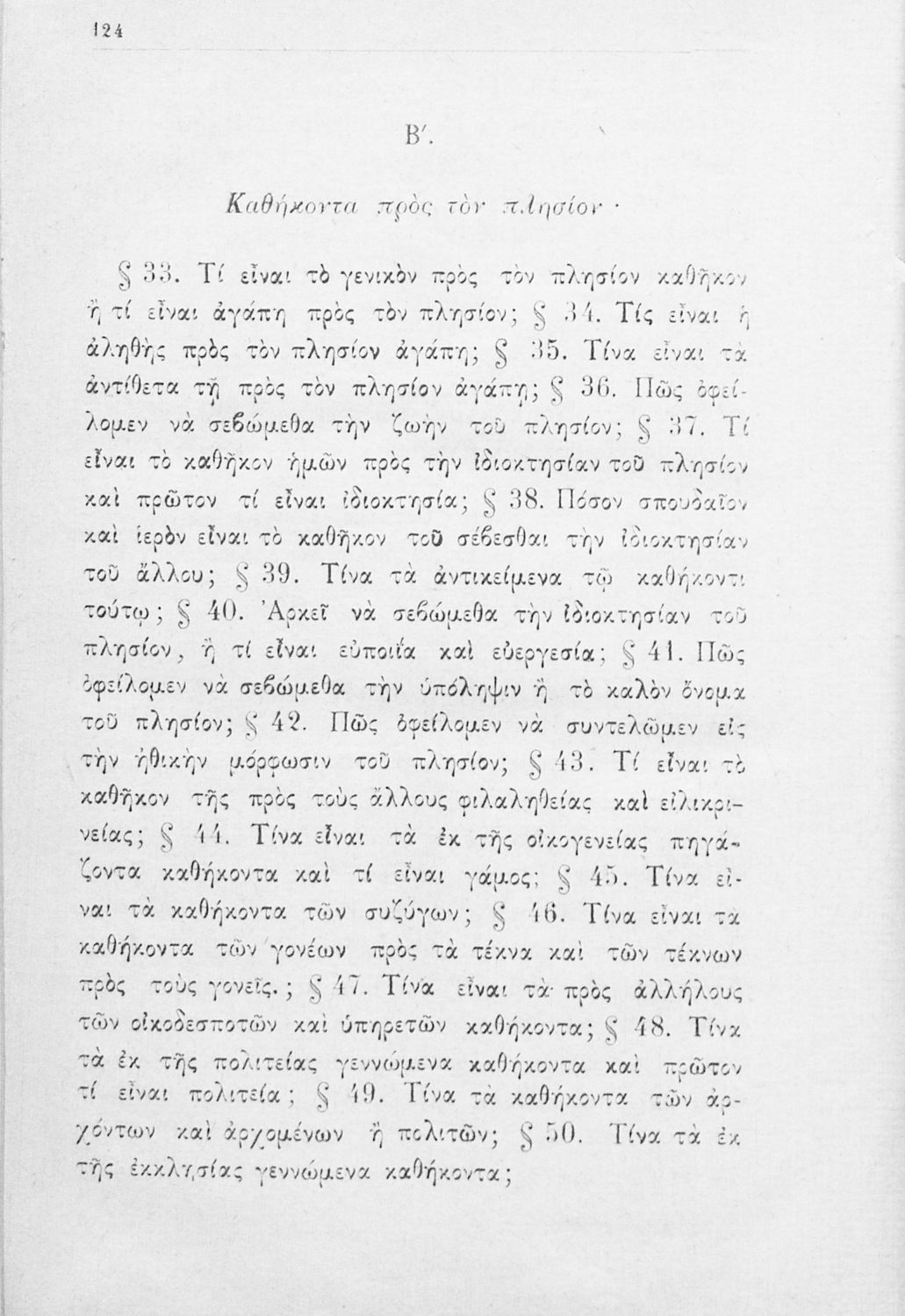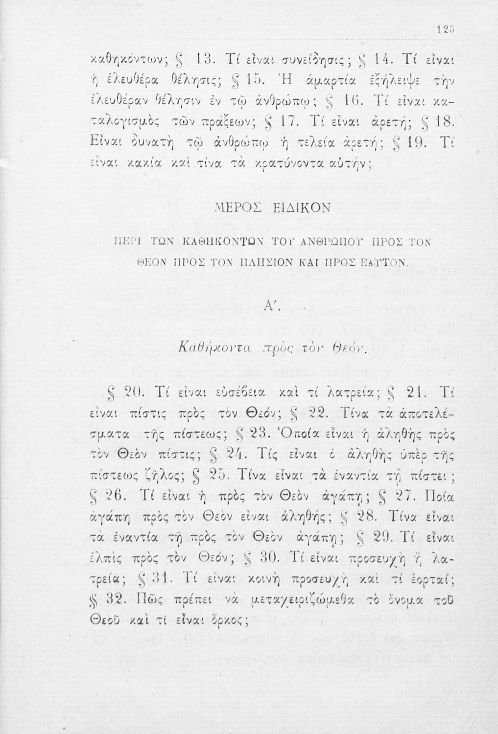 Βαθμίδα εκπαίδευσης: Δευτεροβάθμια Τάξη: Γυμνάσιο Μάθημα: Θρησκευτικά Γλώσσα: Καθαρεύουσα Παρουσίαση περιεχομένου: Σχολικό εγχειρίδιο Θρησκευτικών για τα Γυμνάσια που εστιάζει στη χριστιανική ηθική και αναλύει τα καθήκοντα του ανθρώπου προς τον Θεό, τους άλλους ανθρώπους και τον εαυτό του. |