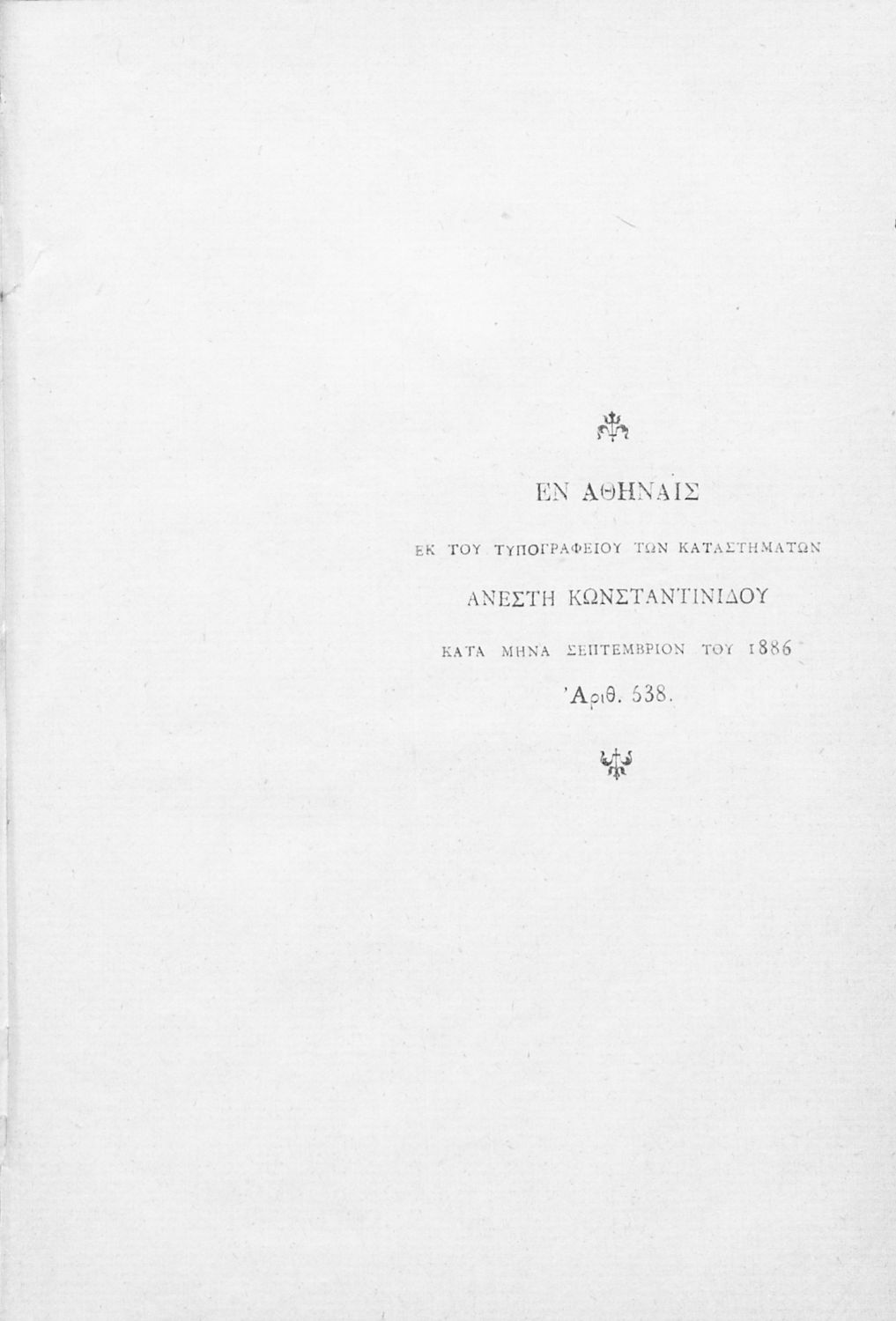 Εκδότης: Ανέστης Κωνσταντινίδης Έτος έκδοσης: 1888 Τόπος έκδοσης: Αθήνα Υπουργική απόφαση / Σύμβαση: 7970/ 14-6-1888 Έτος έγκρισης: 1888 |