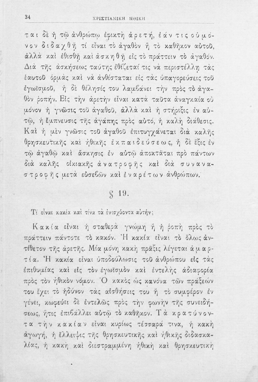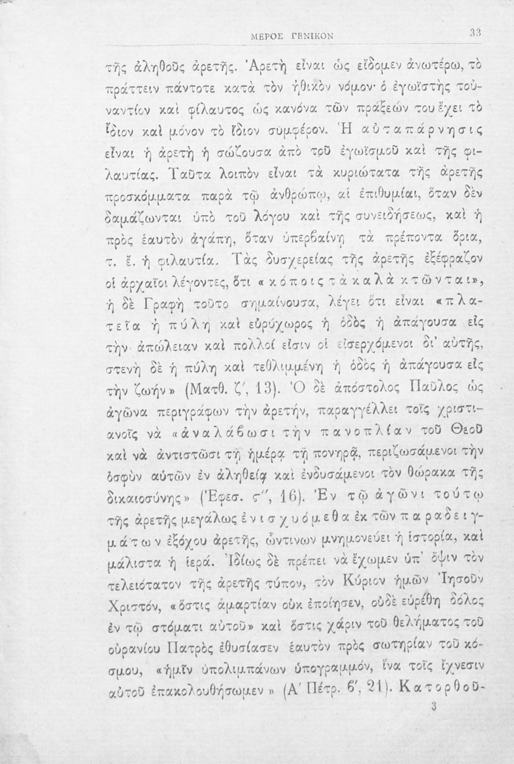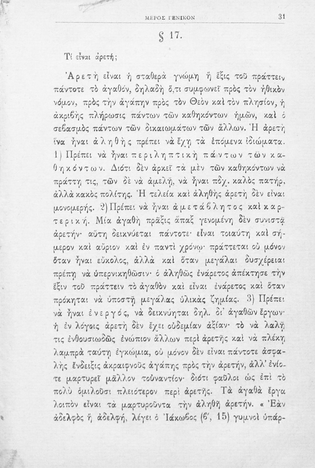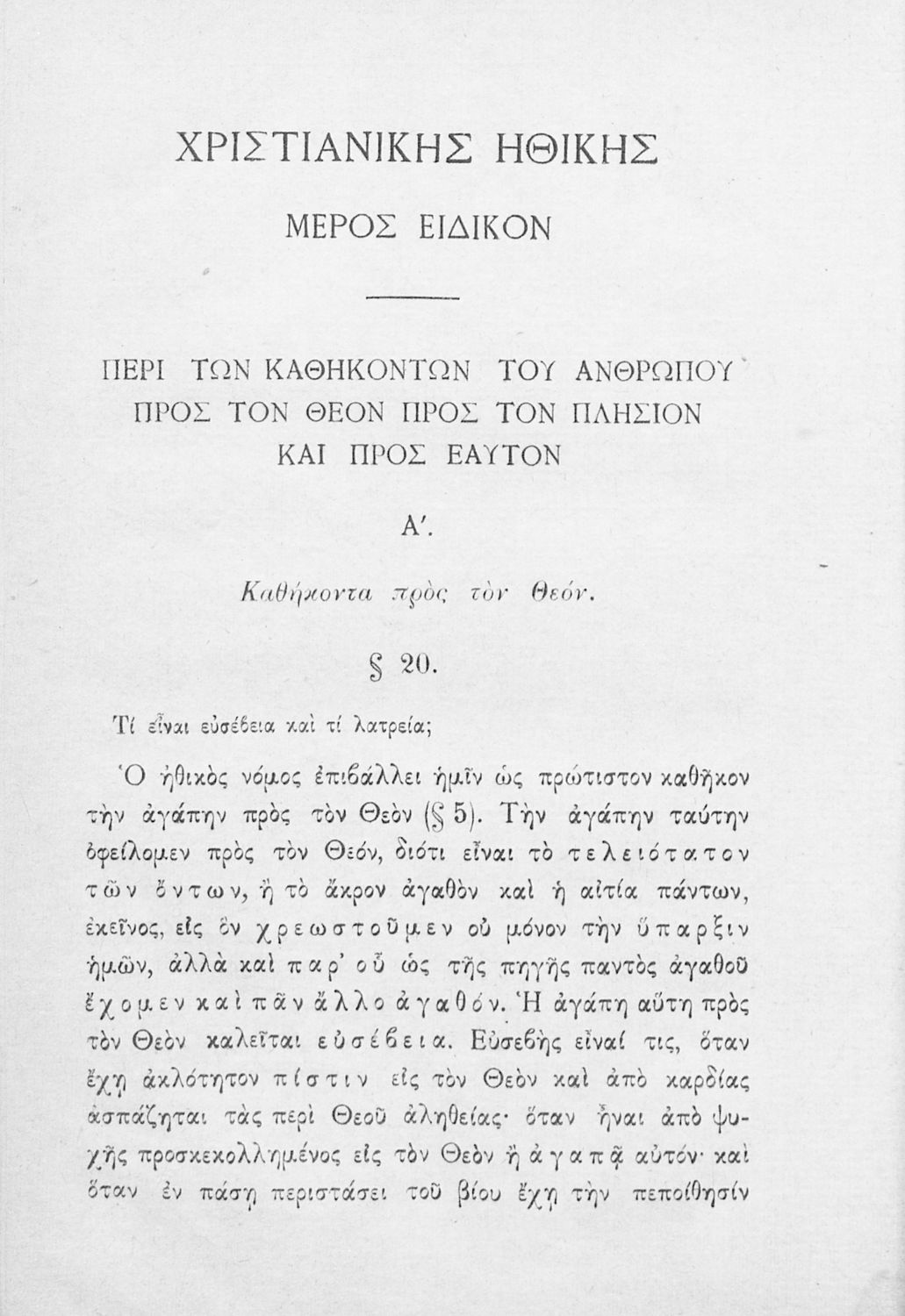 Βαθμίδα εκπαίδευσης: Δευτεροβάθμια Τάξη: Γυμνάσιο Μάθημα: Θρησκευτικά Γλώσσα: Καθαρεύουσα Παρουσίαση περιεχομένου: Σχολικό εγχειρίδιο Θρησκευτικών για τα Γυμνάσια που εστιάζει στη χριστιανική ηθική και αναλύει τα καθήκοντα του ανθρώπου προς τον Θεό, τους άλλους ανθρώπους και τον εαυτό του. |
