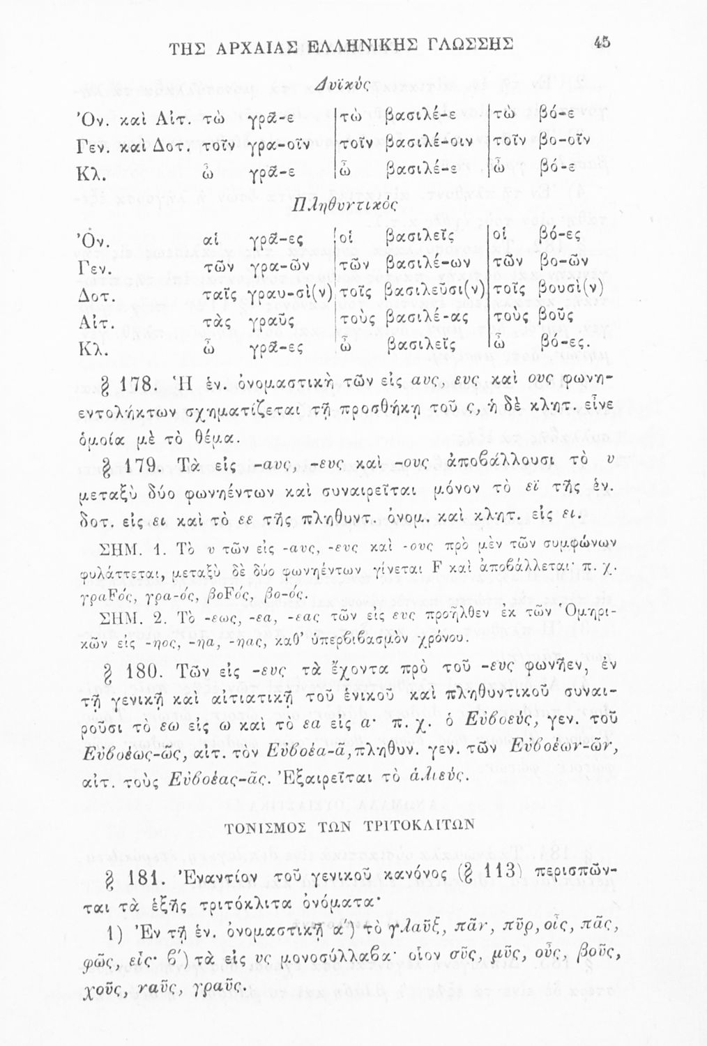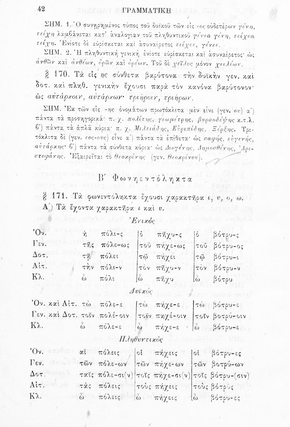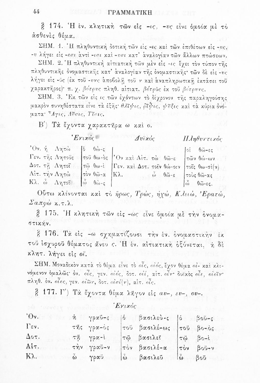 Σχολικό εγχειρίδιο Αρχαίων Ελληνικών για τα Ελληνικά Σχολεία, Παρθεναγωγεία και Γυμνάσια που περιέχει τους κανόνες γραμματικής και είναι χωρισμένο σε φθογγολογικό, τυπολογικό και ετυμολογικό μέρος.