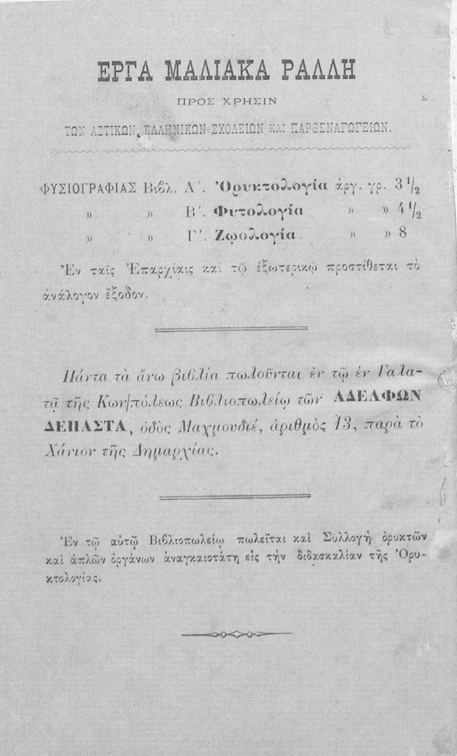 Σχολικό εγχειρίδιο Φυσικής Ιστορίας για τα Ελληνικά Σχολεία και Παρθεναγωγεία που περιλαμβάνει στοιχεία ζωολογίας και της φυτολογίας και διακρίνει τα ζώα και τα φυτά ανάλογα με την συνομοταξία στην οποία ...