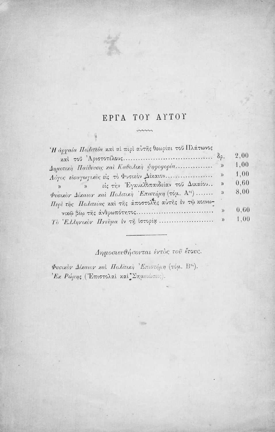 Τίτλος: Αι πολιτικαί θεωρίαι της Γαλλικής Επαναστάσεως και η ιστορική Σχολή του Δικαίου, (μάθημα εναρκτήριον εν τη Νομική Σχολή του Εθνικού Πανεπιστημίου)