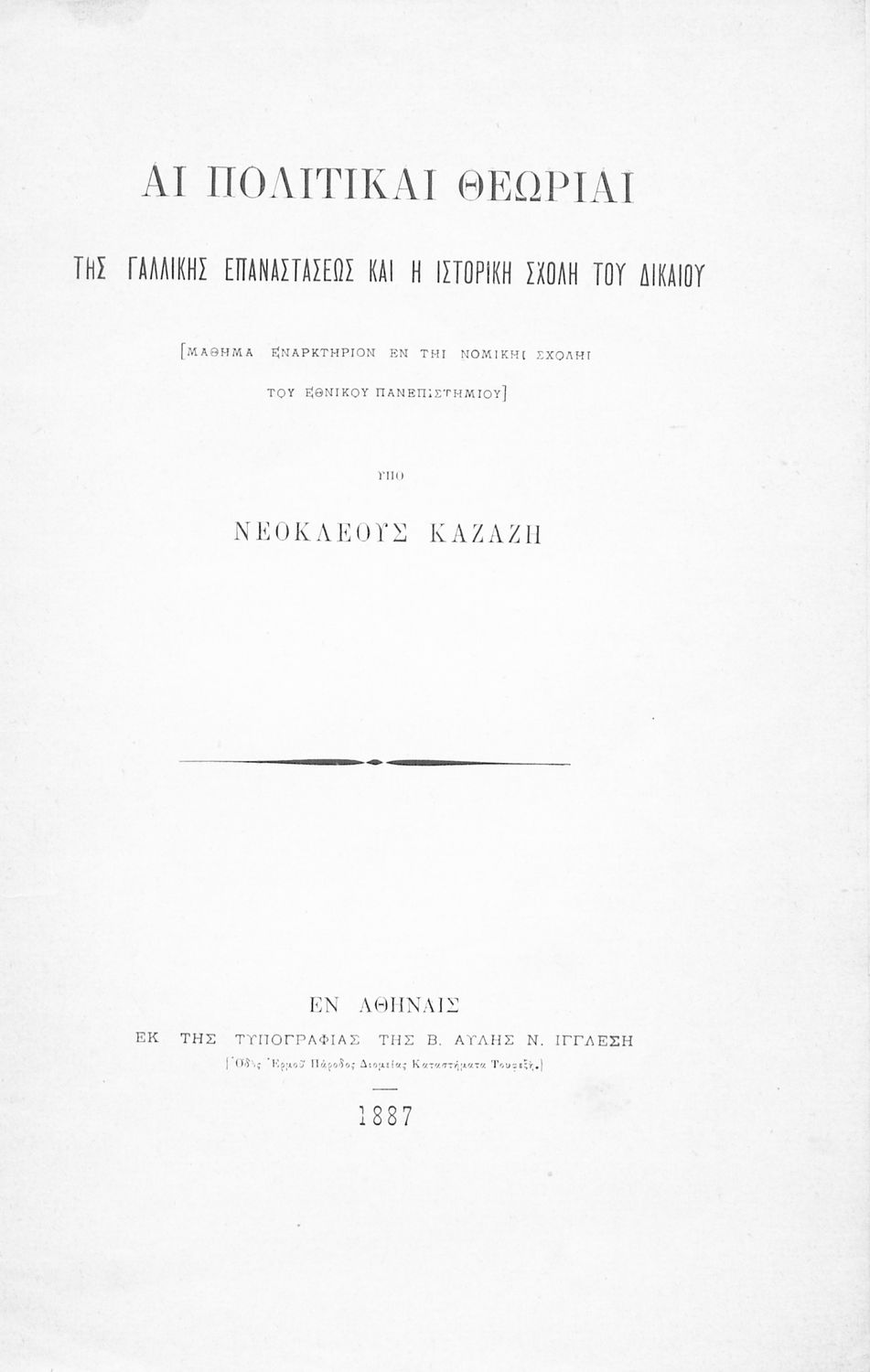 Κωδικός αναγνώρισης: 02-02432 Τίτλος: Αι πολιτικαί θεωρίαι της Γαλλικής Επαναστάσεως και η ιστορική Σχολή του Δικαίου, (μάθημα εναρκτήριον εν τη Νομική Σχολή του Εθνικού Πανεπιστημίου) Συγγραφέας: Νεοκλής Καζάζης Μέγεθος και υπόστρωμα: Σχολικό εγχειρίδιο, μαλακό εξώφυλλο, 28 σελίδες. |