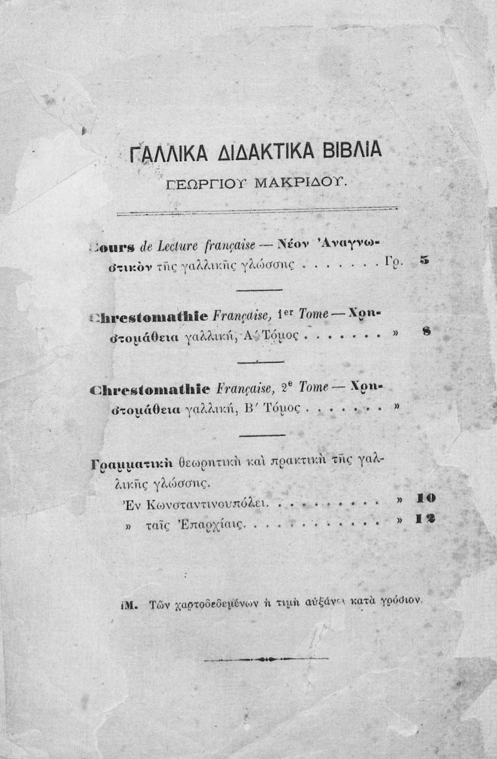 Τίτλος: Γραμματική θεωρητική και πρακτική της γαλλικής γλώσσης, προς χρήσιν των σχολείων και Γυμνασίων