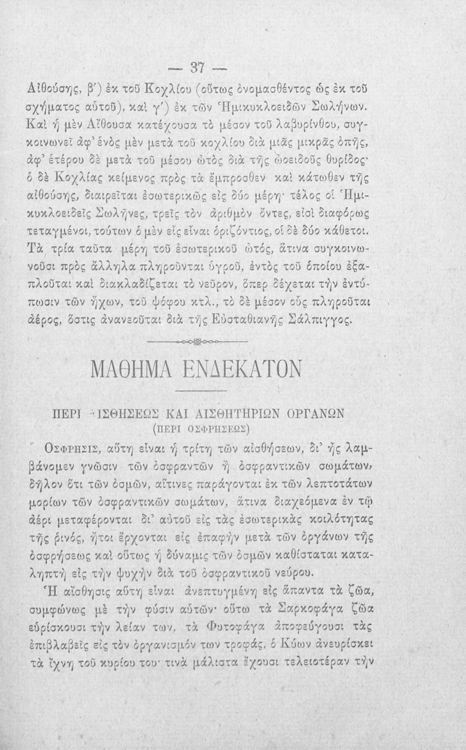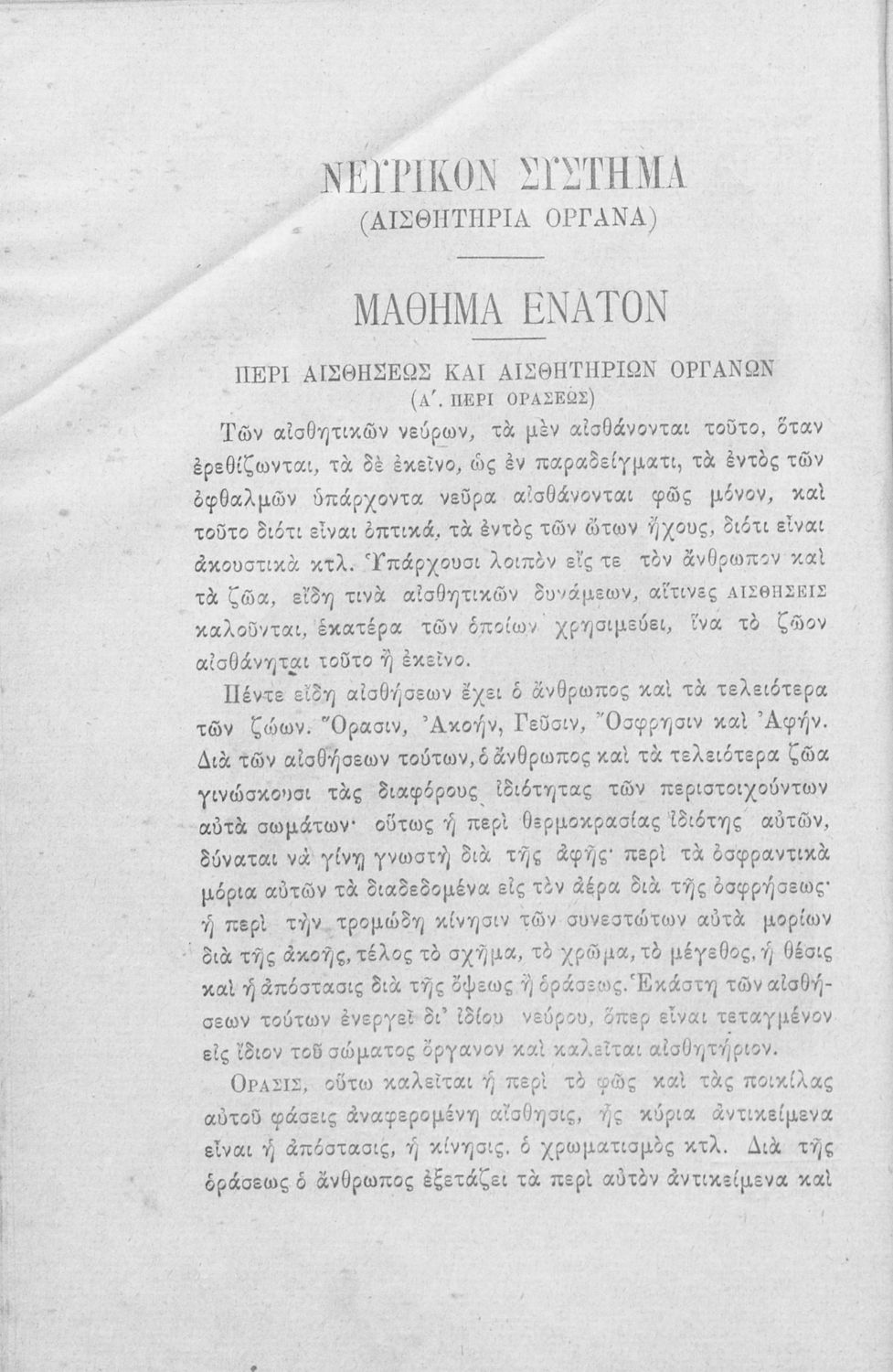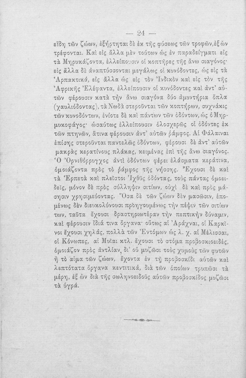Σχολικό εγχειρίδιο Ζωολογίας των Γυμνασίων, Διδασκαλείων και Παρθεναγωγείων. Στο πρώτο μέρος του βιβλίου παρουσιάζεται η δομή του ανθρώπινου σώματος και τα διάφορα συστήματα του ανθρώπινου οργανισμού, όπως το νευρικό και αγγειακό. Στο δεύτερο μέρος, το βιβλίο παρουσιάζει τα διάφορα είδη των ζώων και τα κατηγοριοποιεί τρεις κατηγορίες, τα σπονδυλωτά, τα αρθωτά, όπως τα έντομα και τα σκουλήκια, και τέλος τα μαλάκια και παρουσιάζει τις ιδιότητές και τα χαρακτηριστικά τους και τα μέρη τα οποία συναντώνται.