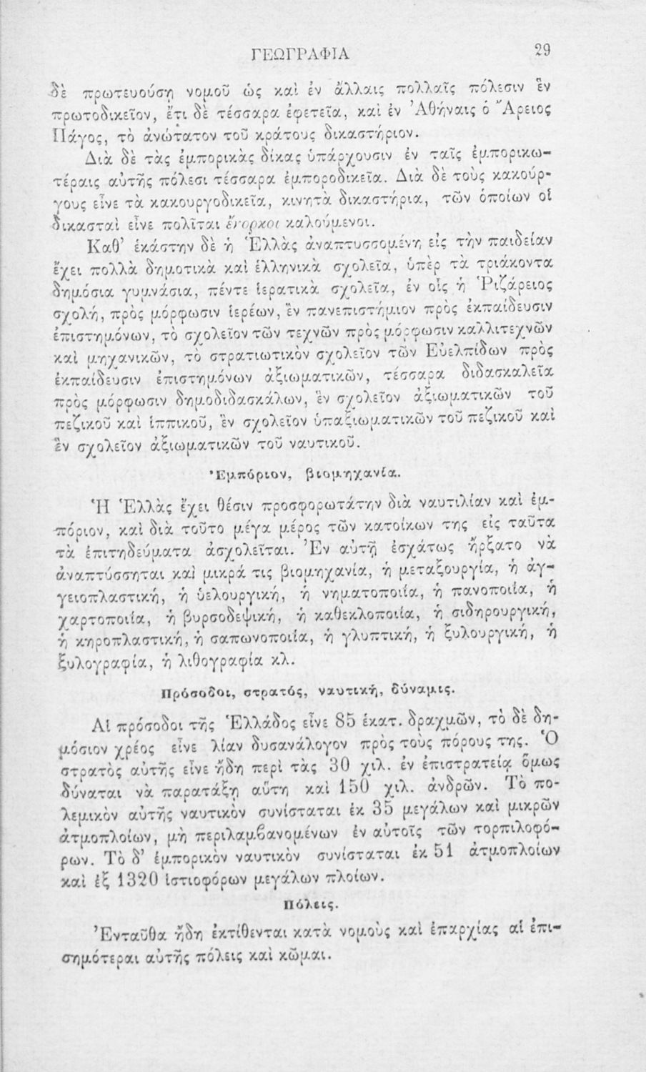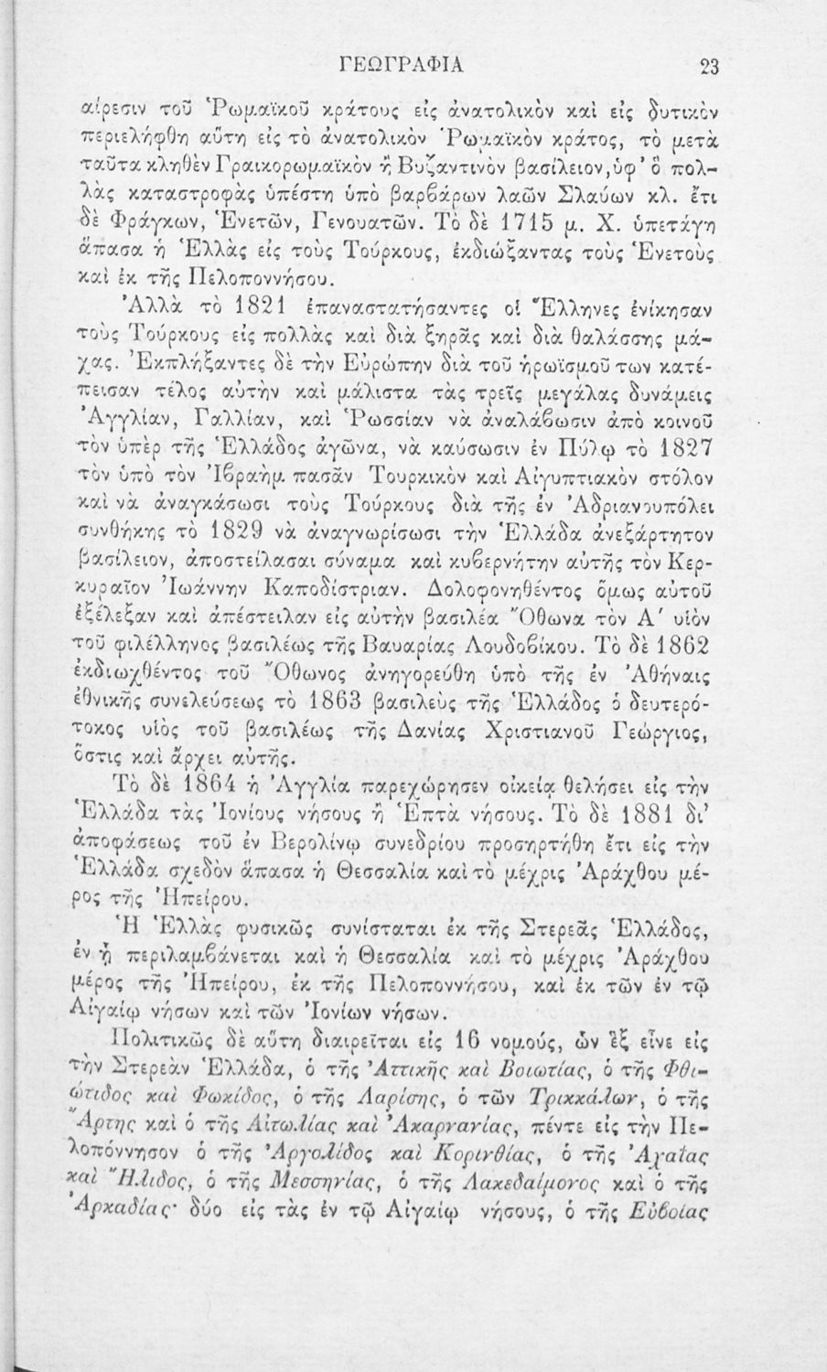 Βαθμίδα εκπαίδευσης: Δευτεροβάθμια Τάξη: Ελληνικό Σχολείο Μάθημα: Γεωγραφία Γλώσσα: Καθαρεύουσα Παρουσίαση περιεχομένου: Σχολικό εγχειρίδιο Πολιτικής και Φυσικής Γεωγραφίας για τους μαθητές των Ελληνικών Σχολείων το οποίο παρουσιάζει συνοπτικά τη γεωγραφία της Ελλάδας και των βασικότερων χωρών του ευρωπαϊκού χώρου αναλύοντας τη γεωμορφολογία καθώς και ζητήματα θρησκείας, πληθυσμού, γλώσσας και πολιτεύματος κάθε χώρας. |