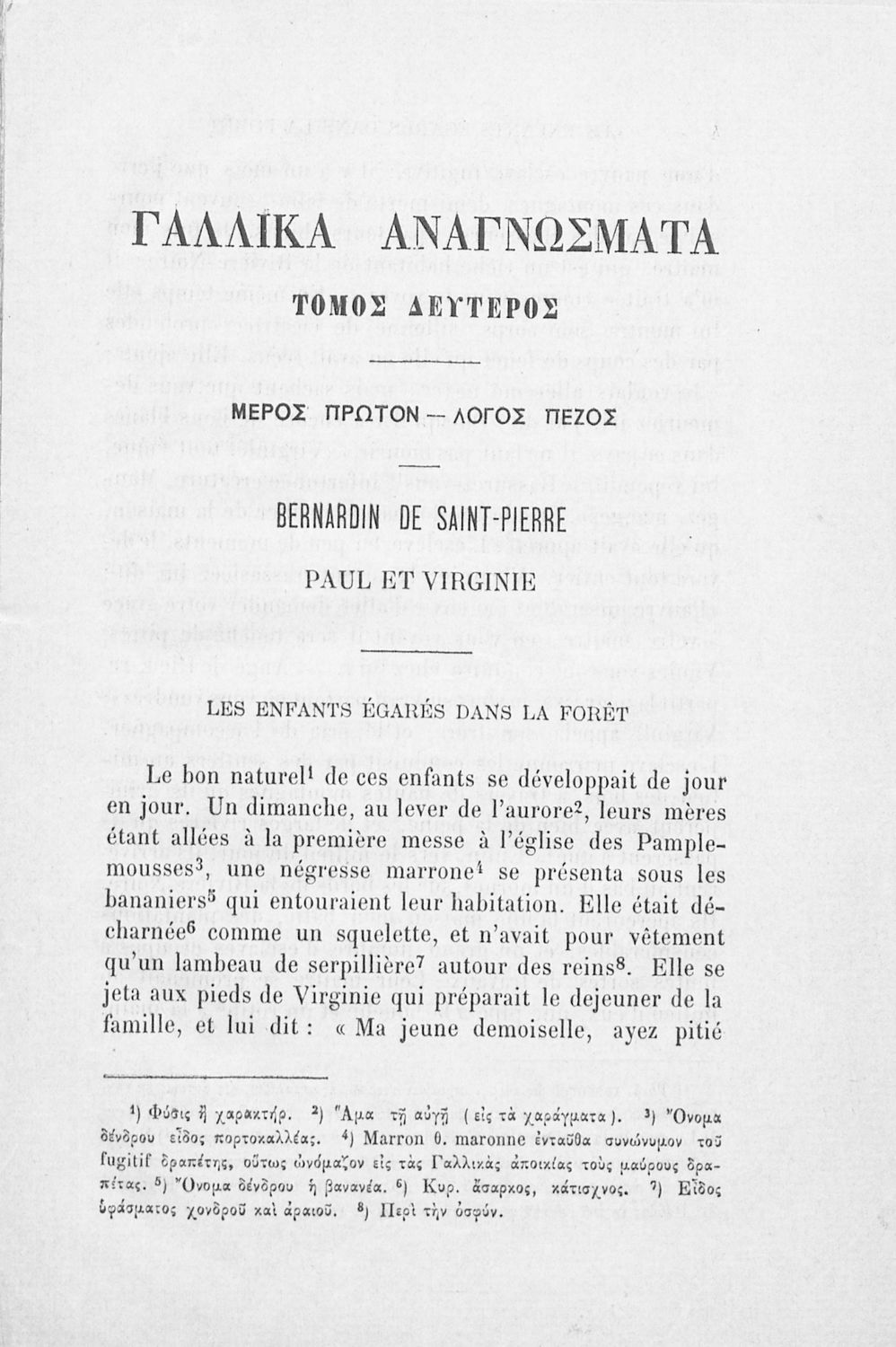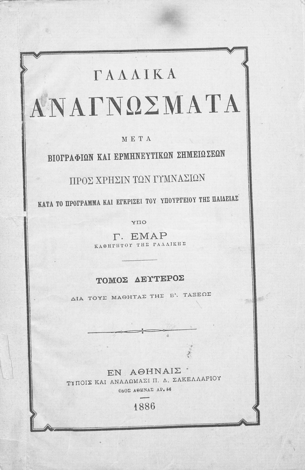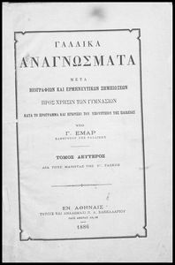 Τίτλος: Γαλλικά αναγνώσματα, μετά βιογραφιών και ερμηνευτικών σημειώσεων, προς χρήσιν των Γυμνασίων, τόμος δεύτερος δια τους μαθητάς της Β΄ τάξεως