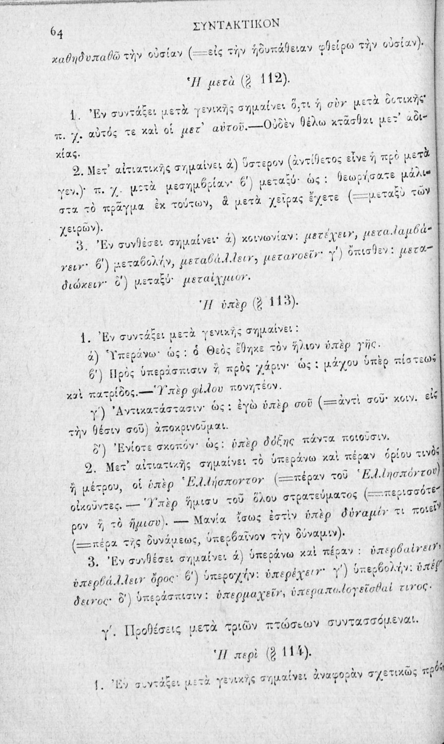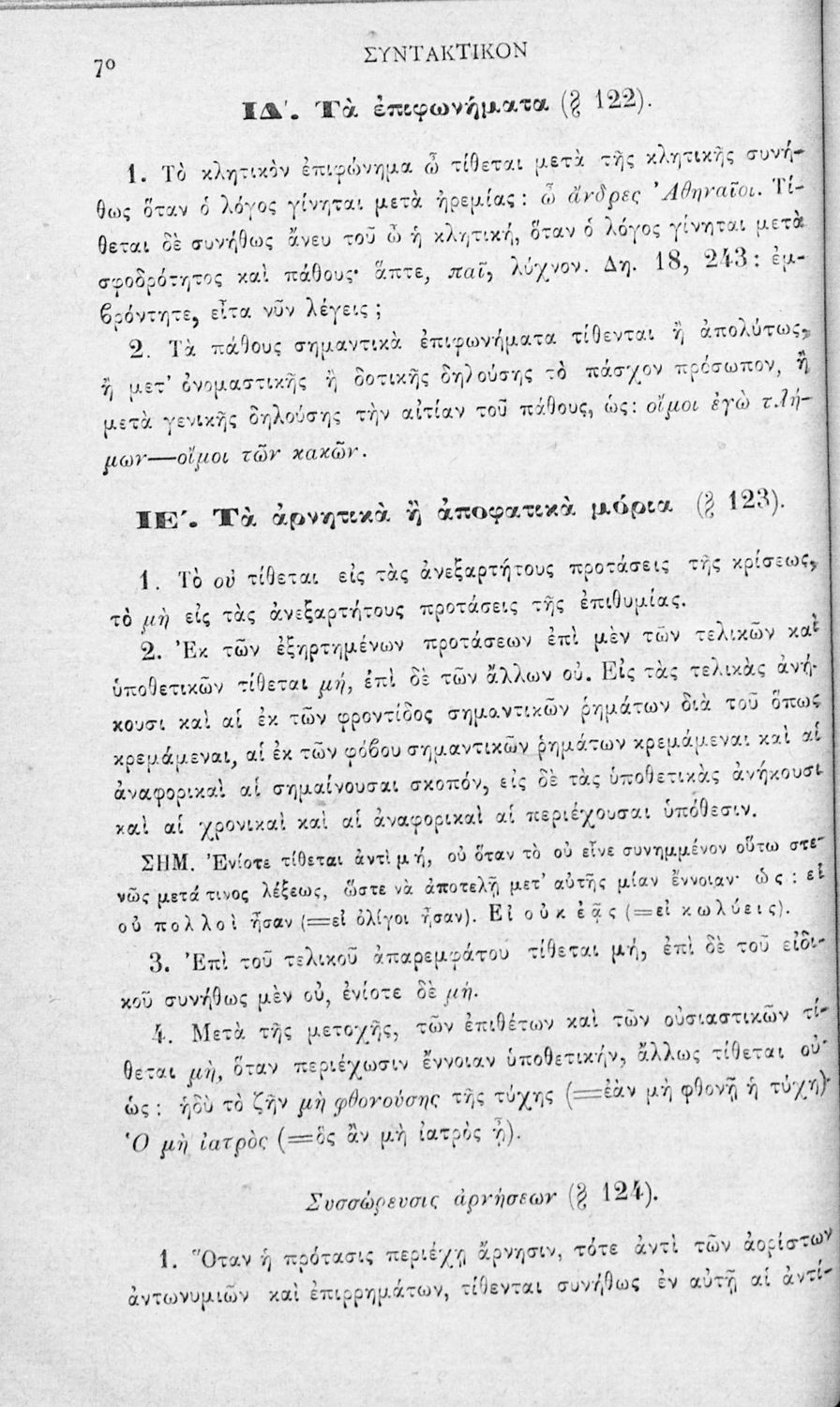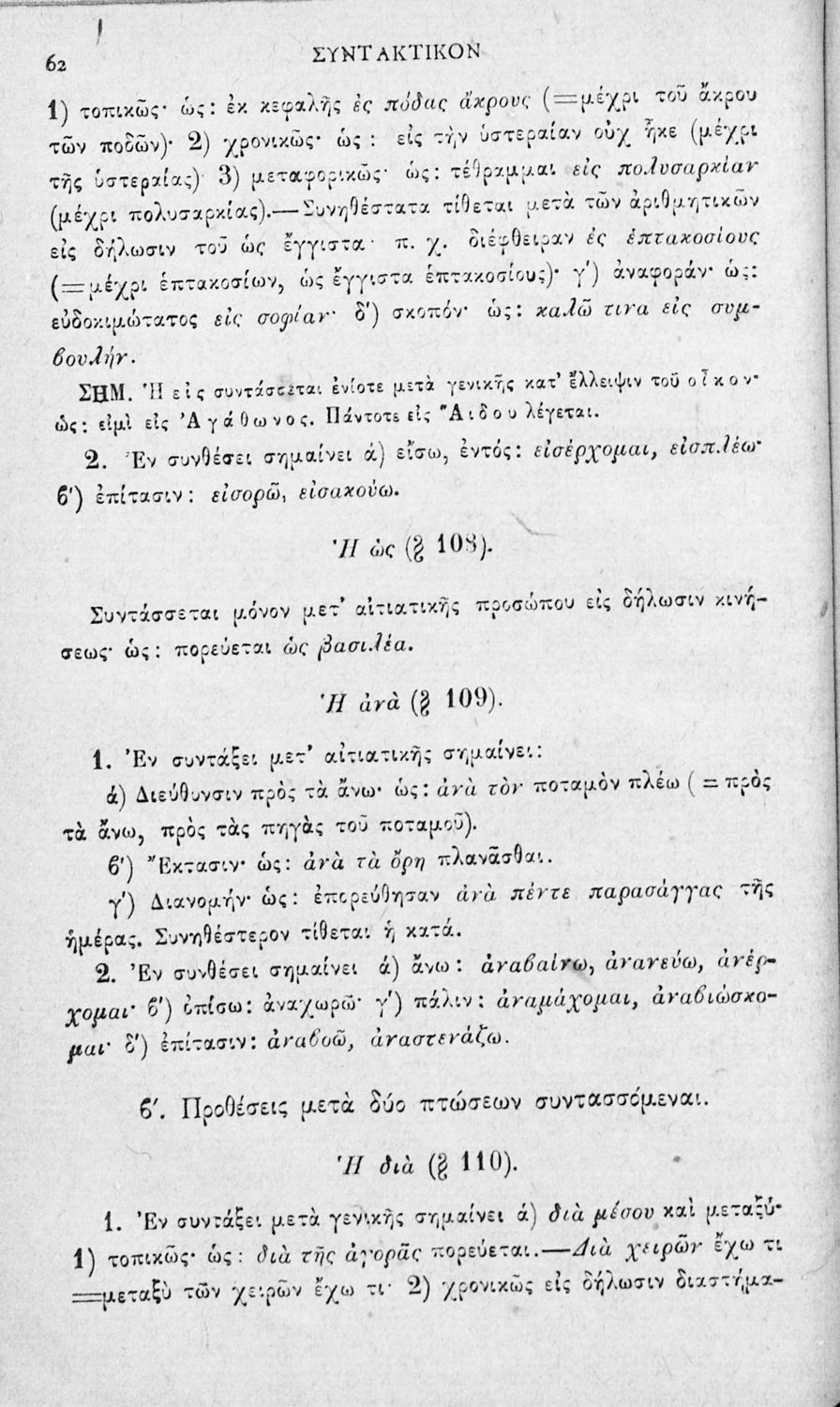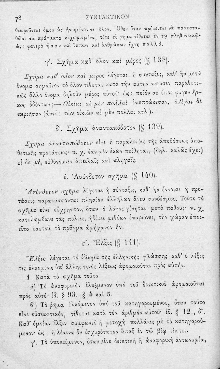 Σχολικό εγχειρίδιο Αρχαίων Ελληνικών για τα Ελληνικά Σχολεία και τα Ανώτερα Παρθεναγωγεία που εξετάζει τα μέρη του λόγου και την σύνταξή τους.