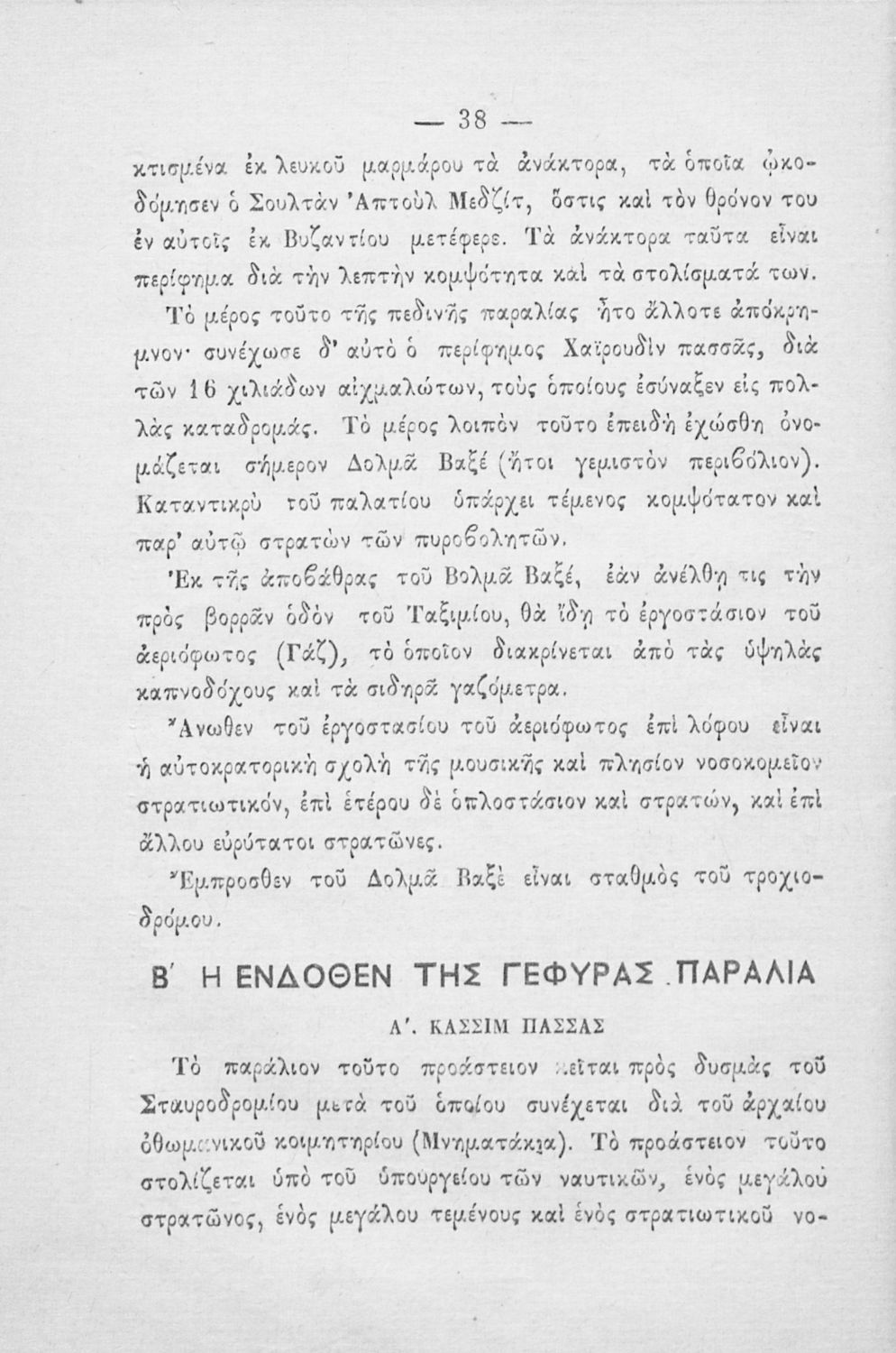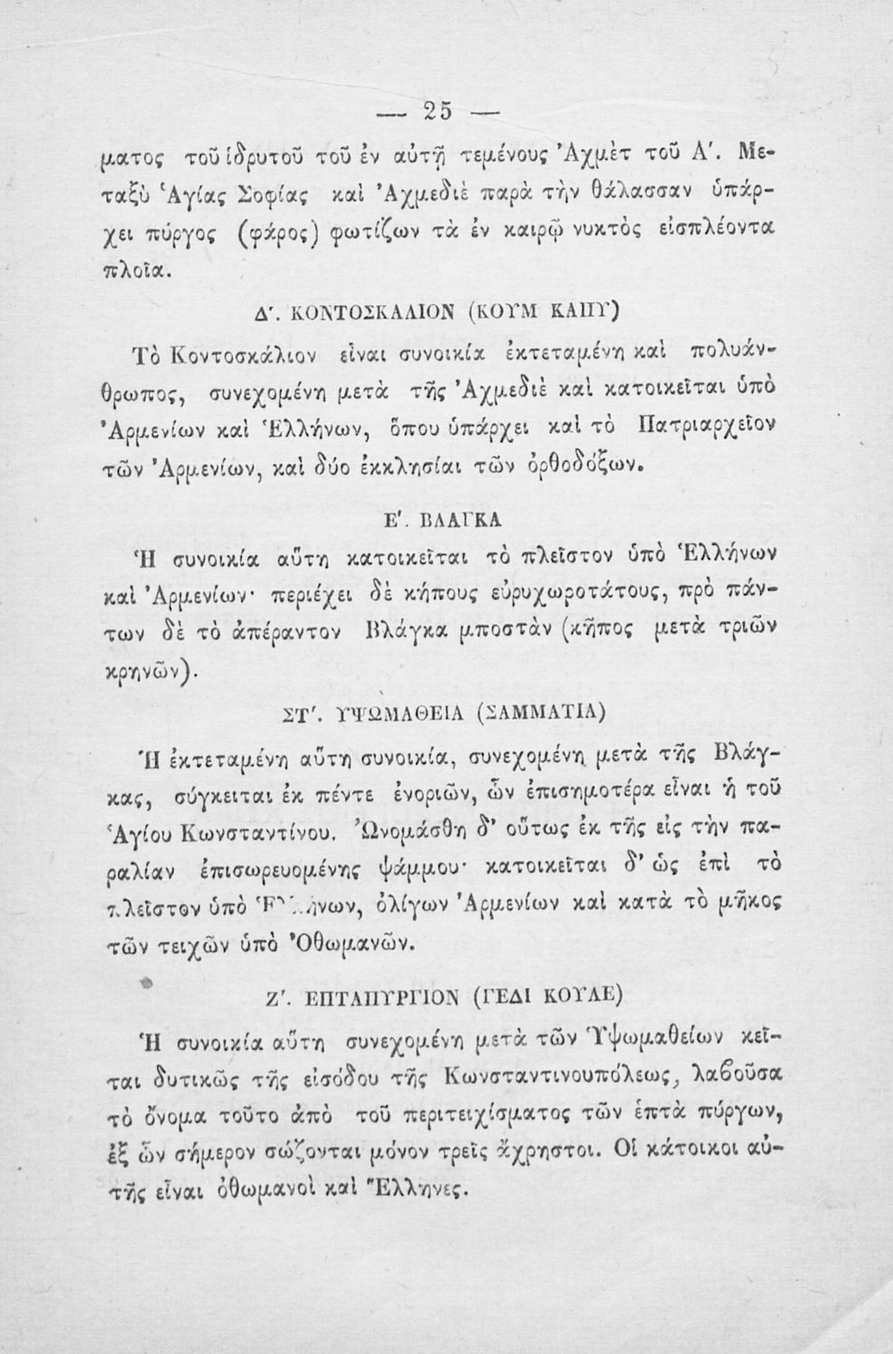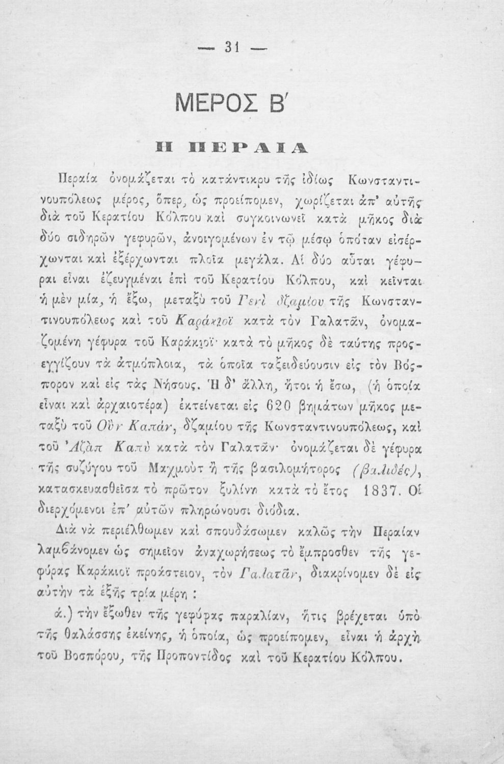 Σχολικό εγχειρίδιο Γεωγραφίας για τους μαθητές των Αστικών σχολείων της Κωνσταντινούπολης που εξετάζει το ιστορικό και γεωμορφολογικό προφίλ της Κωνσταντινούπολης. Περιέχει και στοιχεία οικονομικής γεωγραφίας.