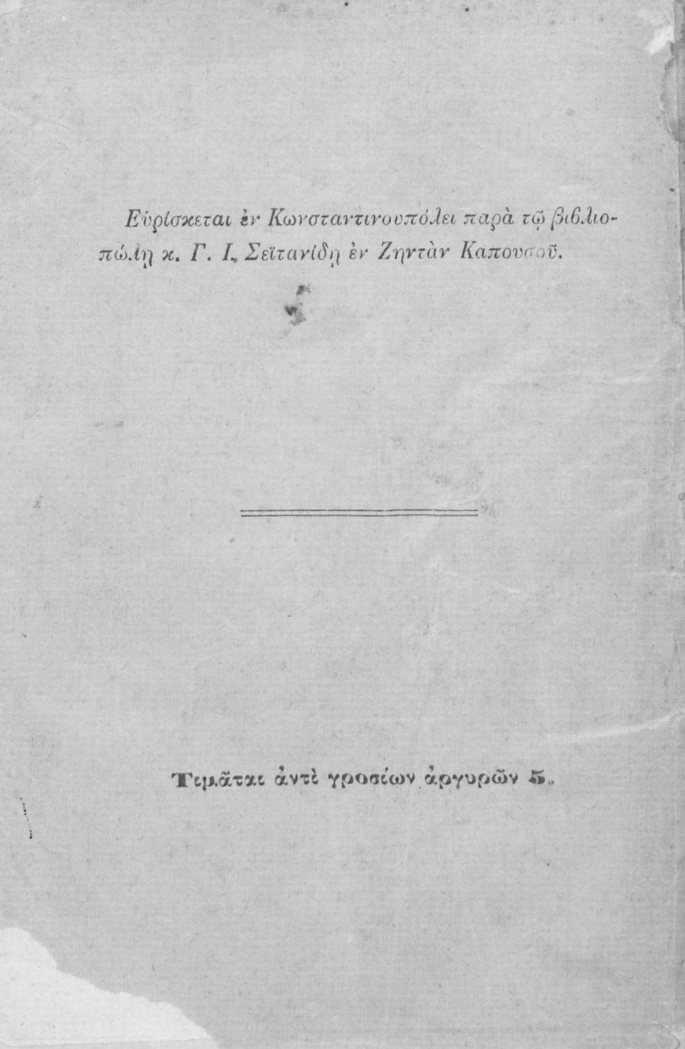 Εκδότης: Τυπογραφείο: Ν.Γ. Κεφαλίδης Έτος έκδοσης: 1886 Τόπος έκδοσης: Κωνσταντινούπολη Έκδοση: 4η |