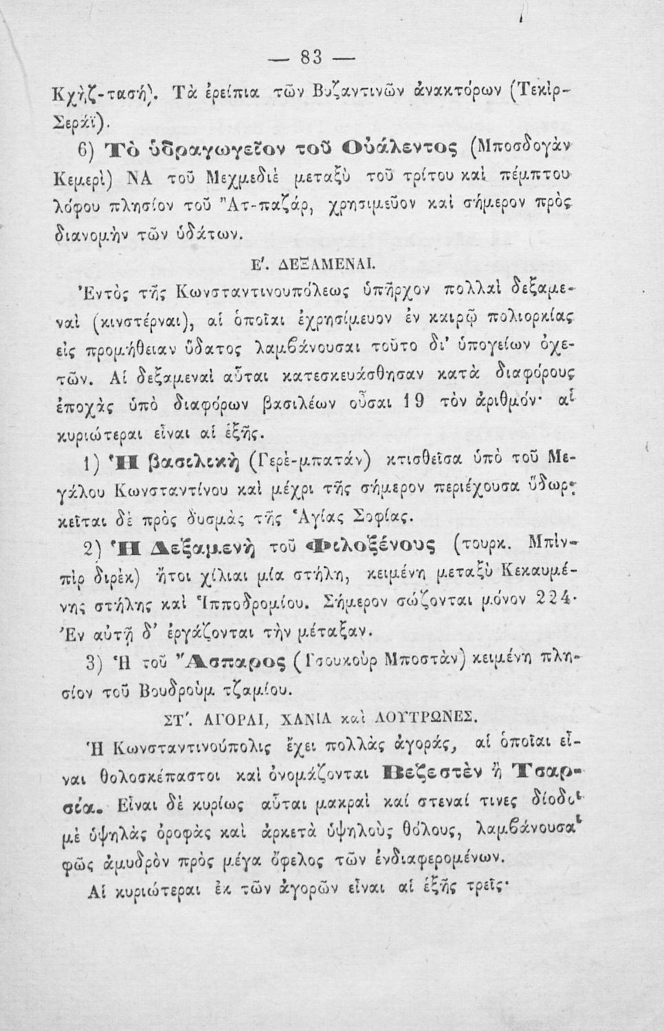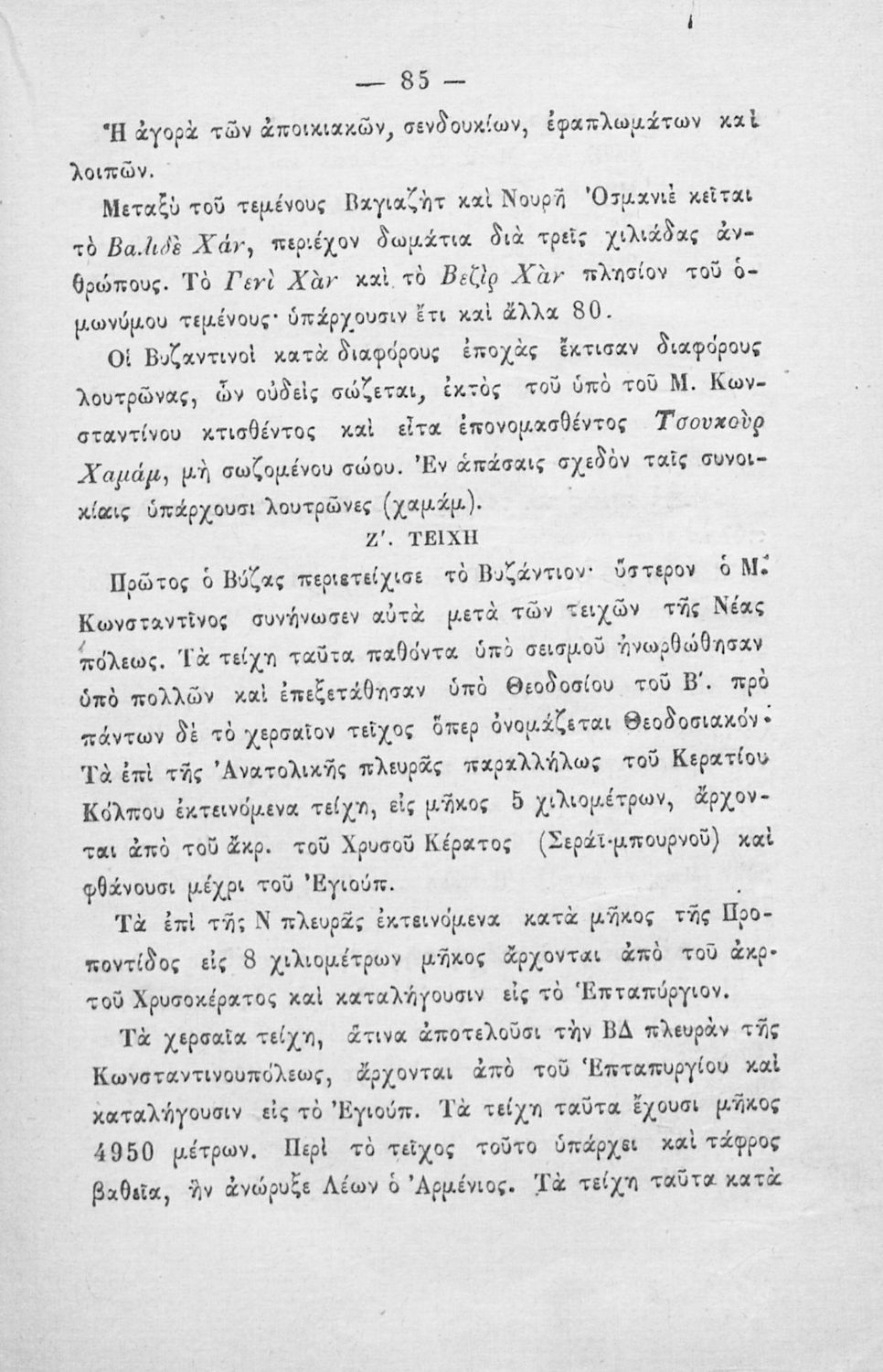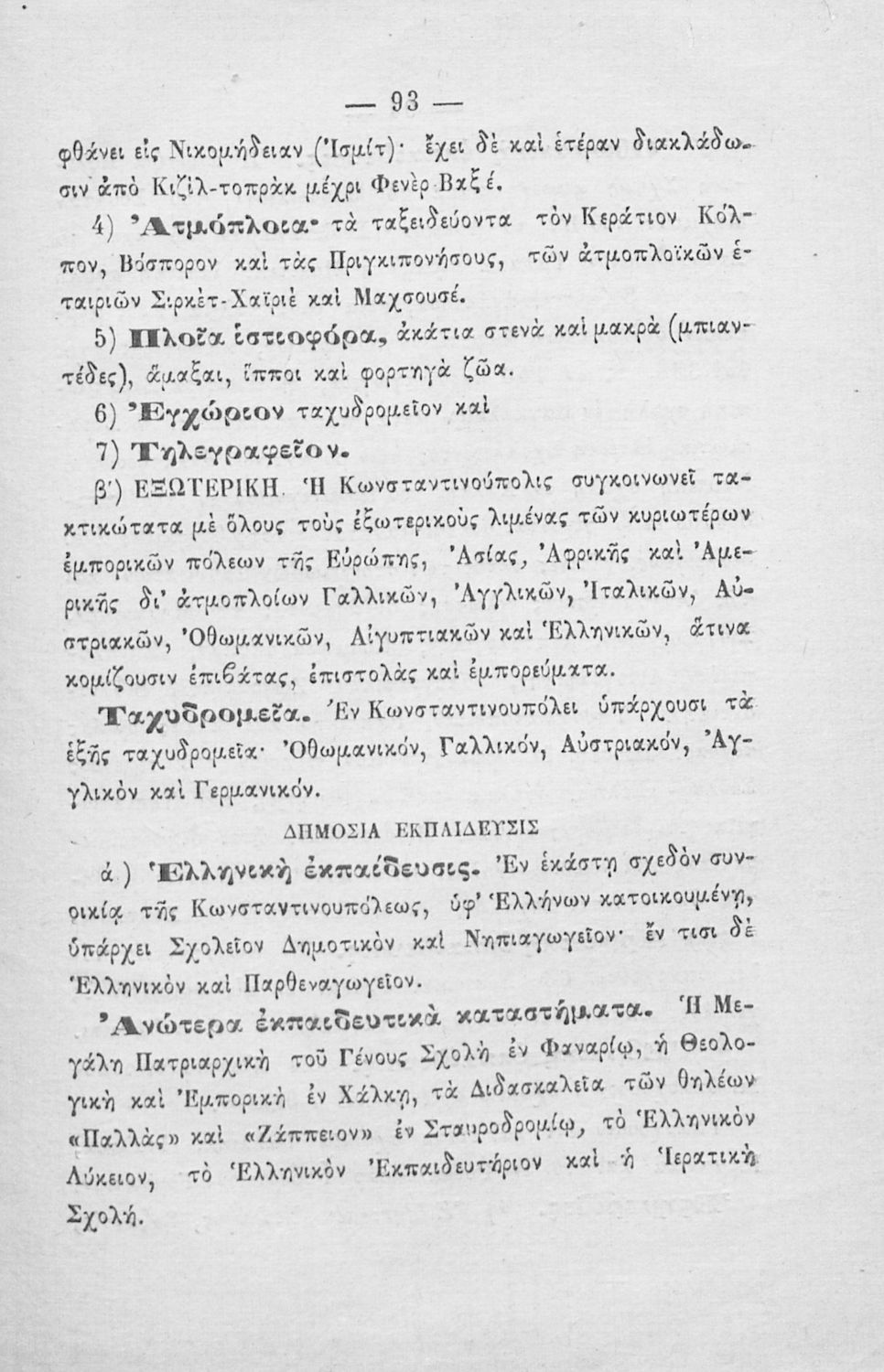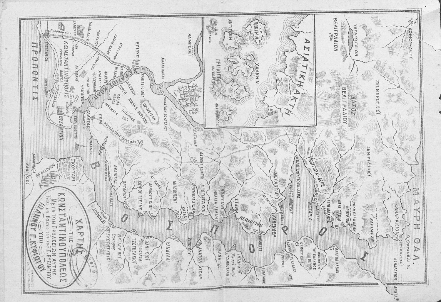 Σχολικό εγχειρίδιο Γεωγραφίας για τους μαθητές των Αστικών σχολείων της Κωνσταντινούπολης που εξετάζει το ιστορικό και γεωμορφολογικό προφίλ της Κωνσταντινούπολης. Περιέχει και στοιχεία οικονομικής γεωγραφίας.
