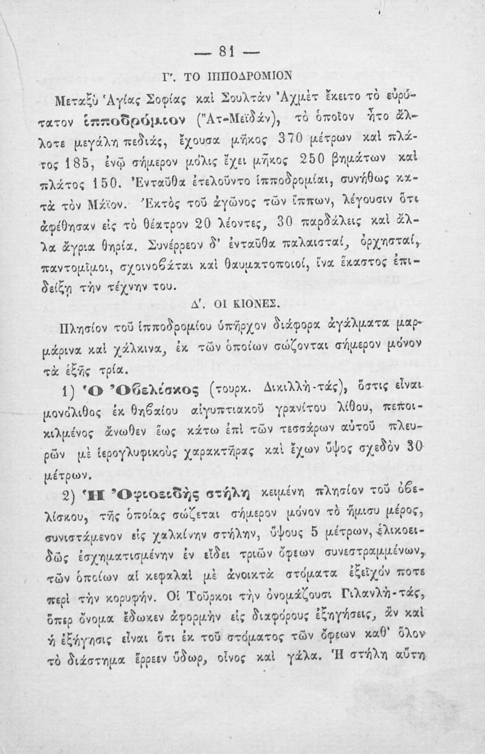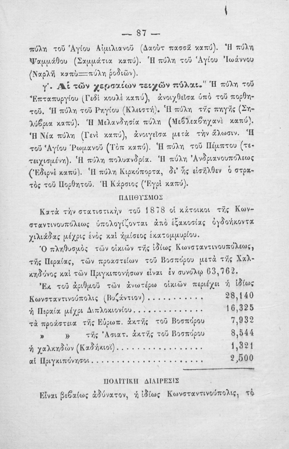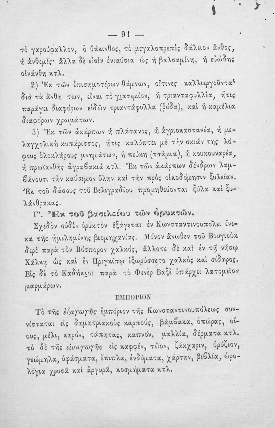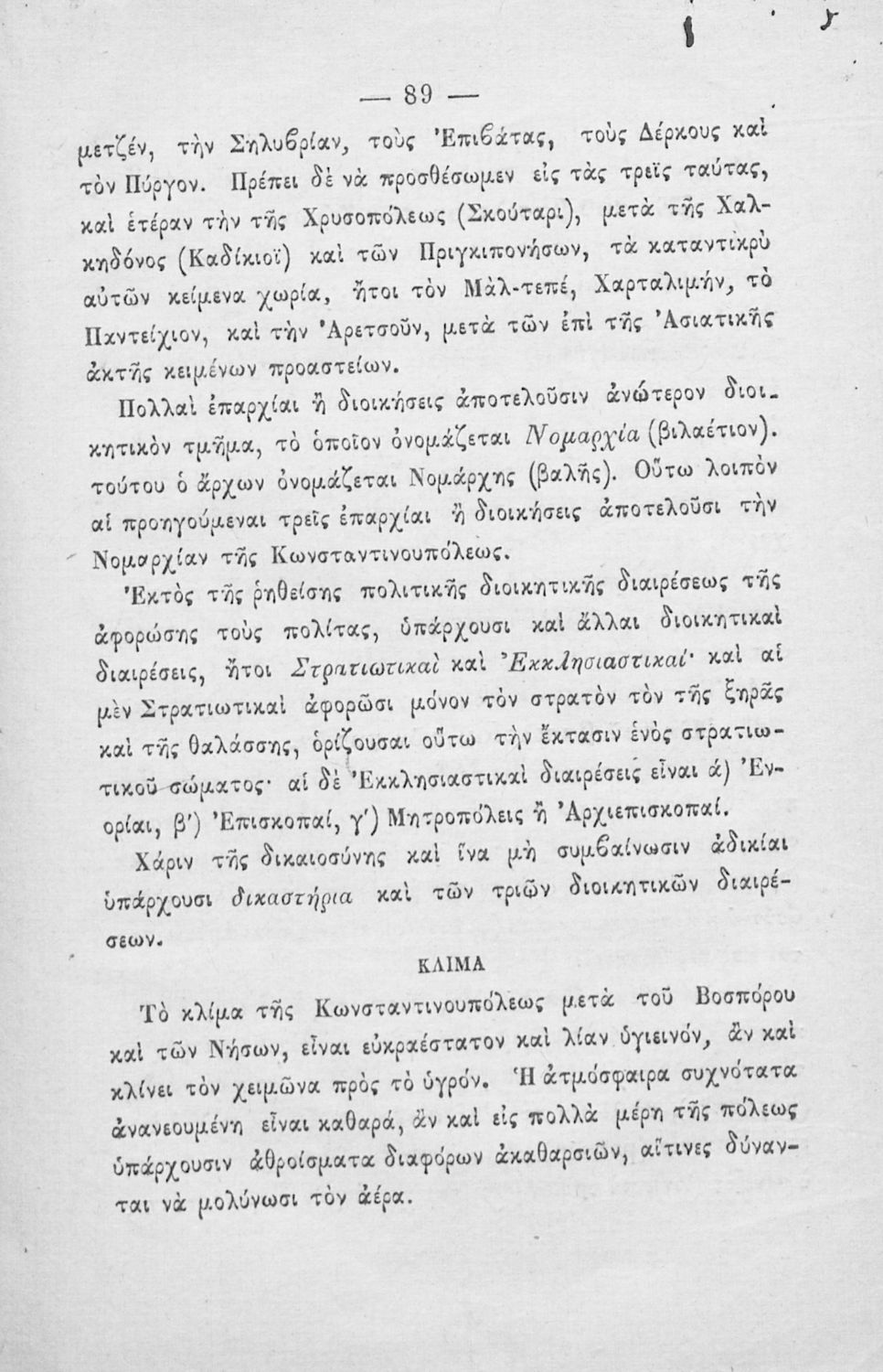 Σχολικό εγχειρίδιο Γεωγραφίας για τους μαθητές των Αστικών σχολείων της Κωνσταντινούπολης που εξετάζει το ιστορικό και γεωμορφολογικό προφίλ της Κωνσταντινούπολης. Περιέχει και στοιχεία οικονομικής γεωγραφίας.