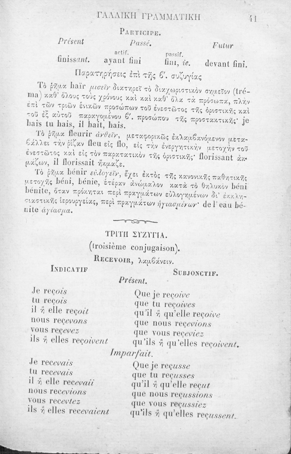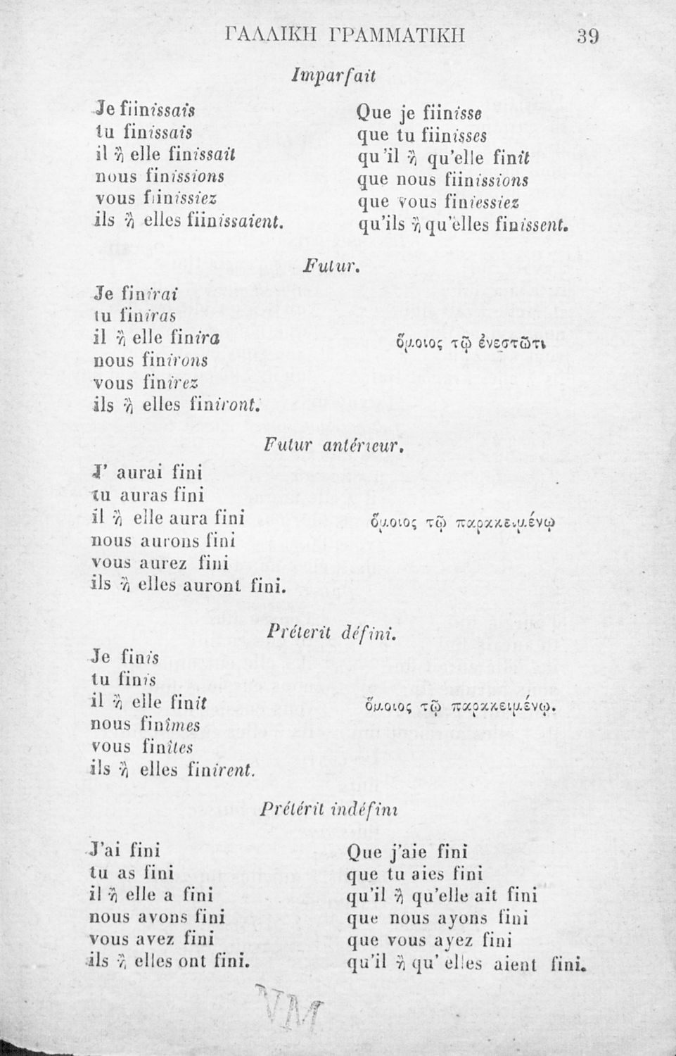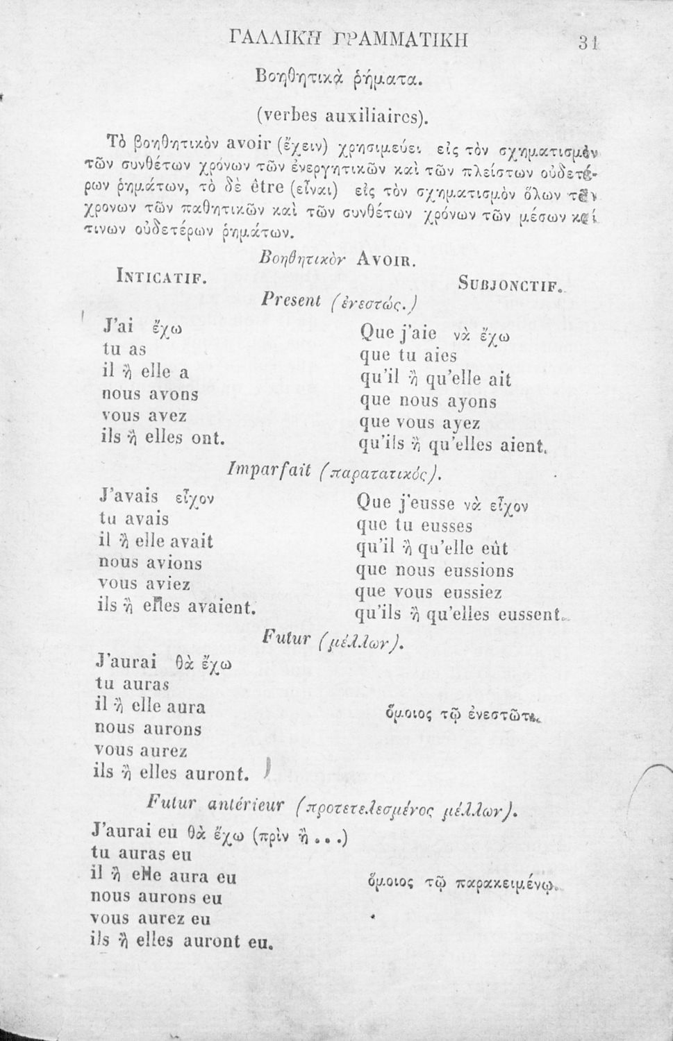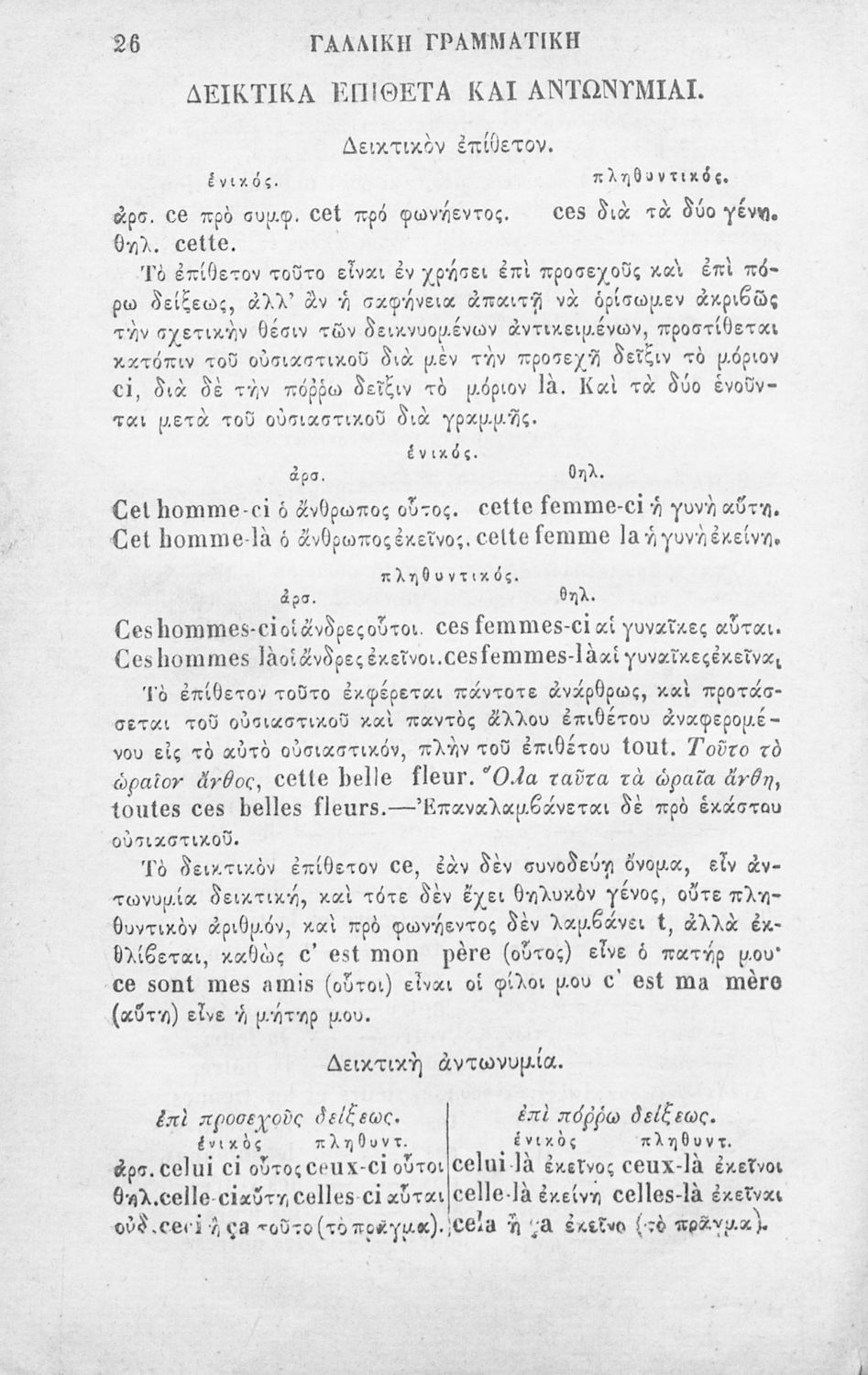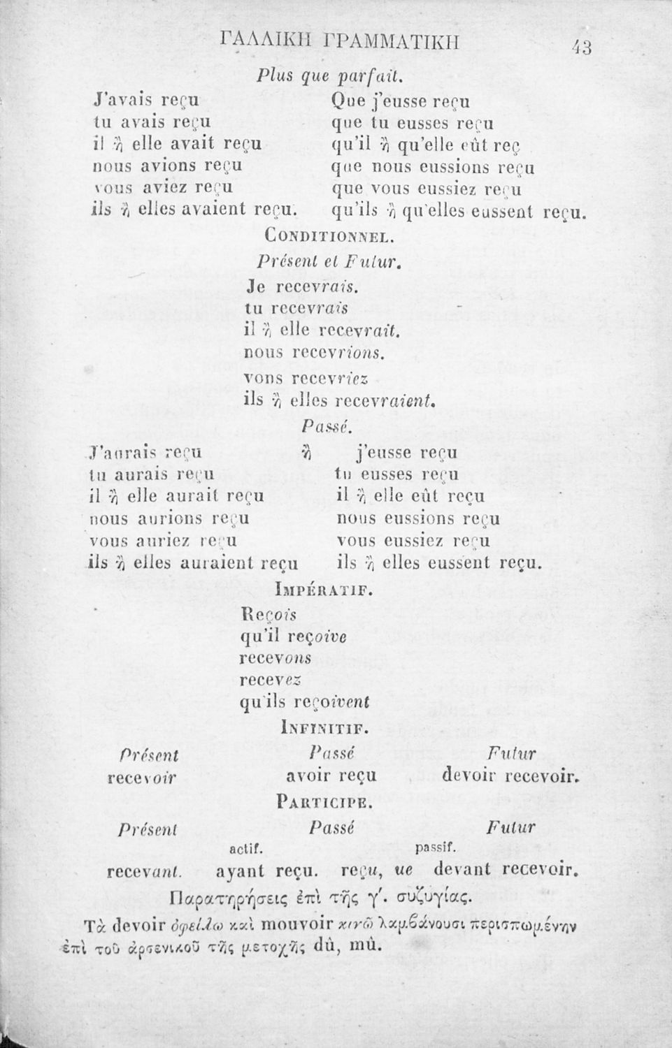 Γραμματική της γαλλικής γλώσσας για τους μαθητές των Ελληνικών σχολείων. Στο εγχειρίδιο παρουσιάζονται τα διάφορα μέρη του λόγου και η σωστή χρήση τους στις προτάσεις.