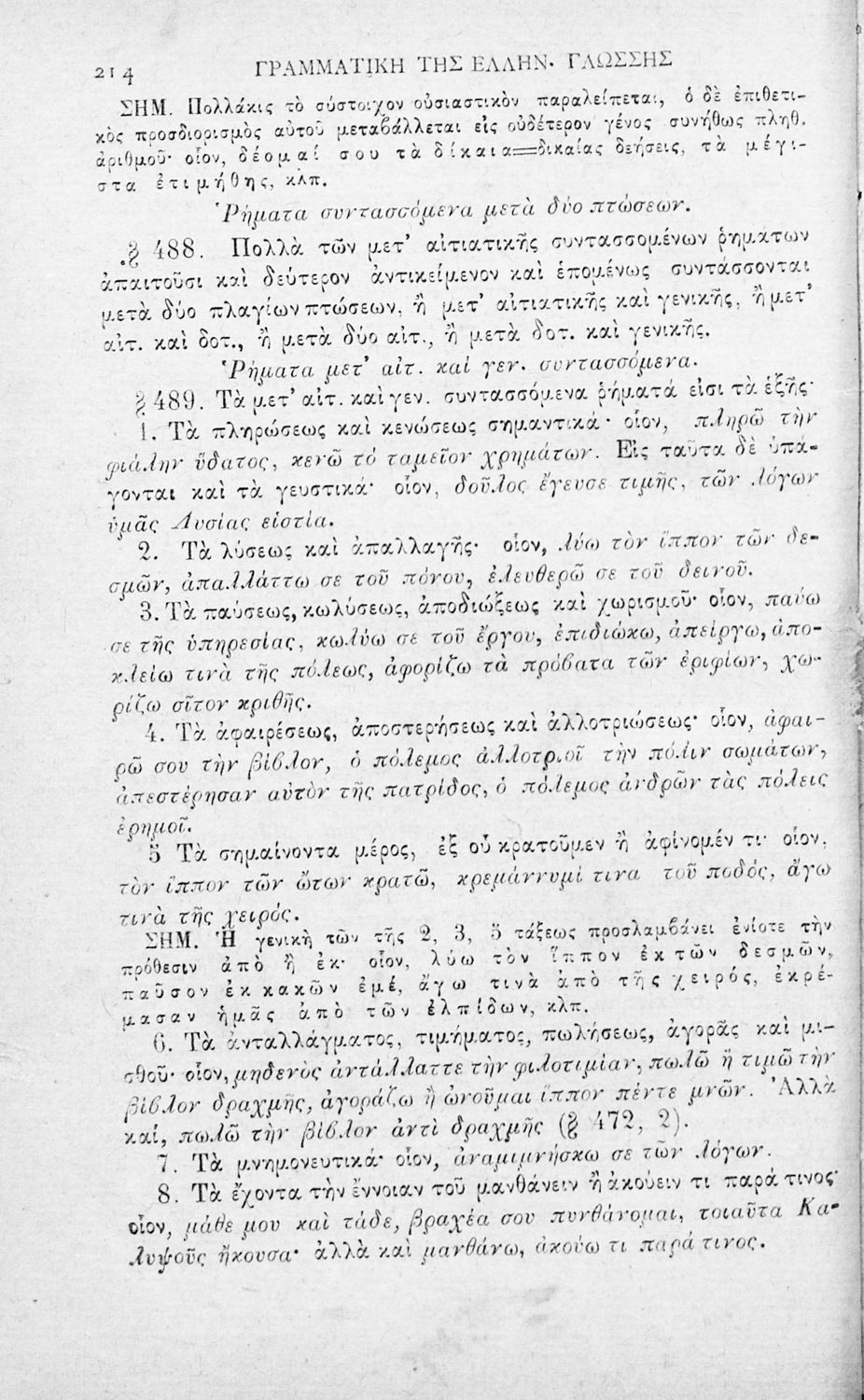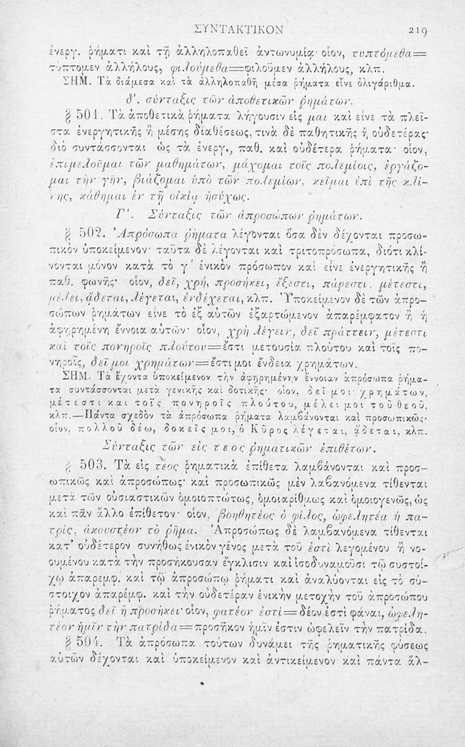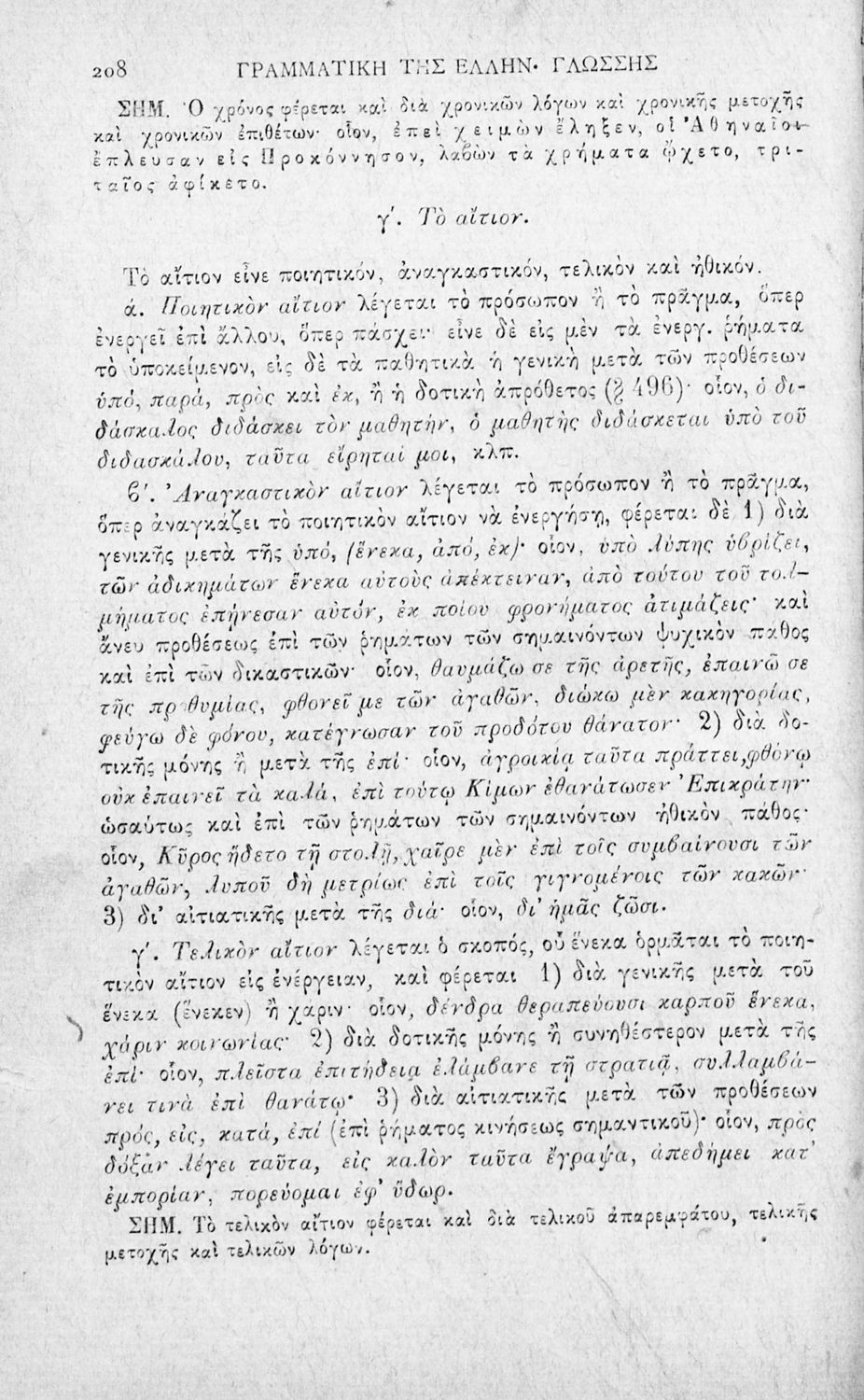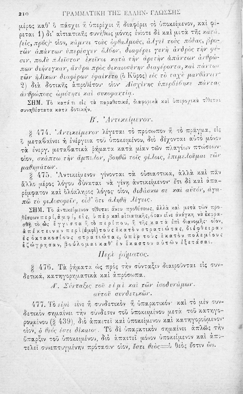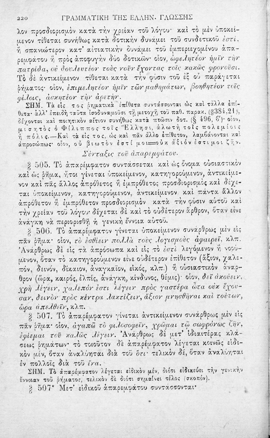Σχολικό εγχειρίδιο Αρχαίων Ελληνικών για τα Ελληνικά Σχολεία, Παρθεναγωγεία και Γυμνάσια που περιέχει τους κανόνες γραμματικής και είναι χωρισμένο σε φθογγολογικό, τυπολογικό και ετυμολογικό μέρος.