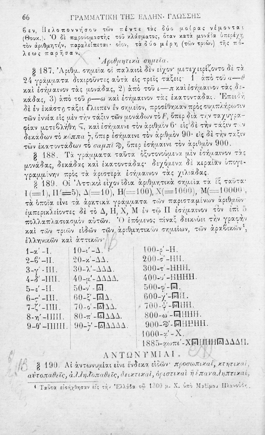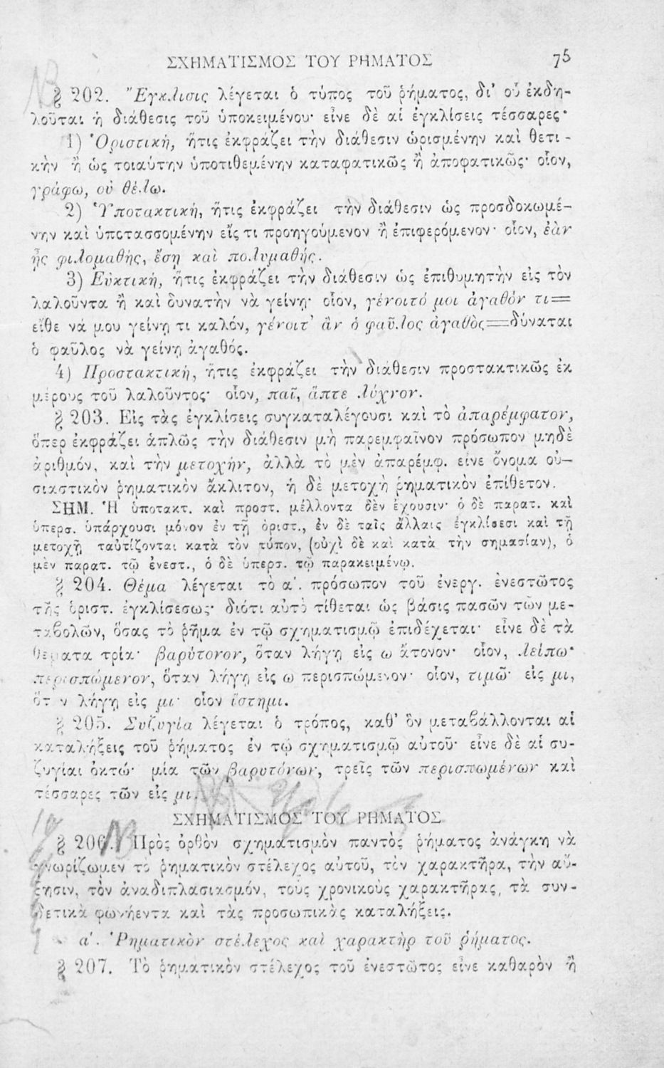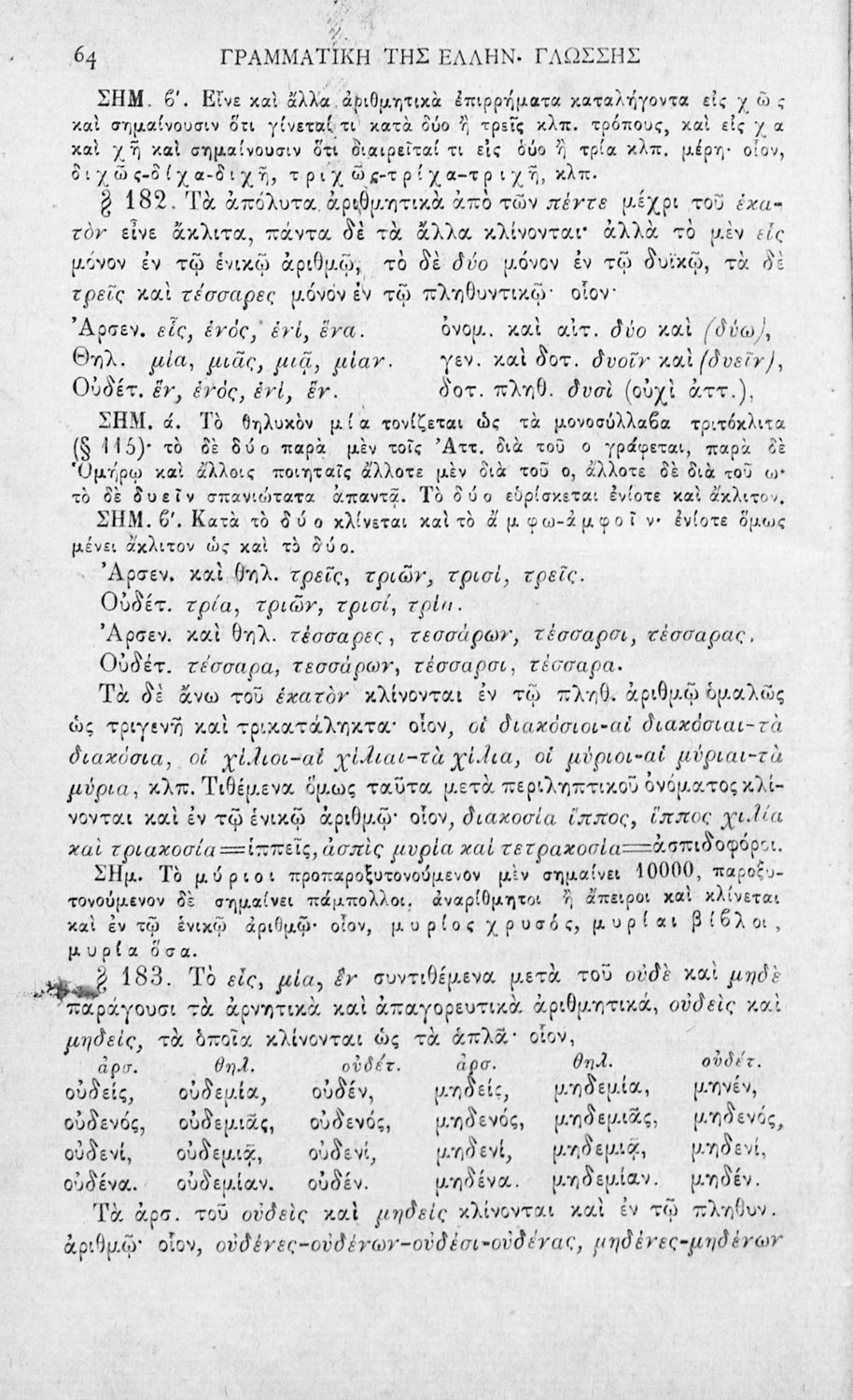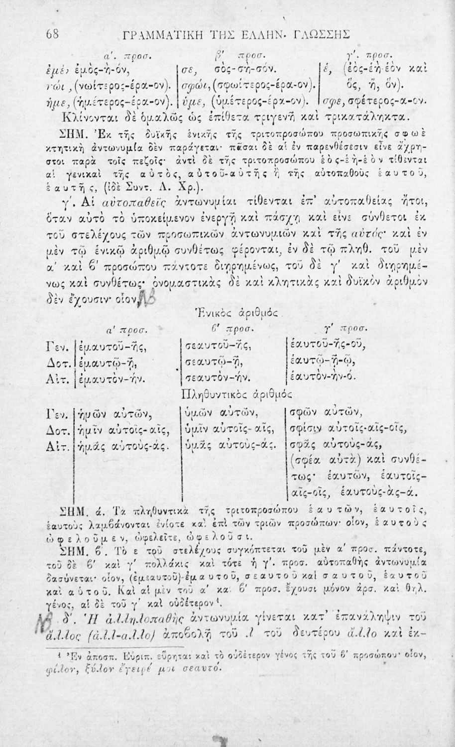 Σχολικό εγχειρίδιο Αρχαίων Ελληνικών για τα Ελληνικά Σχολεία, Παρθεναγωγεία και Γυμνάσια που περιέχει τους κανόνες γραμματικής και είναι χωρισμένο σε φθογγολογικό, τυπολογικό και ετυμολογικό μέρος.