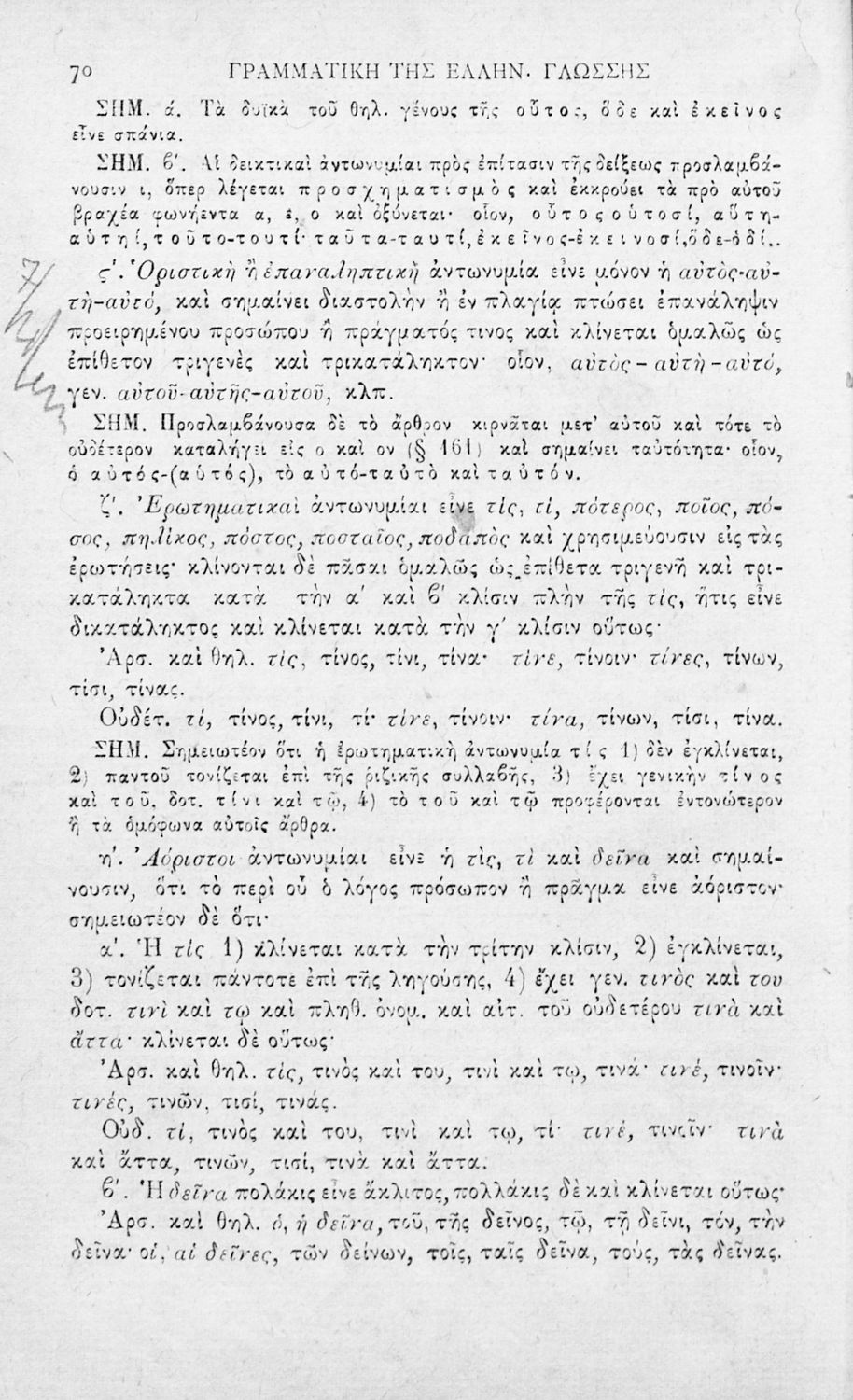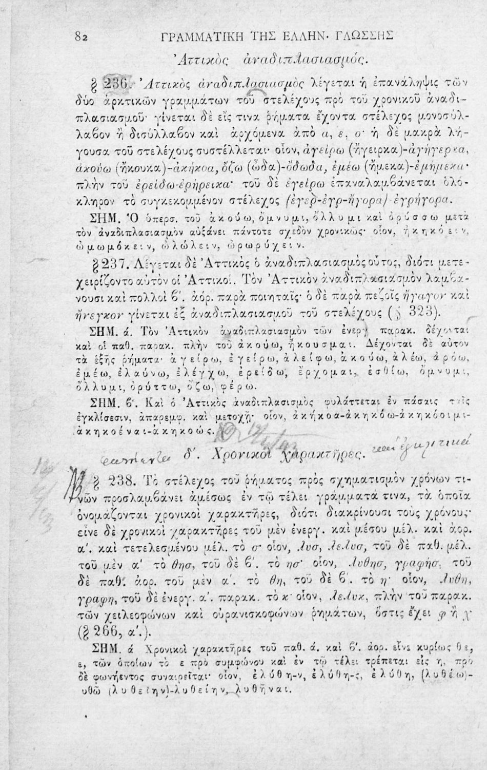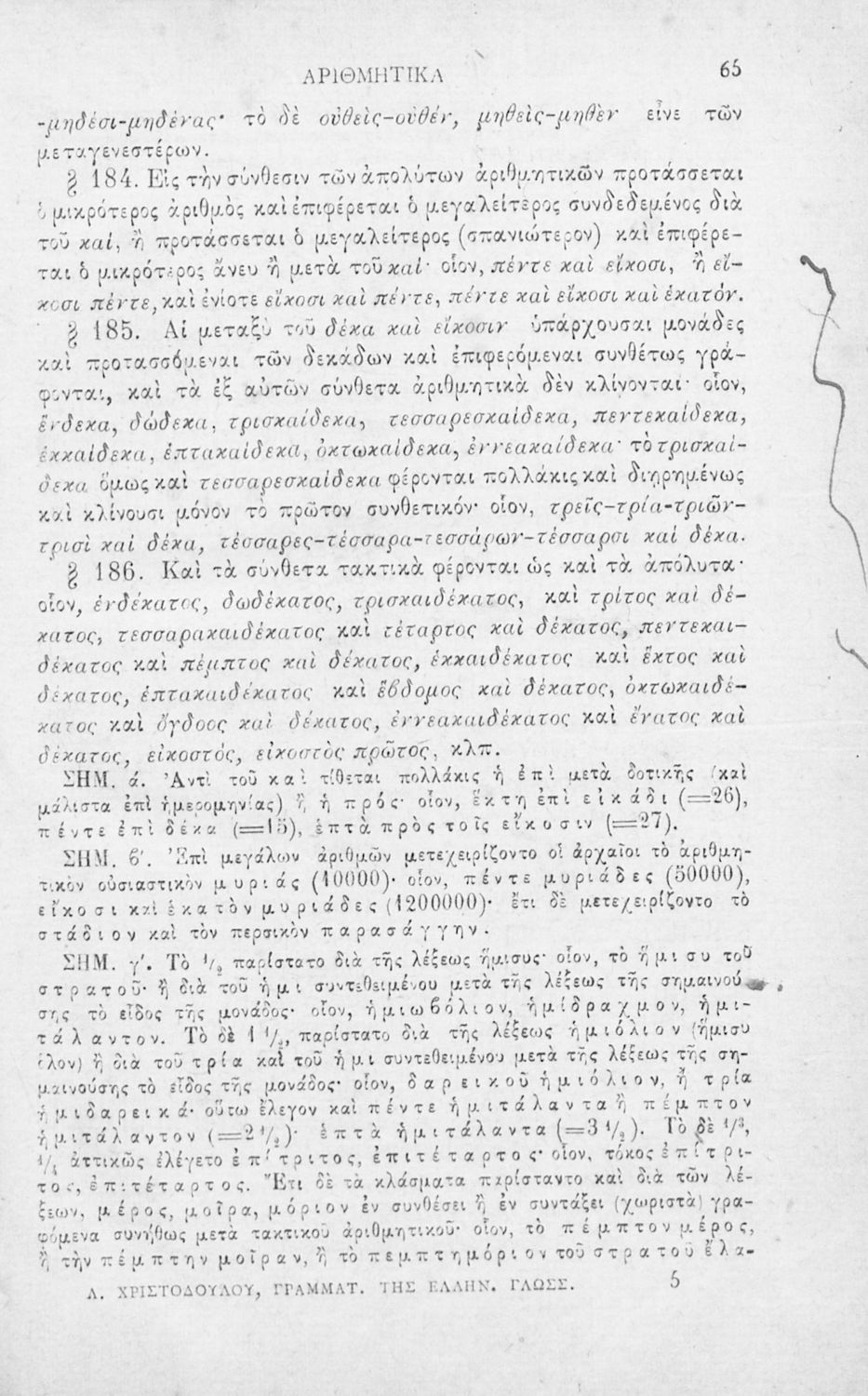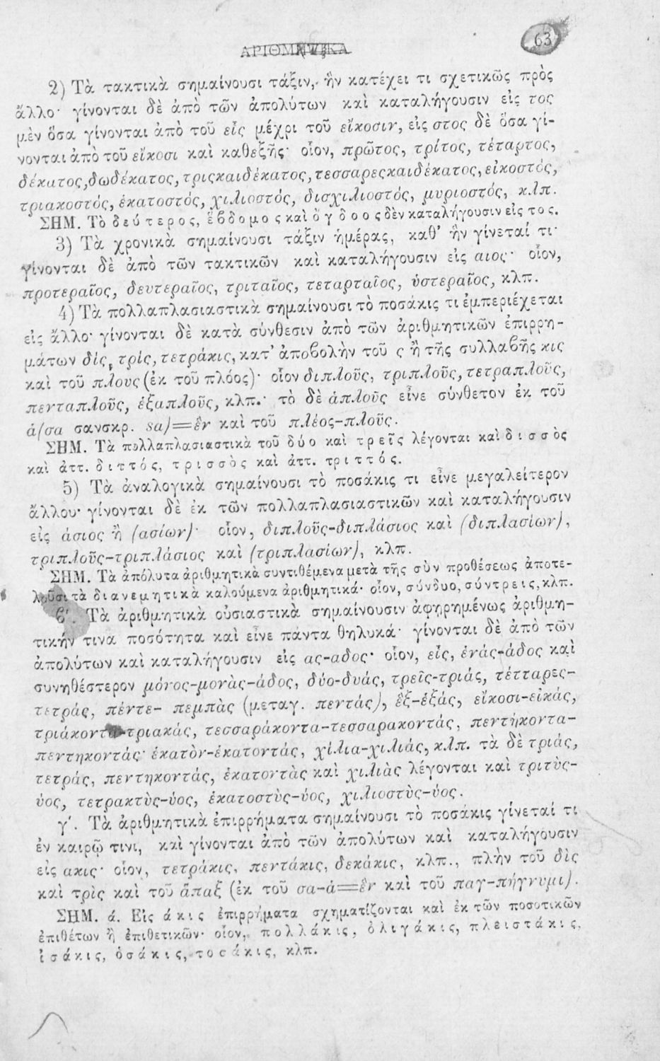 Σχολικό εγχειρίδιο Αρχαίων Ελληνικών για τα Ελληνικά Σχολεία, Παρθεναγωγεία και Γυμνάσια που περιέχει τους κανόνες γραμματικής και είναι χωρισμένο σε φθογγολογικό, τυπολογικό και ετυμολογικό μέρος.